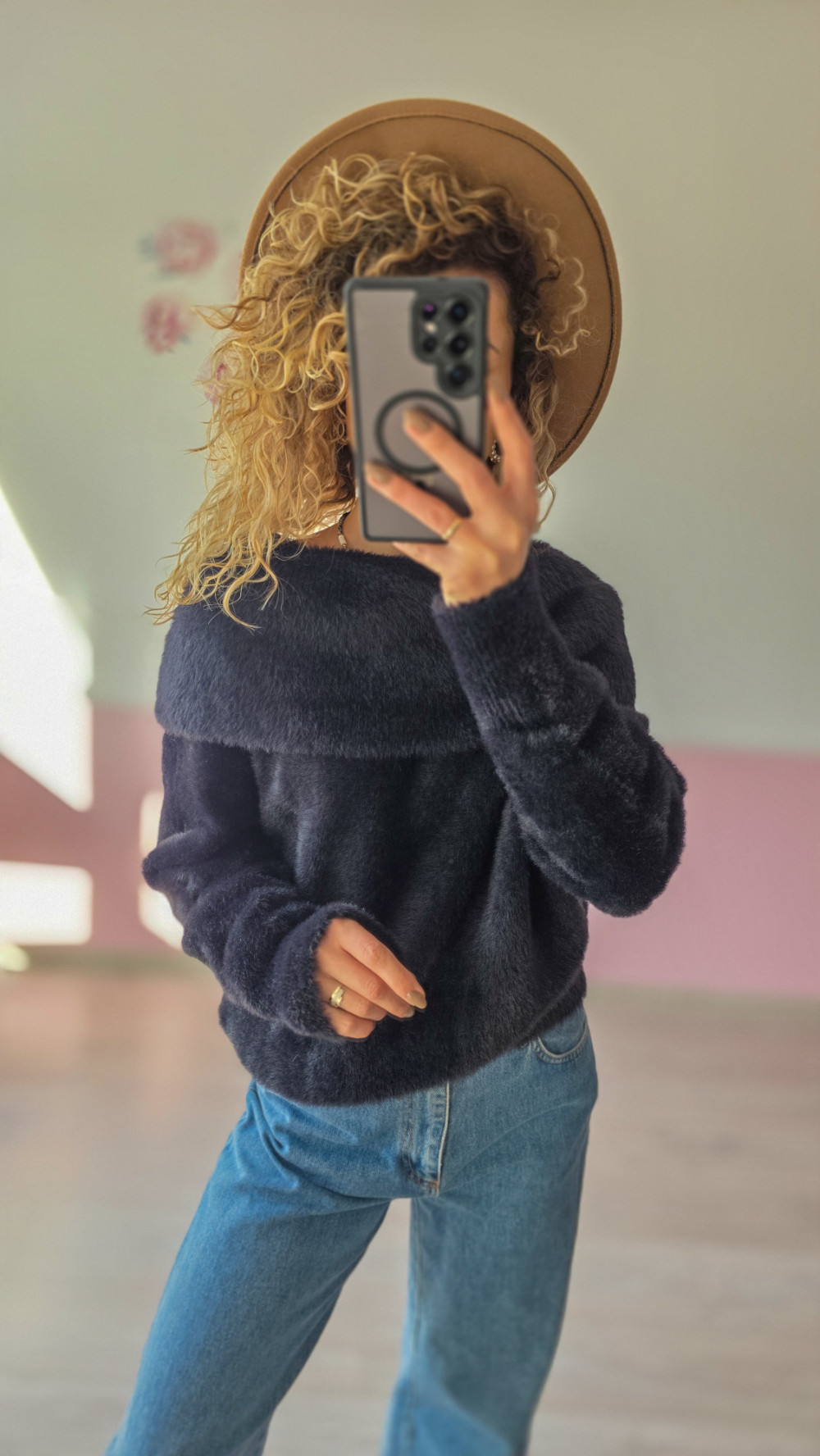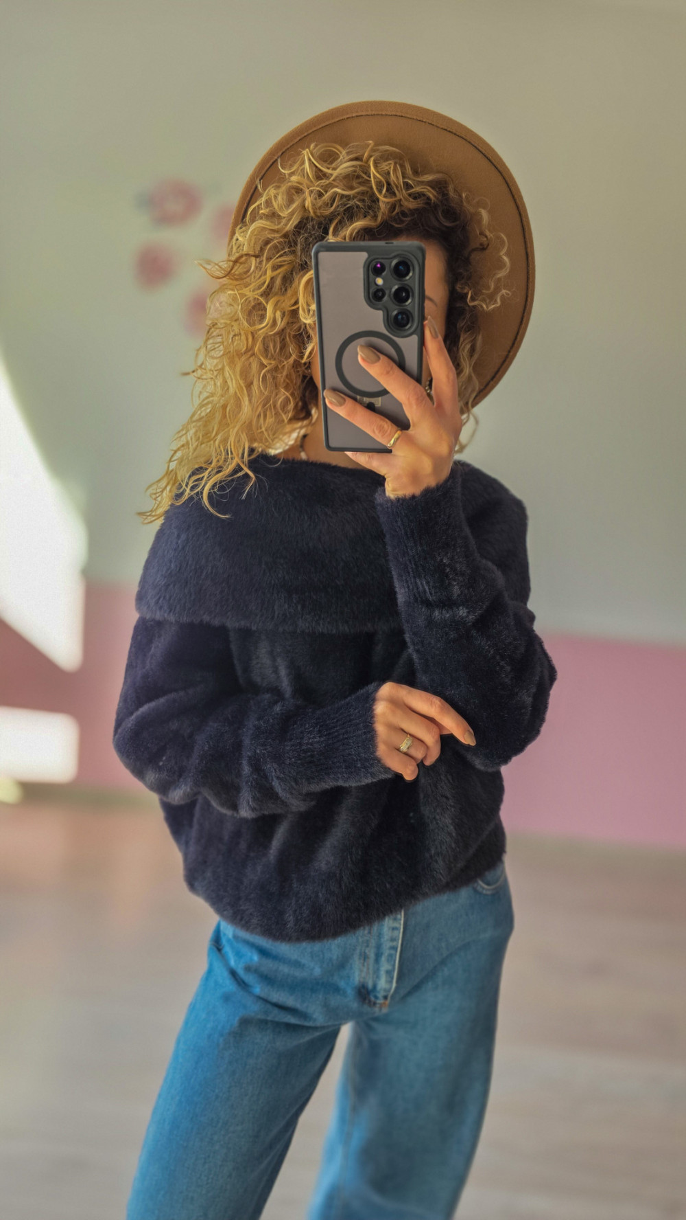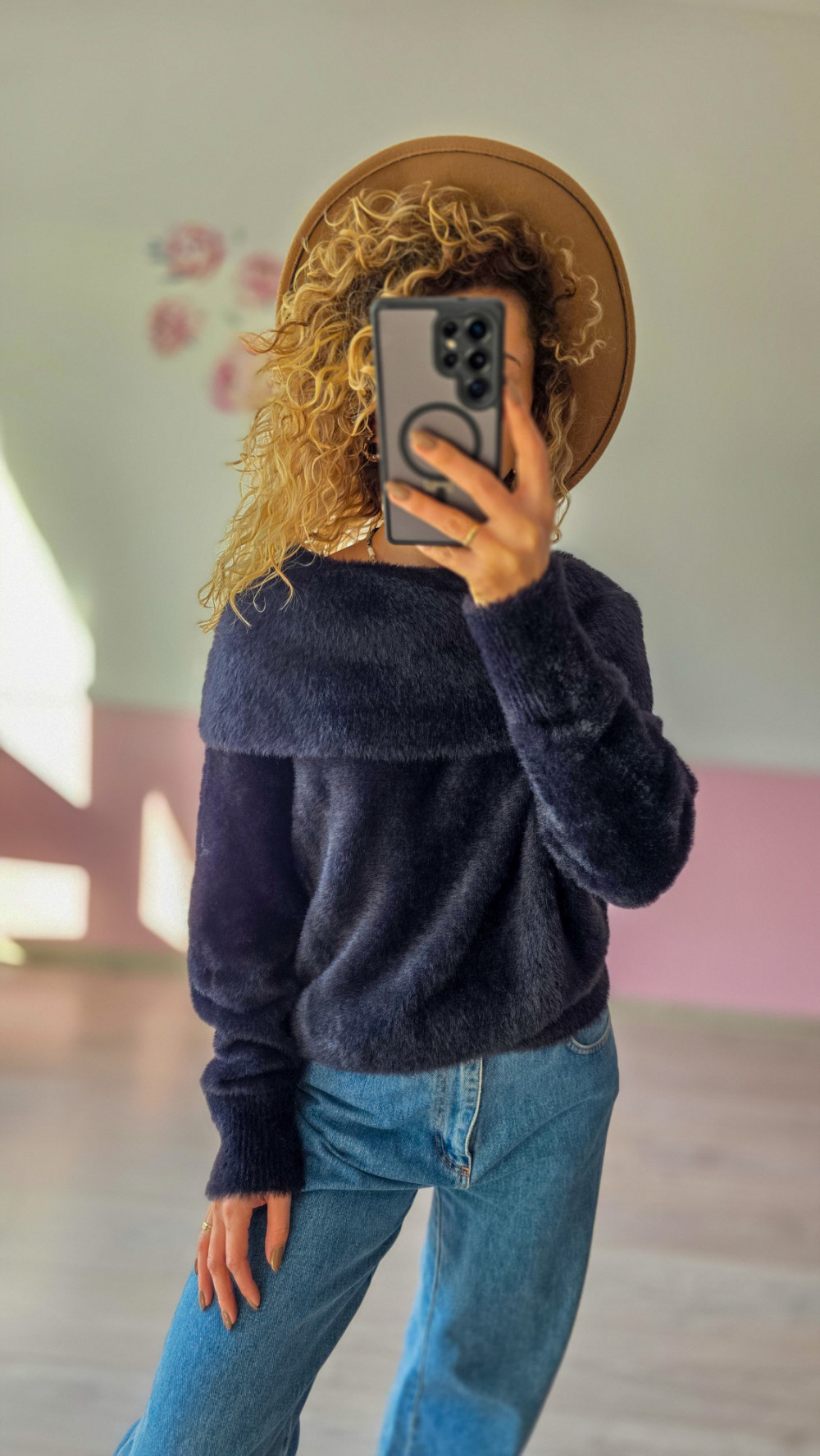 Czarno-granatowy, puszysty sweter z szerokim kołnierzem
