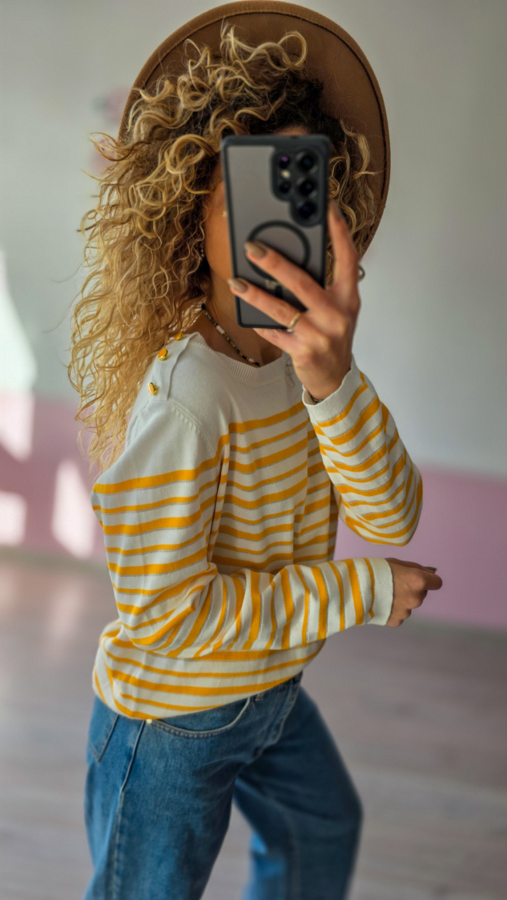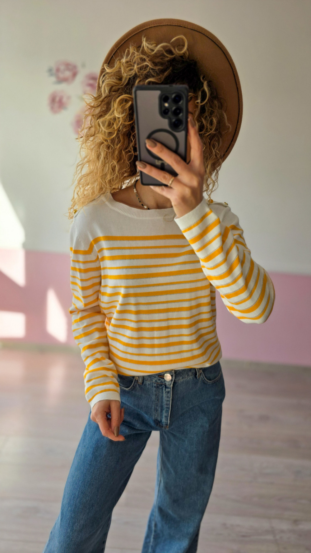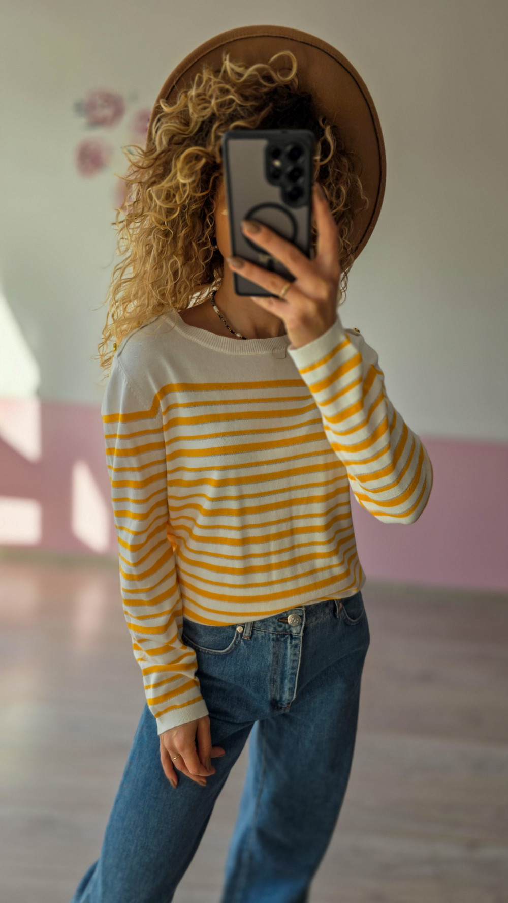 Energetyczny i lekki sweter damski w żółte paski to świetna propozycja dla kobiet, które lubią połączenie minimalizmu z nutą koloru. Delikatna dzianina zapewnia wygodę przez cały dzień, a klasyczny prosty krój sprawia, że sweter idealnie pasuje do jeansów, chinosów i casualowych stylizacji. To idealny model na wiosnę, lato i wczesną jesień — sprawi, że każda stylizacja nabierze świeżości i radosnego charakteru.