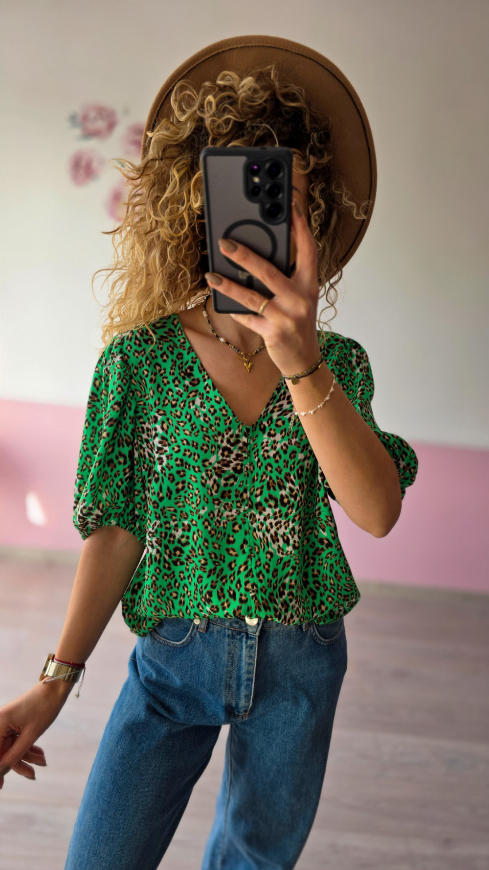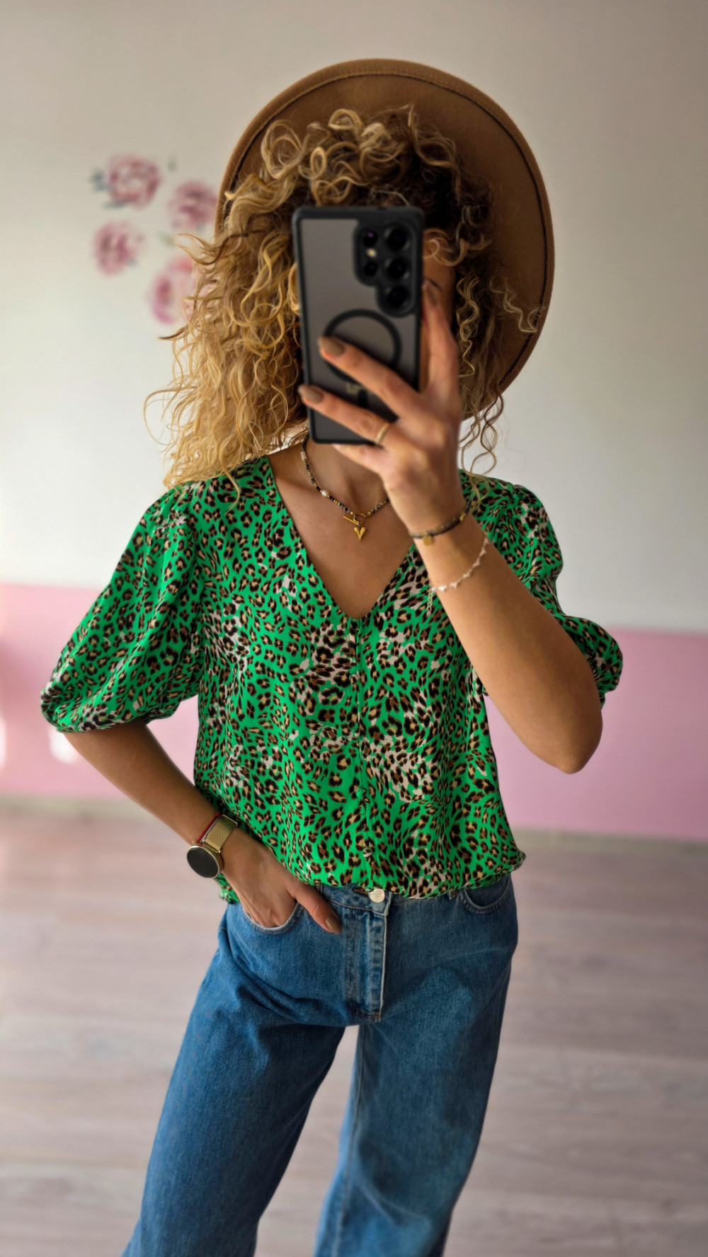 Wyrazista i pełna charakteru zielona bluzka damska w panterkę to świetna propozycja dla kobiet, które lubią mocne akcenty w stylizacjach. Lekki, przewiewny materiał pięknie układa się na sylwetce, a dekolt w serek wysmukla optycznie szyję. Bufiaste rękawki dodają całości modnego, kobiecego charakteru. Ta bluzka idealnie sprawdzi się zarówno na co dzień, jak i na imprezę czy wieczorne spotkania. Zestawisz ją z jeansami, czarnymi spodniami lub spódnicą — zawsze wygląda spektakularnie.