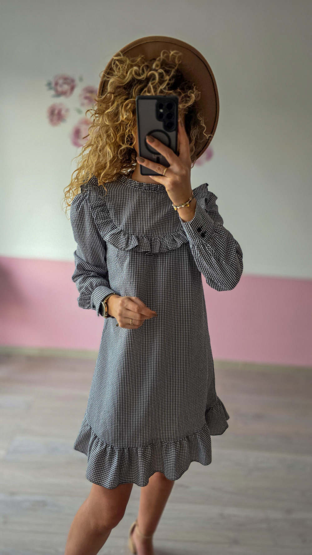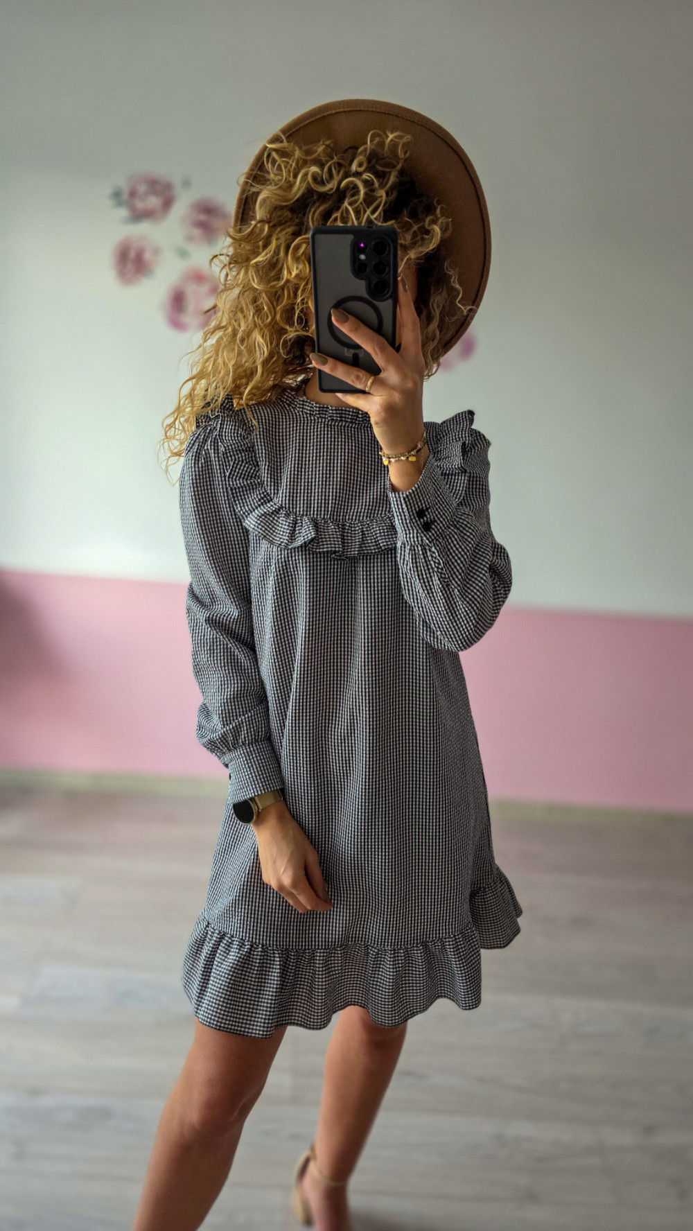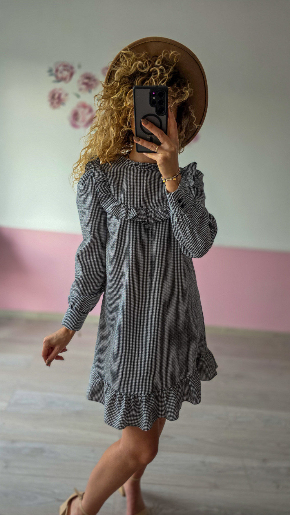 Urocza sukienka w czarno-białą kratkę z falbankami to model, który zachwyca lekkością i dziewczęcym wdziękiem. Falbany przy ramionach oraz na dole dodają jej subtelnej objętości, tworząc romantyczny charakter. Długi rękaw czyni ją doskonałym wyborem na chłodniejsze dni – zarówno do pracy, szkoły, jak i na spotkania z przyjaciółmi. To propozycja dla kobiet, które lubią czuć się stylowo bez wysiłku. Świetnie prezentuje się z botkami, kozakami lub eleganckimi sandałkami.