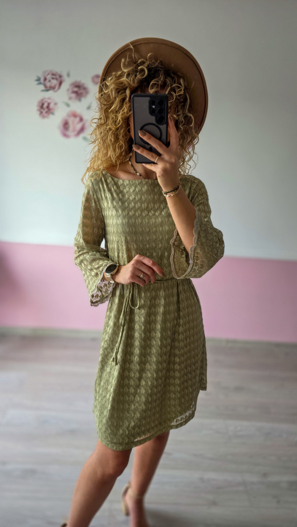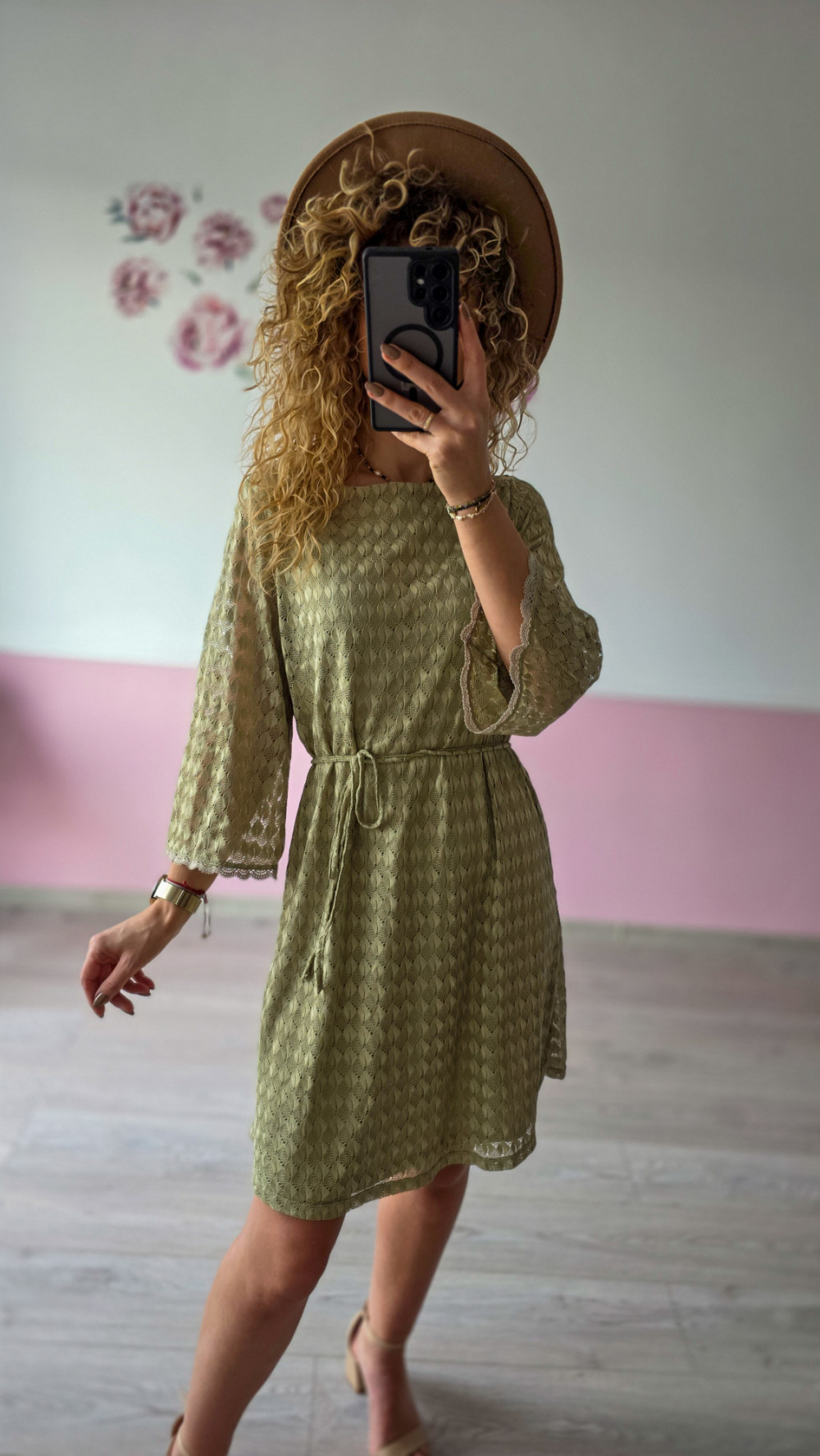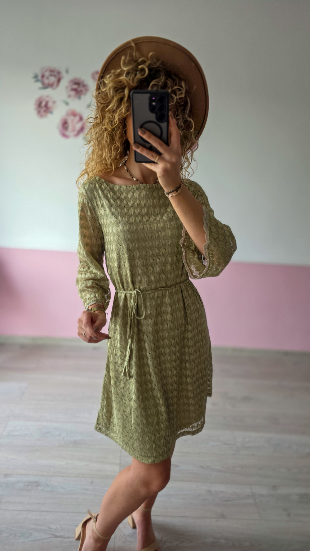 Sukienka koronkowa z paskiem – oliwkowa S/M