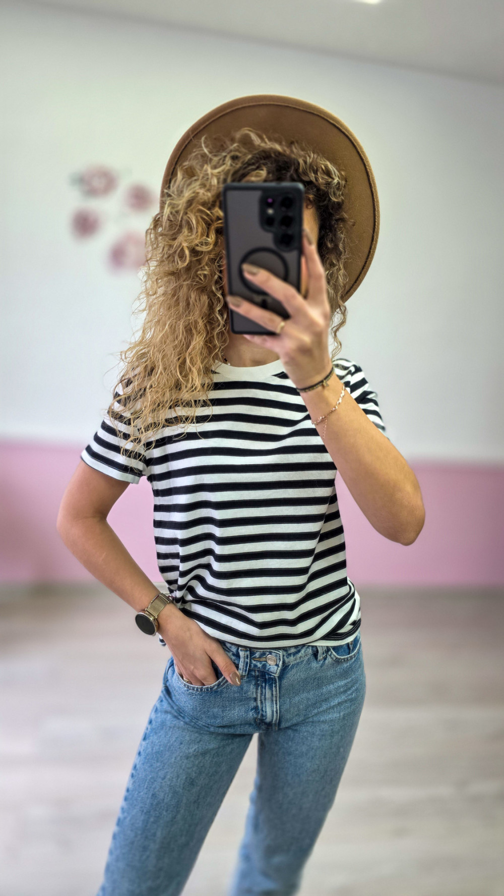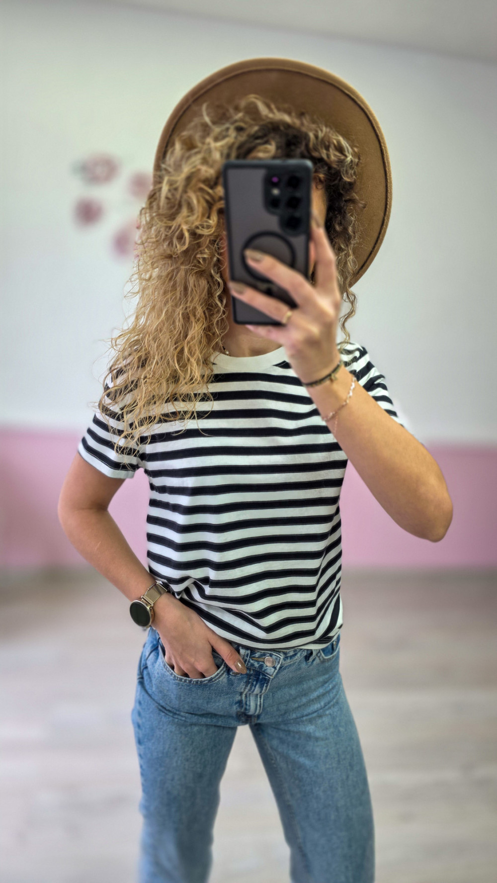 Ten t-shirt w czarno-białe paski to ponadczasowy element garderoby, który nigdy nie wychodzi z mody. Wykonany z miękkiego, oddychającego materiału, zapewnia komfort noszenia przez cały dzień. Klasyczny krój z lekko luźnym dopasowaniem sprawia, że idealnie pasuje do jeansów, spódnic czy szortów.
