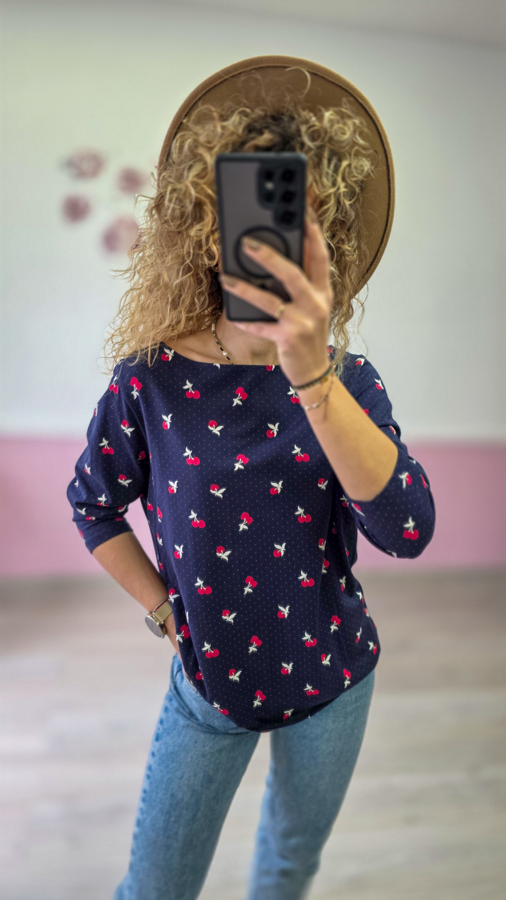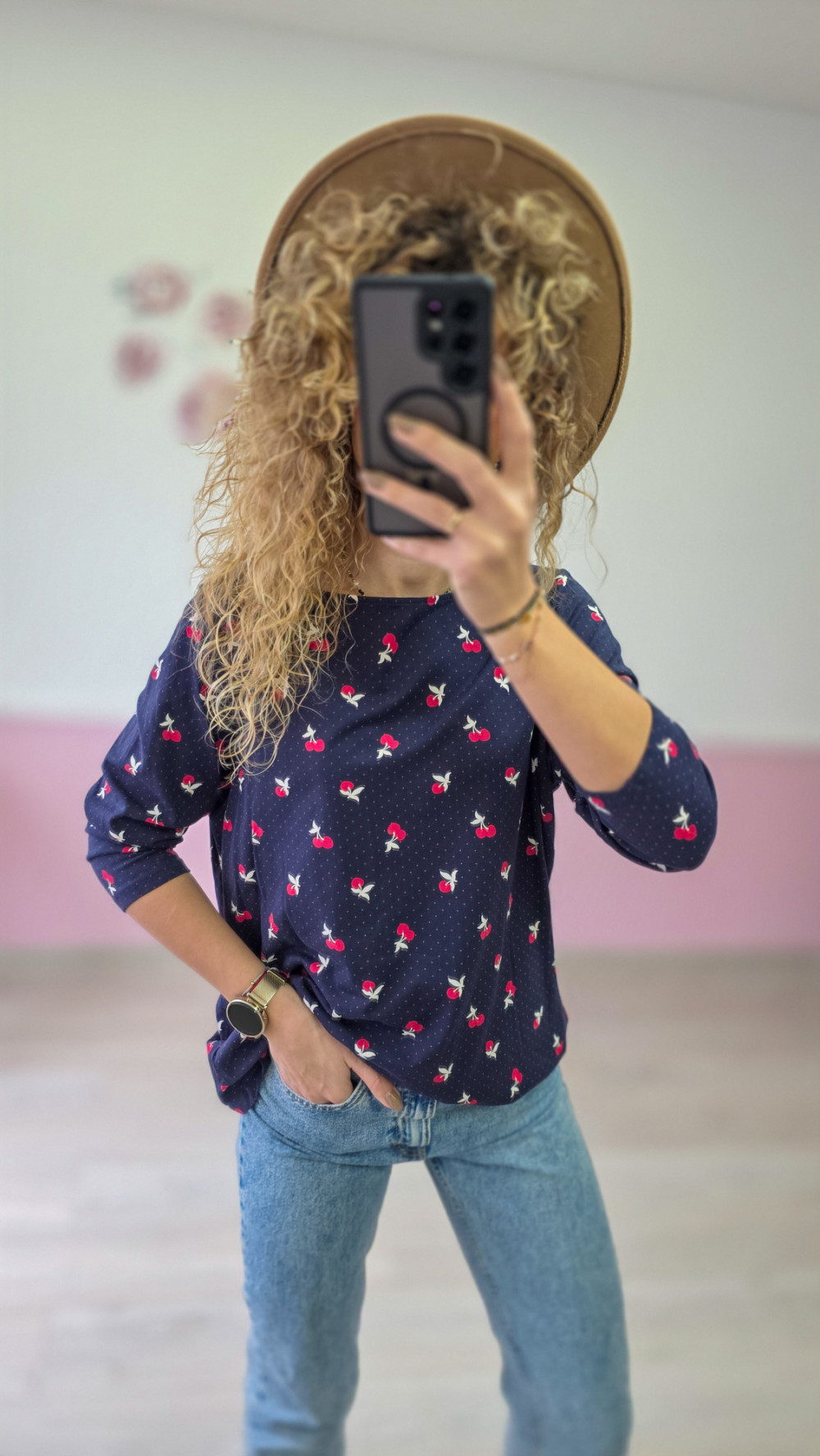 Urocza i kobieca! Bluzka w kolorze granatowym z nadrukiem w drobne wiśnie i delikatne kropeczki to idealny wybór na co dzień. Miękki materiał i luźny krój zapewniają komfort, a subtelny print dodaje dziewczęcego uroku.