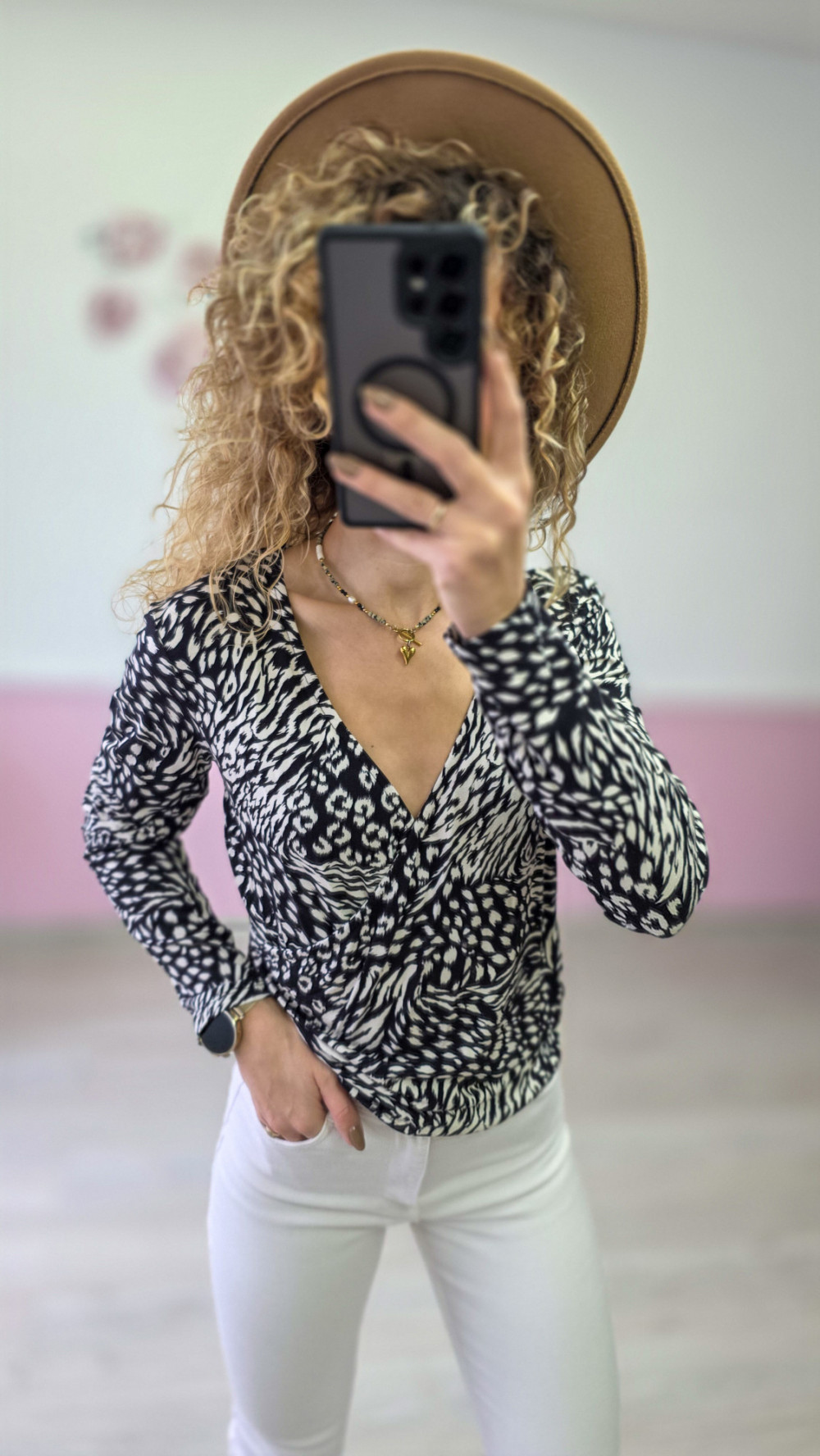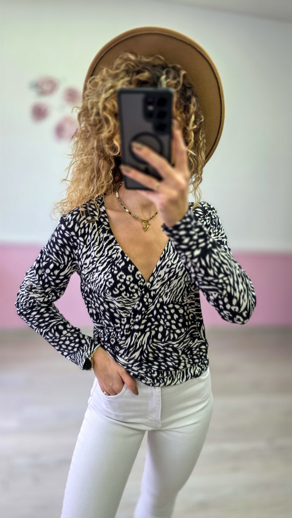 Wyjątkowa bluzka damska o kopertowym kroju, która łączy elegancję z nutą nowoczesności. Wzór w czarno-białe motywy optycznie wysmukla sylwetkę, a dekolt w kształcie litery V pięknie podkreśla kobiece kształty. Wykonana z lekkiego, elastycznego materiału, zapewnia komfort noszenia przez cały dzień.