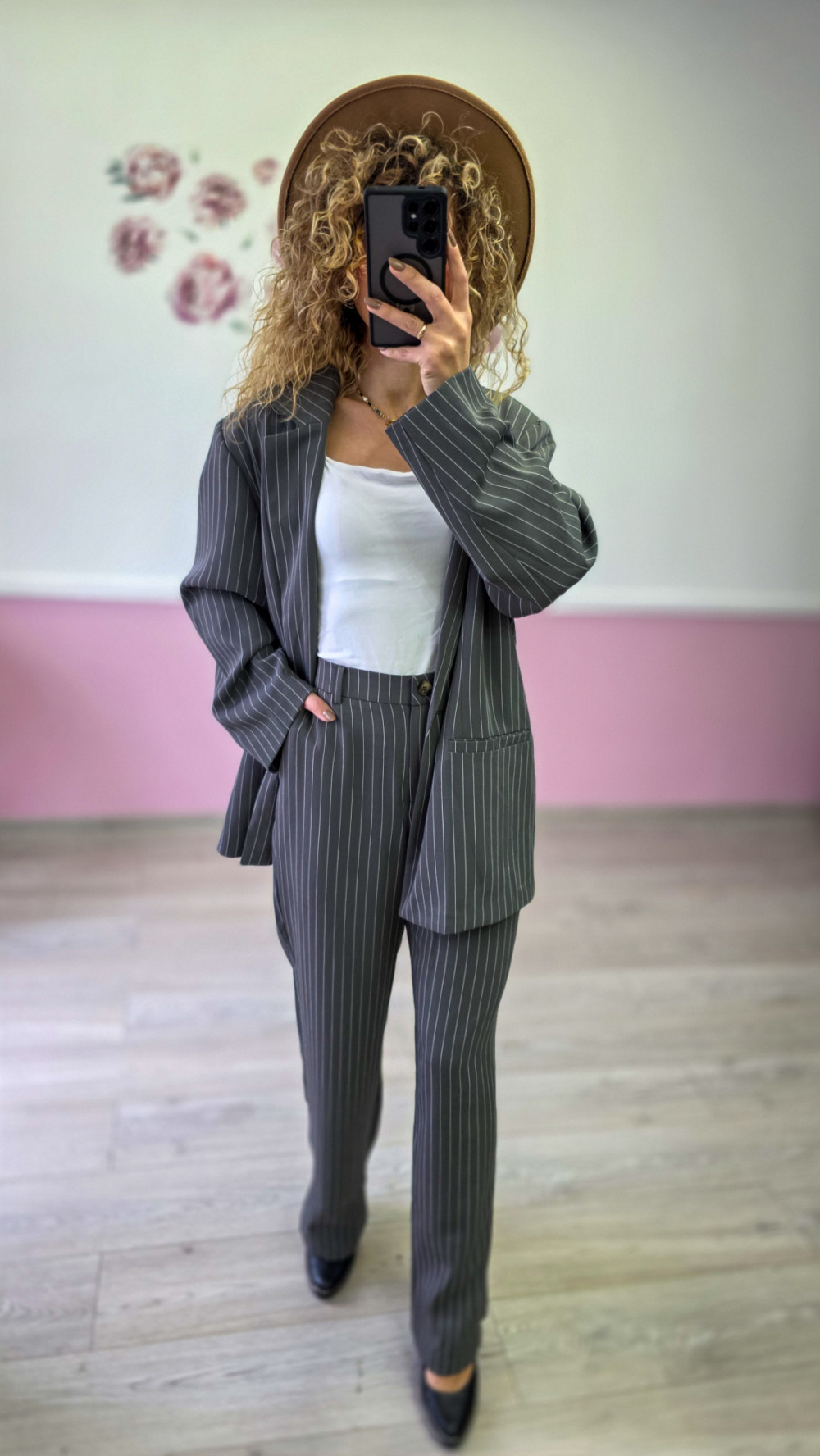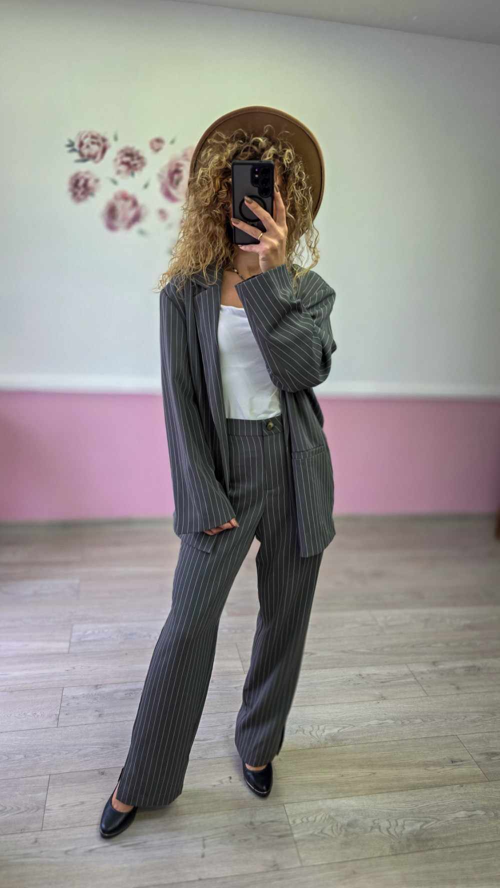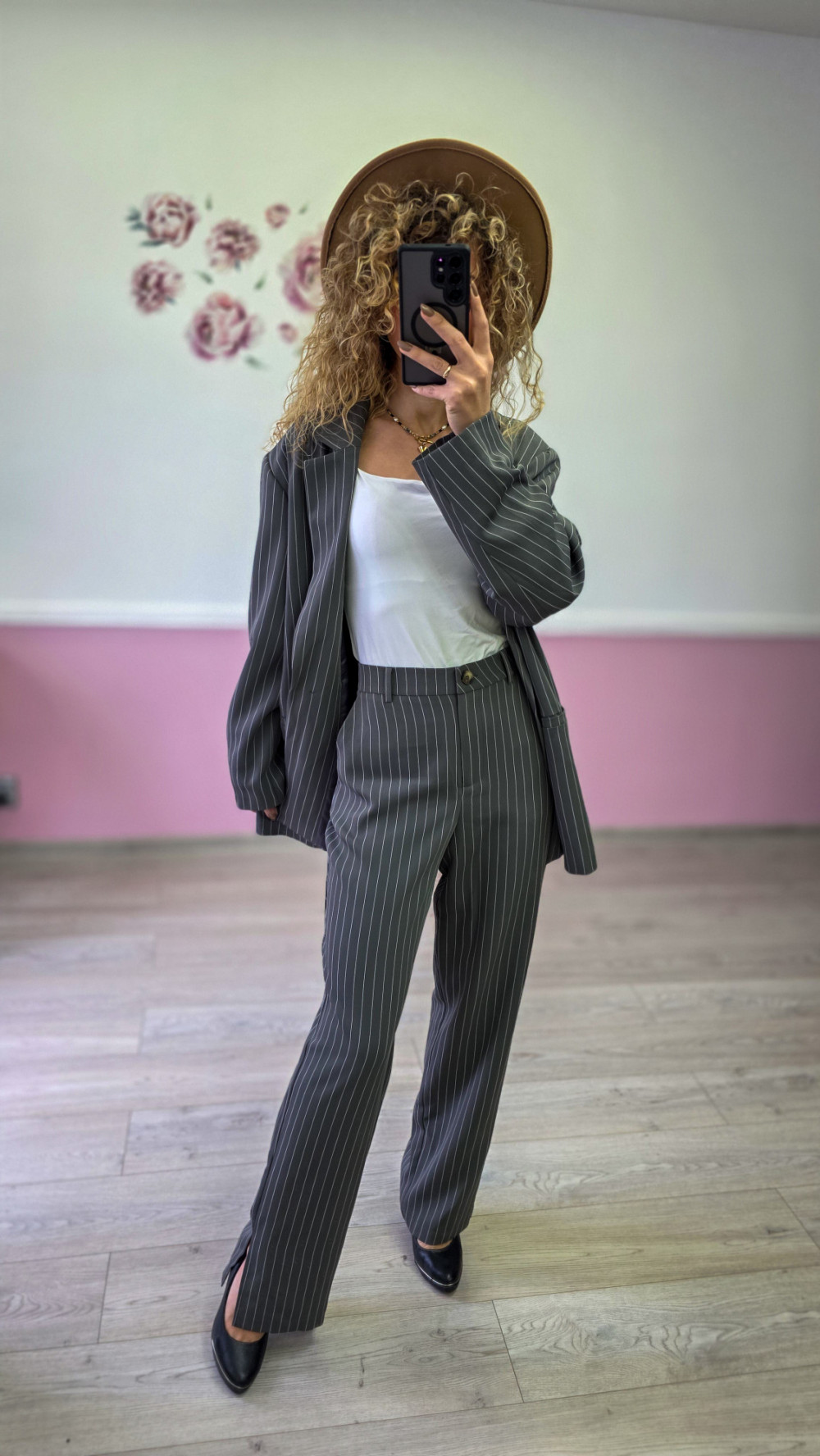 Szary garnitur w delikatne paski to absolutny must have tego sezonu – sprawdzi się zarówno w pracy, na spotkaniu biznesowym, jak i w casualowych stylizacjach na co dzień.