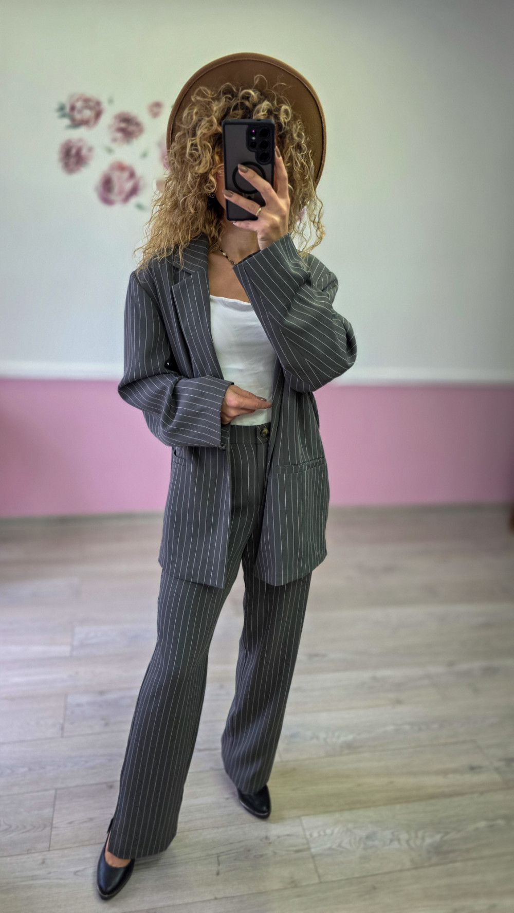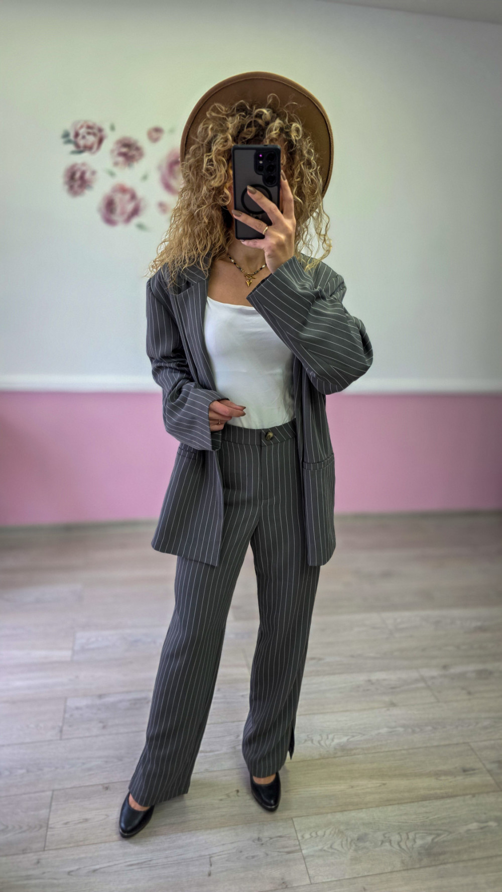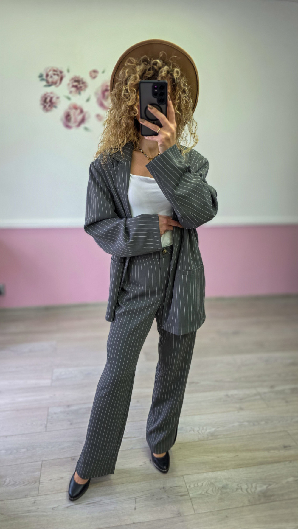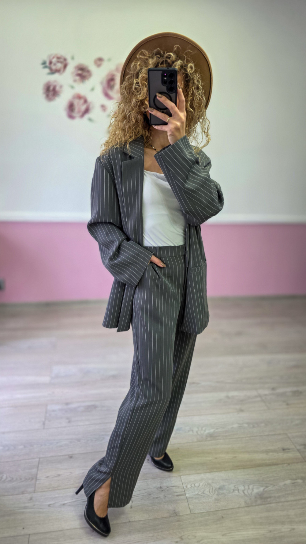 Garnitur damski w paski oversize – szary komplet marynarka i spodnie