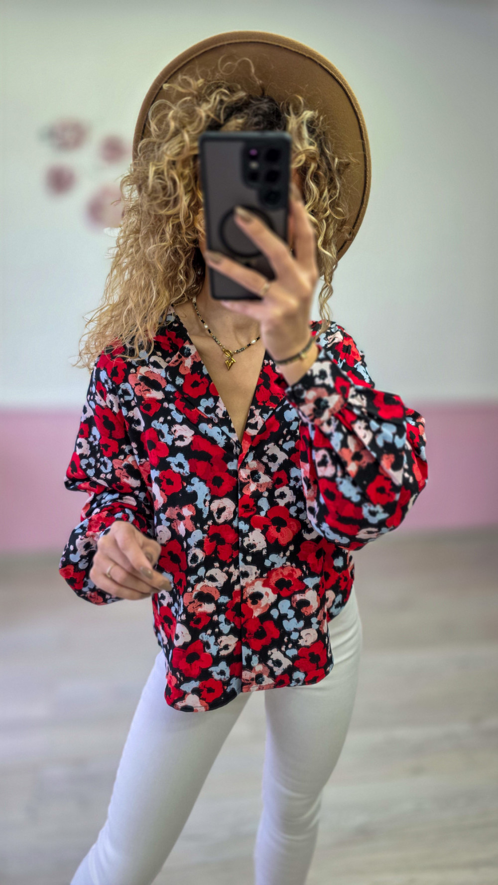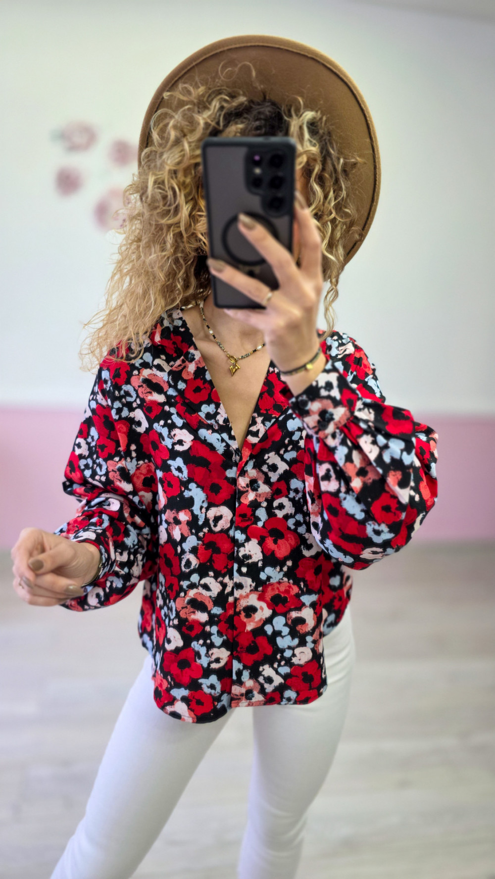 Bluzka w kwiaty w odcieniach czerwieni i różu