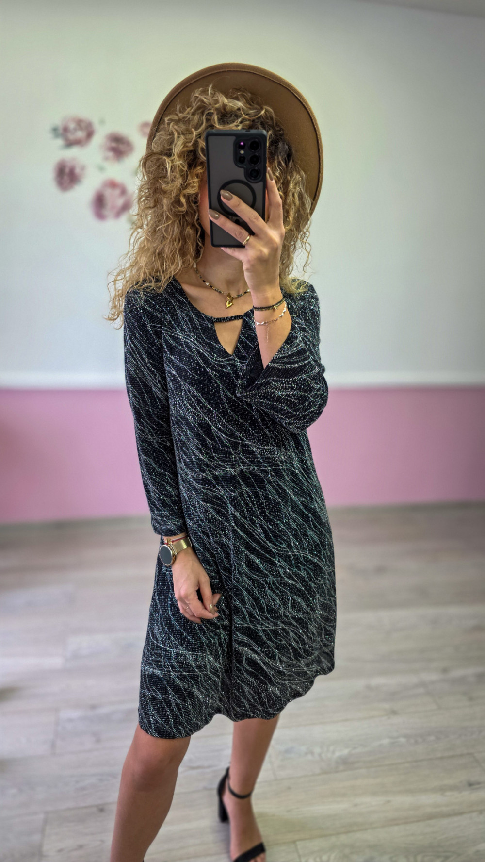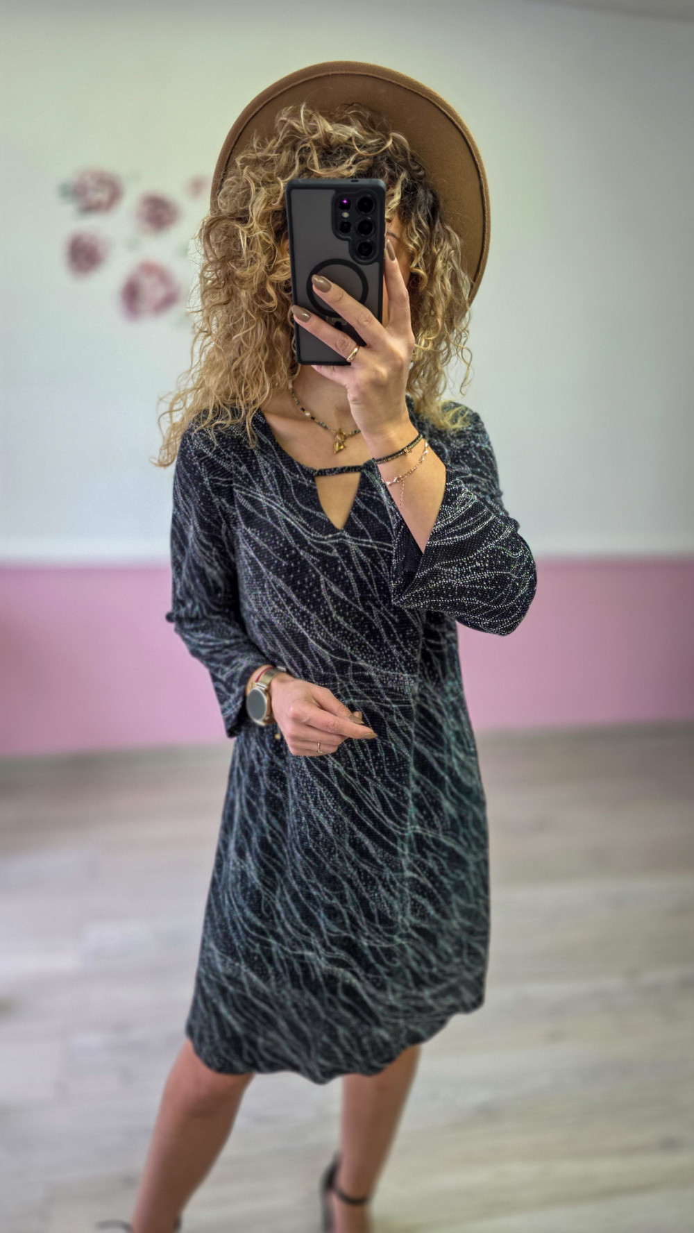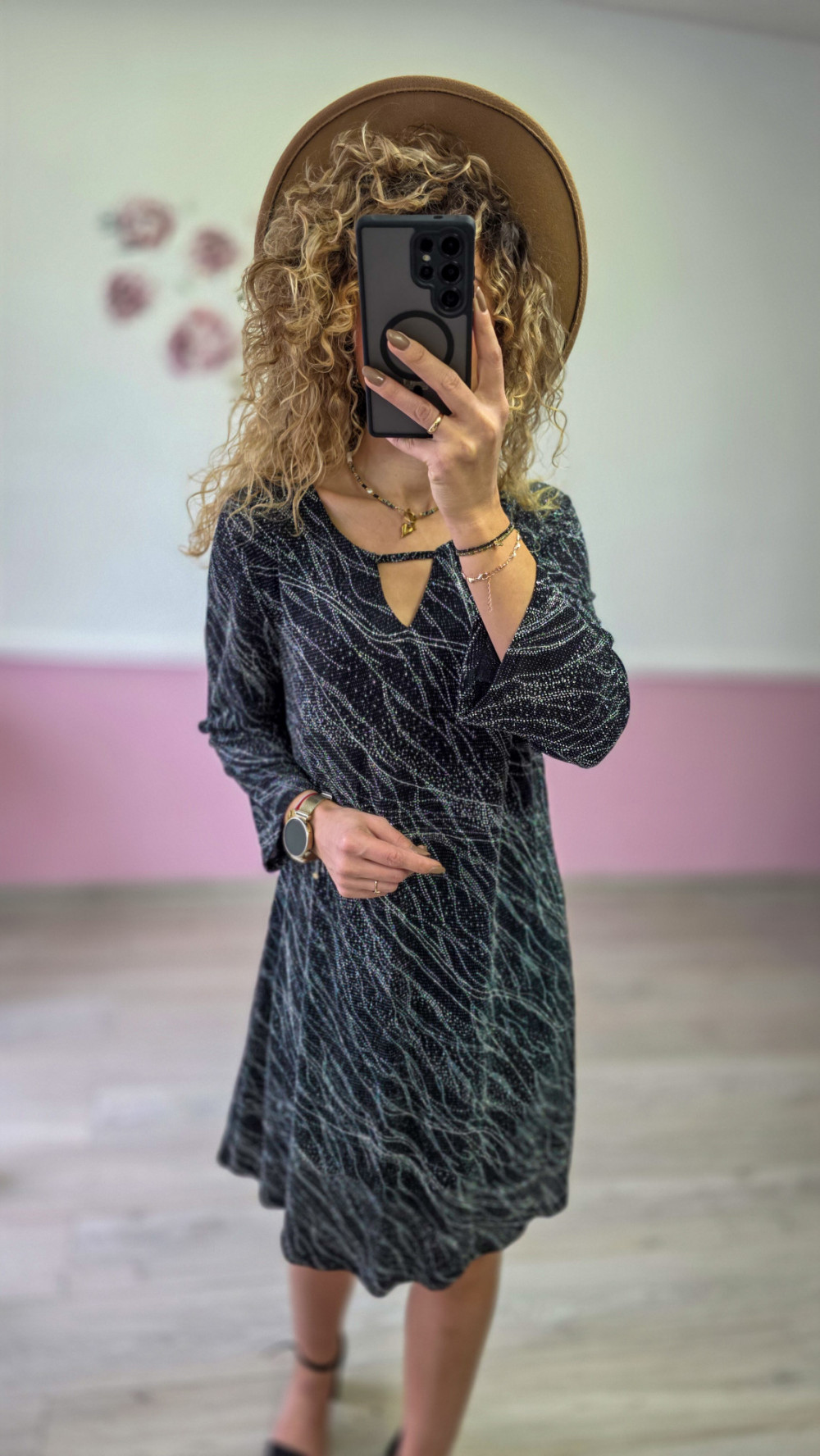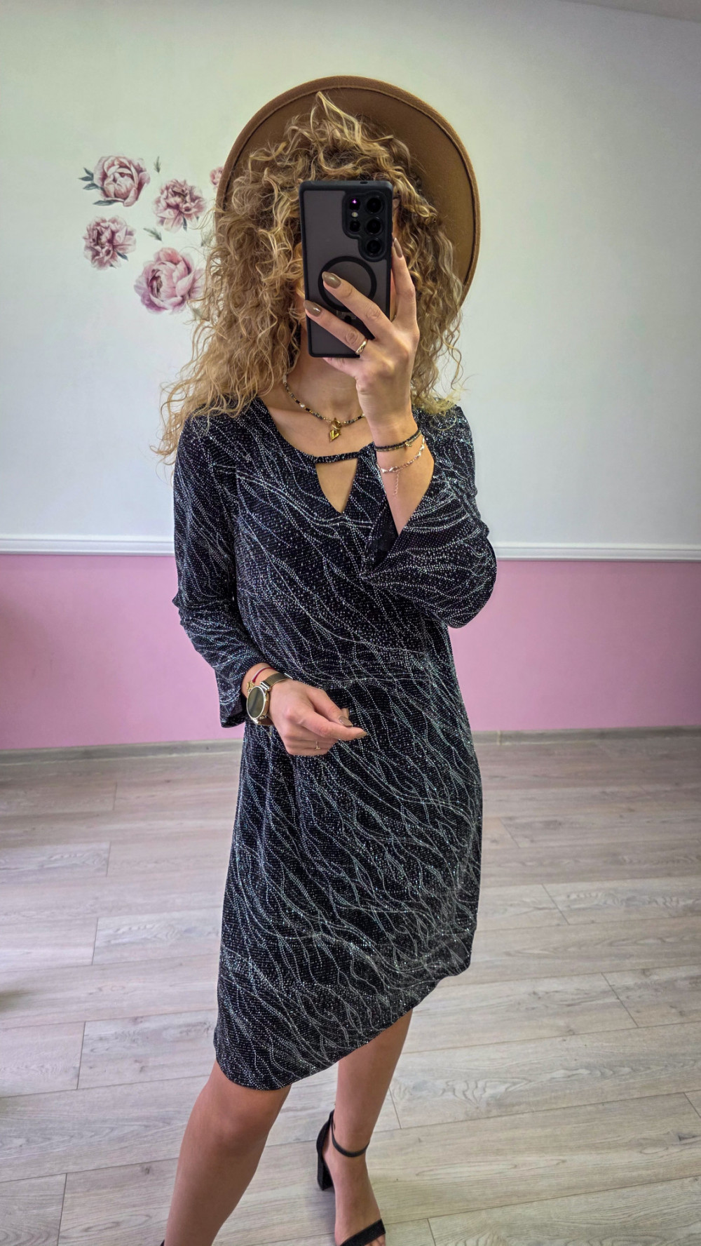 Stylowa czarna sukienka z delikatnym połyskiem to klasyka w nowoczesnym wydaniu. Lekko dopasowany krój subtelnie podkreśla figurę, a dekolt z ozdobnym wycięciem dodaje całości elegancji i kobiecego wdzięku. Rękawy o długości ¾ nadają jej lekkości i uniwersalności.