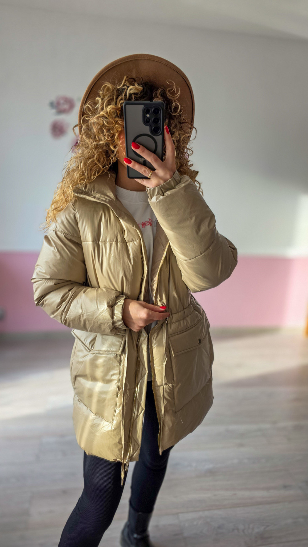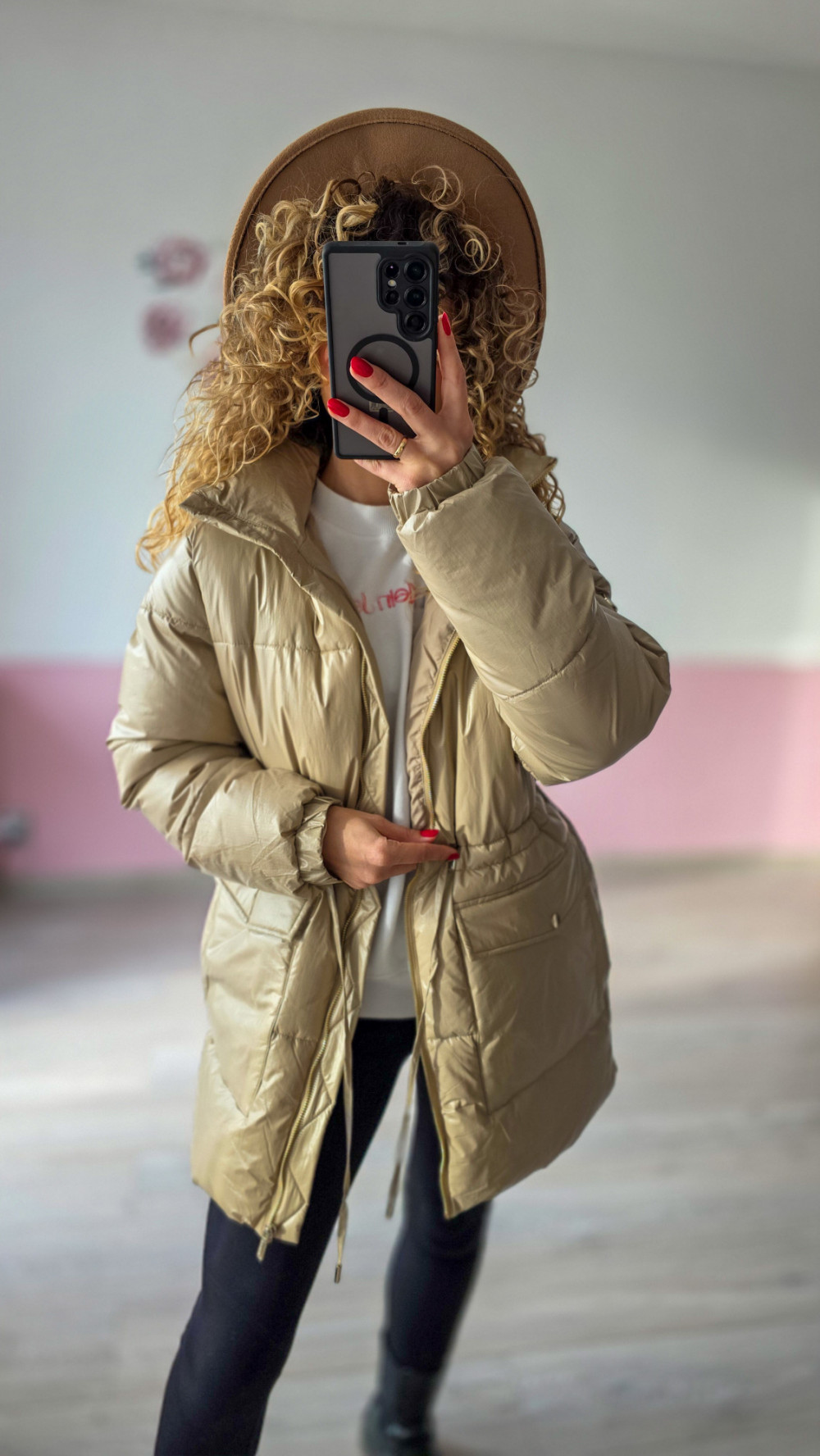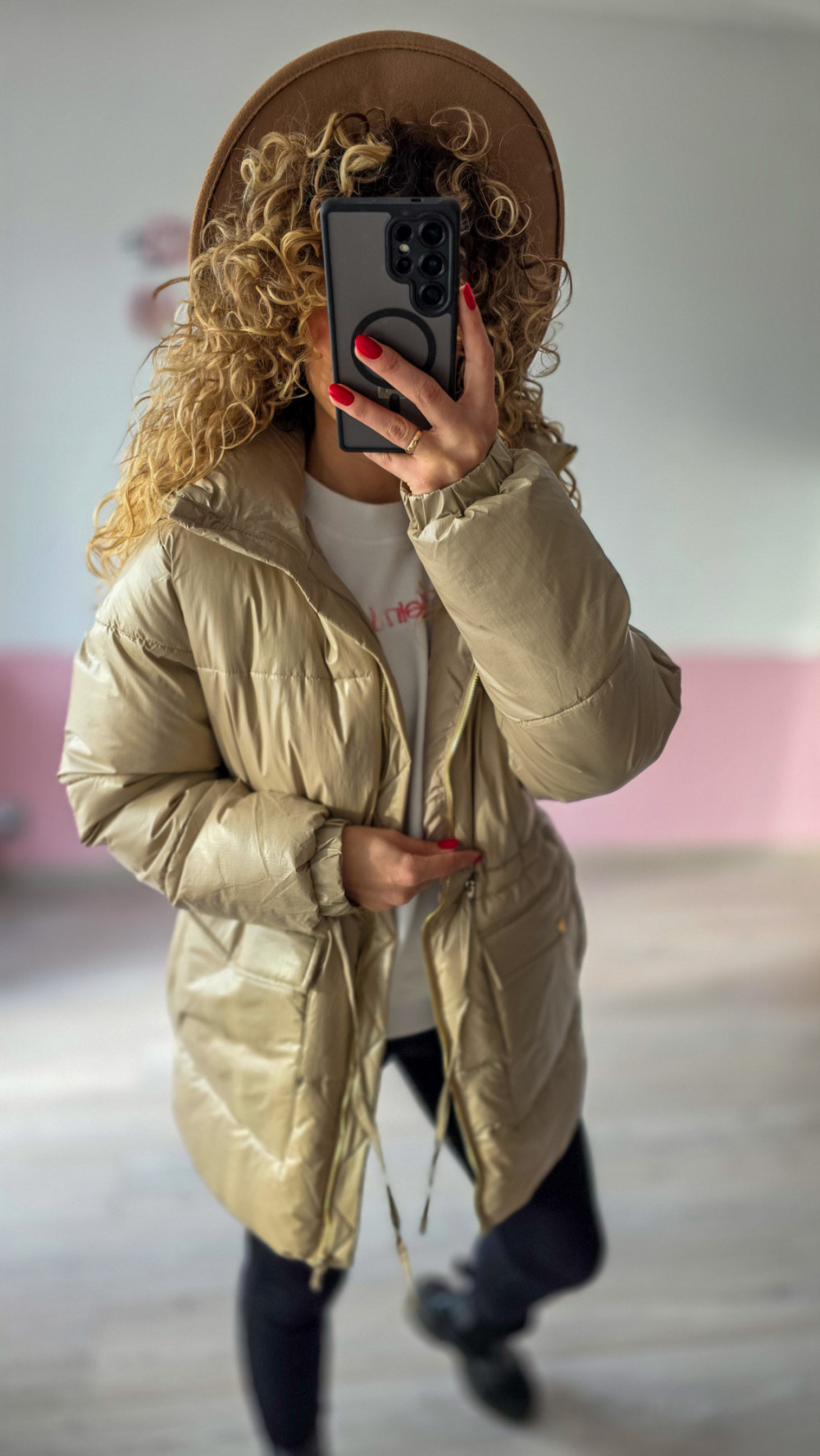 Ta beżowa, połyskująca kurtka zimowa to połączenie elegancji i praktyczności. Model posiada regulowane wiązanie w talii, które pięknie podkreśla sylwetkę, oraz duże kieszenie zapinane na napy – idealne na drobiazgi. Wysoki kołnierz i obszerny kaptur zapewniają doskonałą ochronę przed chłodem.