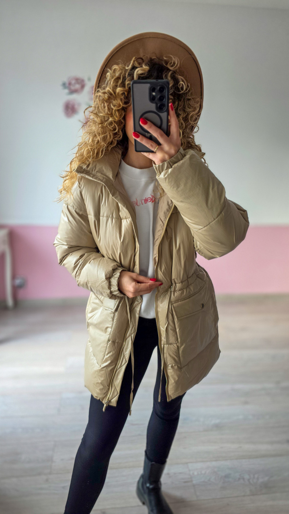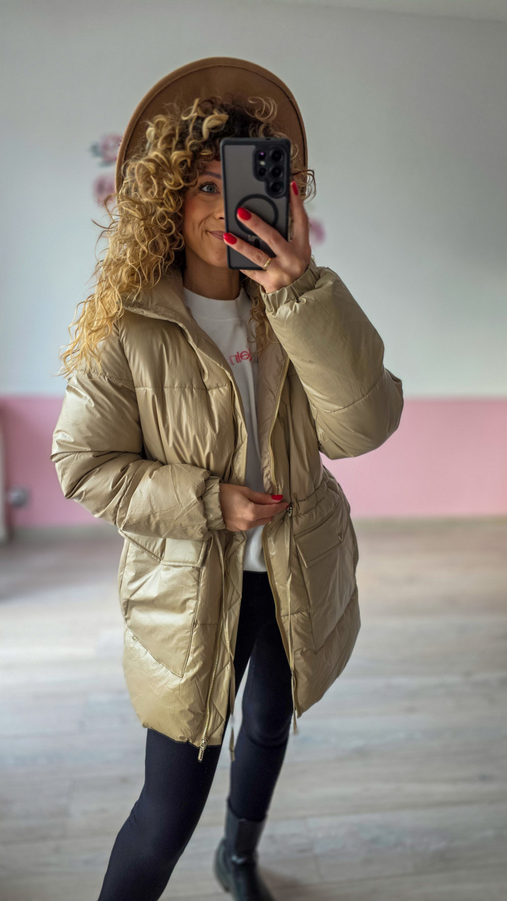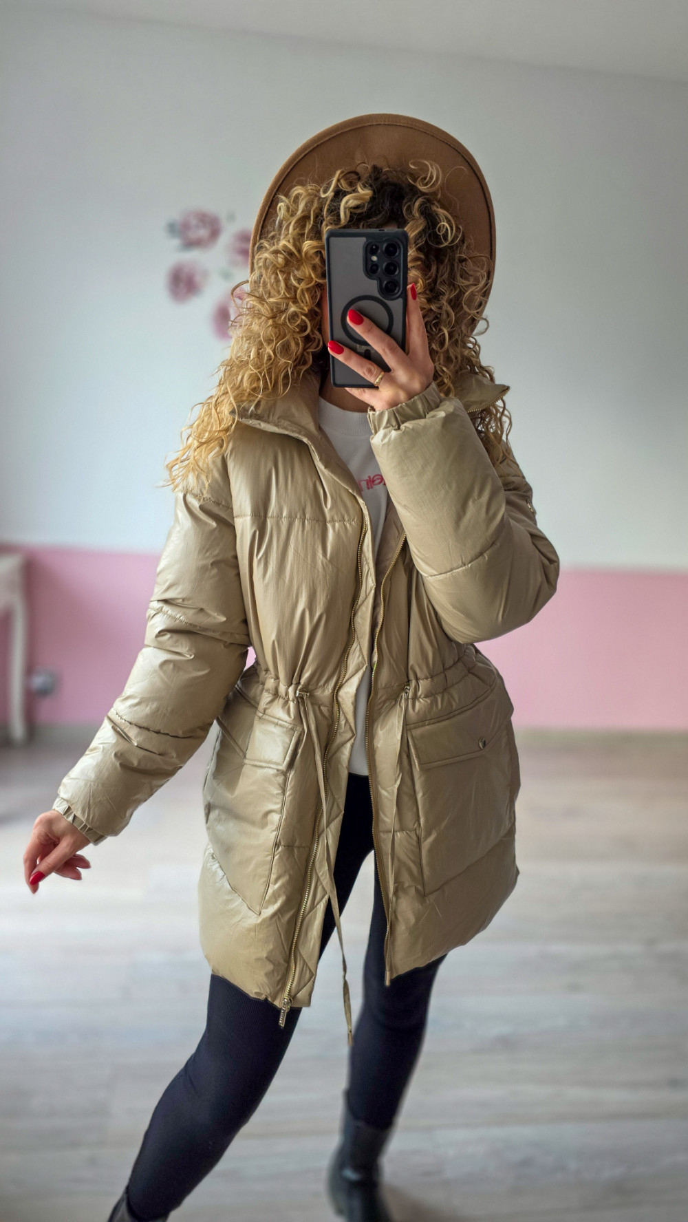 Ta beżowa, połyskująca kurtka zimowa to połączenie elegancji i praktyczności. Model posiada regulowane wiązanie w talii, które pięknie podkreśla sylwetkę, oraz duże kieszenie zapinane na napy – idealne na drobiazgi. Wysoki kołnierz i obszerny kaptur zapewniają doskonałą ochronę przed chłodem.