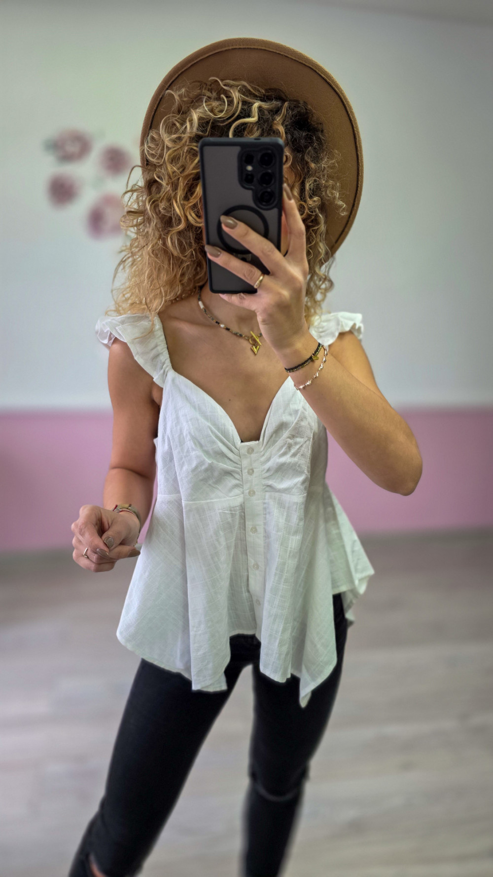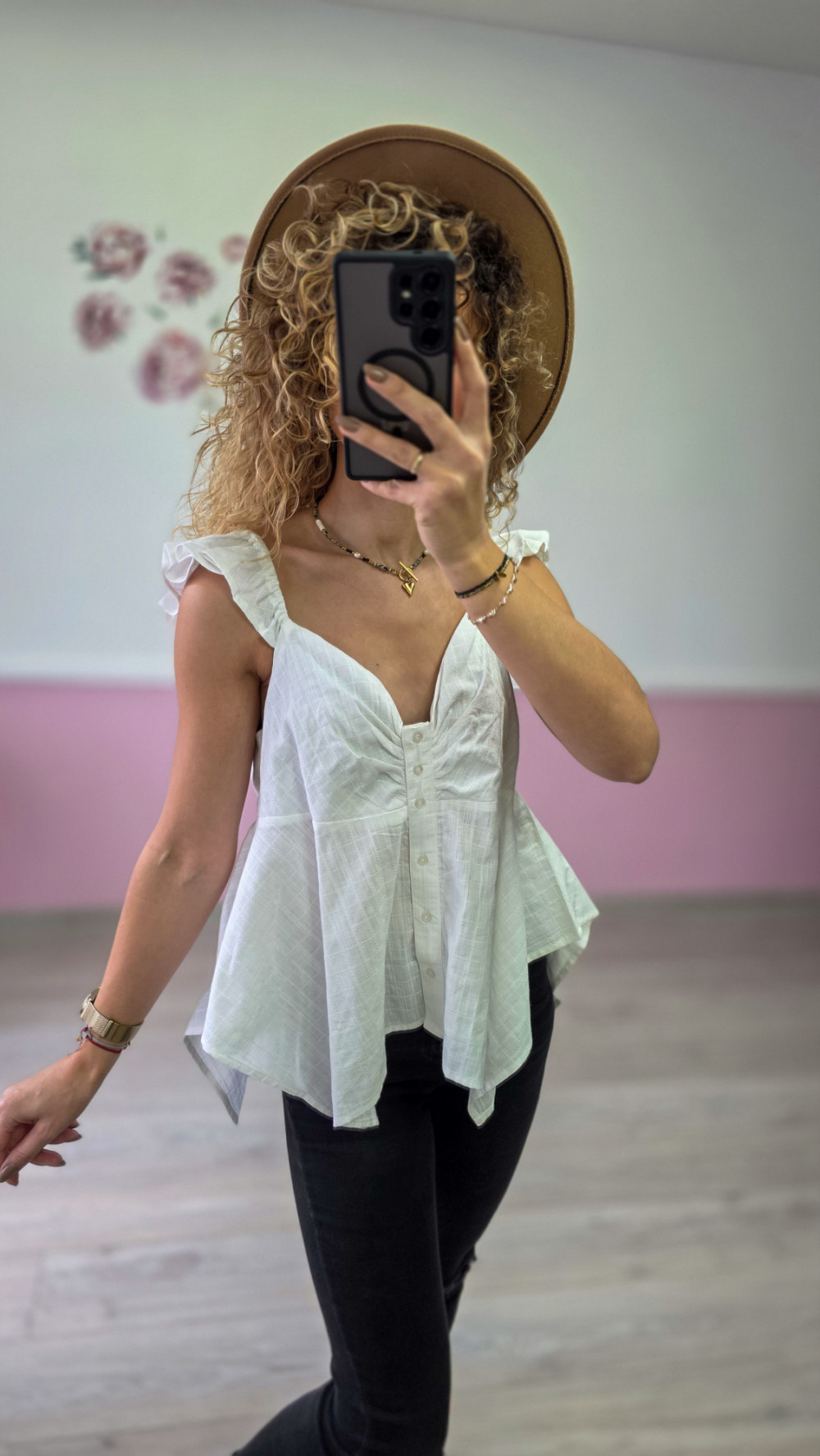 Dodaj swojej garderobie lekkości dzięki naszej białej bluzce z falbankami. Model wyróżnia się głębszym dekoltem, zwiewnym krojem oraz dekoracyjnymi falbanami, które podkreślają kobiecy charakter stylizacji. Bluzka jest idealna na lato — przewiewna, delikatna i bardzo efektowna.