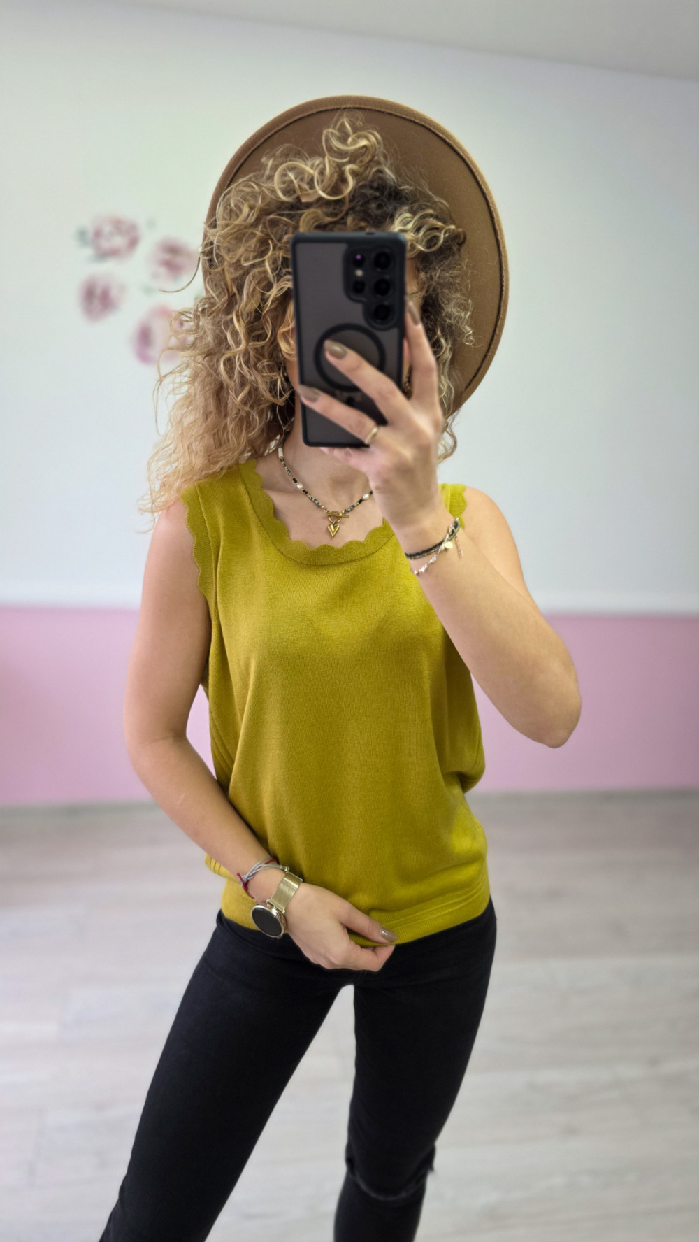 Musztardowy top bez rękawów z falowanym wykończeniem0.00