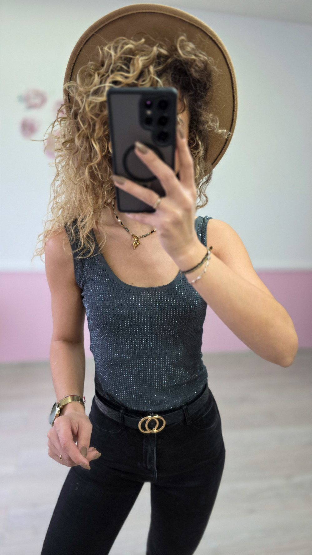 Dodaj blasku swoim stylizacjom dzięki naszemu ciemnoszaremu topowi z drobnymi cyrkoniami. Delikatny połysk pięknie odbija światło, tworząc elegancki efekt idealny na wieczorne wyjścia, imprezy czy świąteczne spotkania. Elastyczny materiał dopasowuje się do sylwetki, podkreślając kobiece kształty, a klasyczny krój sprawia, że top jest niezwykle uniwersalny.