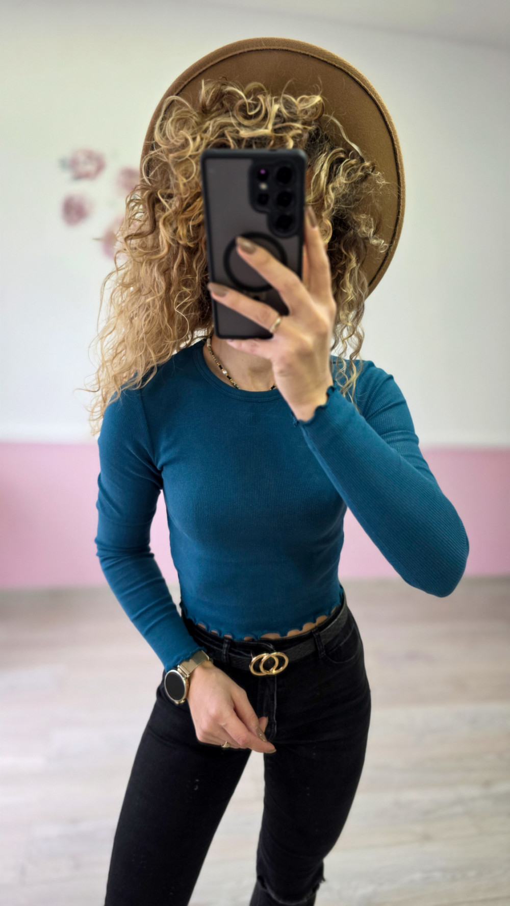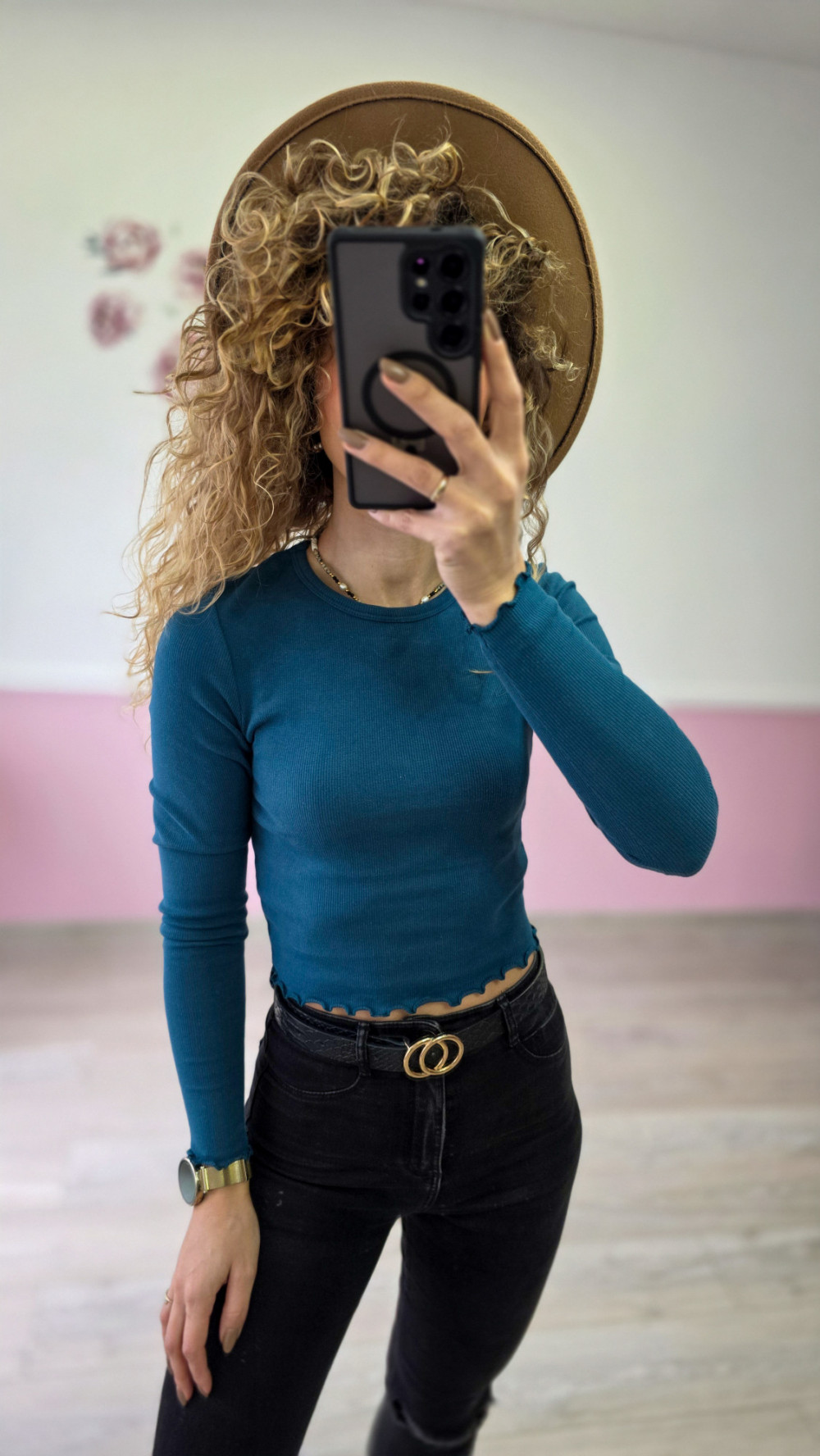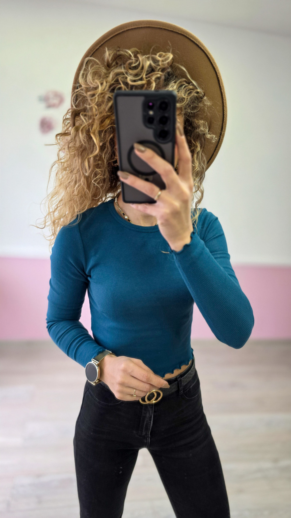 Wygodny i świetnie dopasowany turkusowy longsleeve basic to idealna baza do wielu stylizacji. Elastyczny, prążkowany materiał idealnie przylega do ciała, a falowany dół dodaje uroku i delikatności. Bluzka doskonale sprawdzi się pod marynarkę, sweter albo solo w prostych, codziennych zestawach.