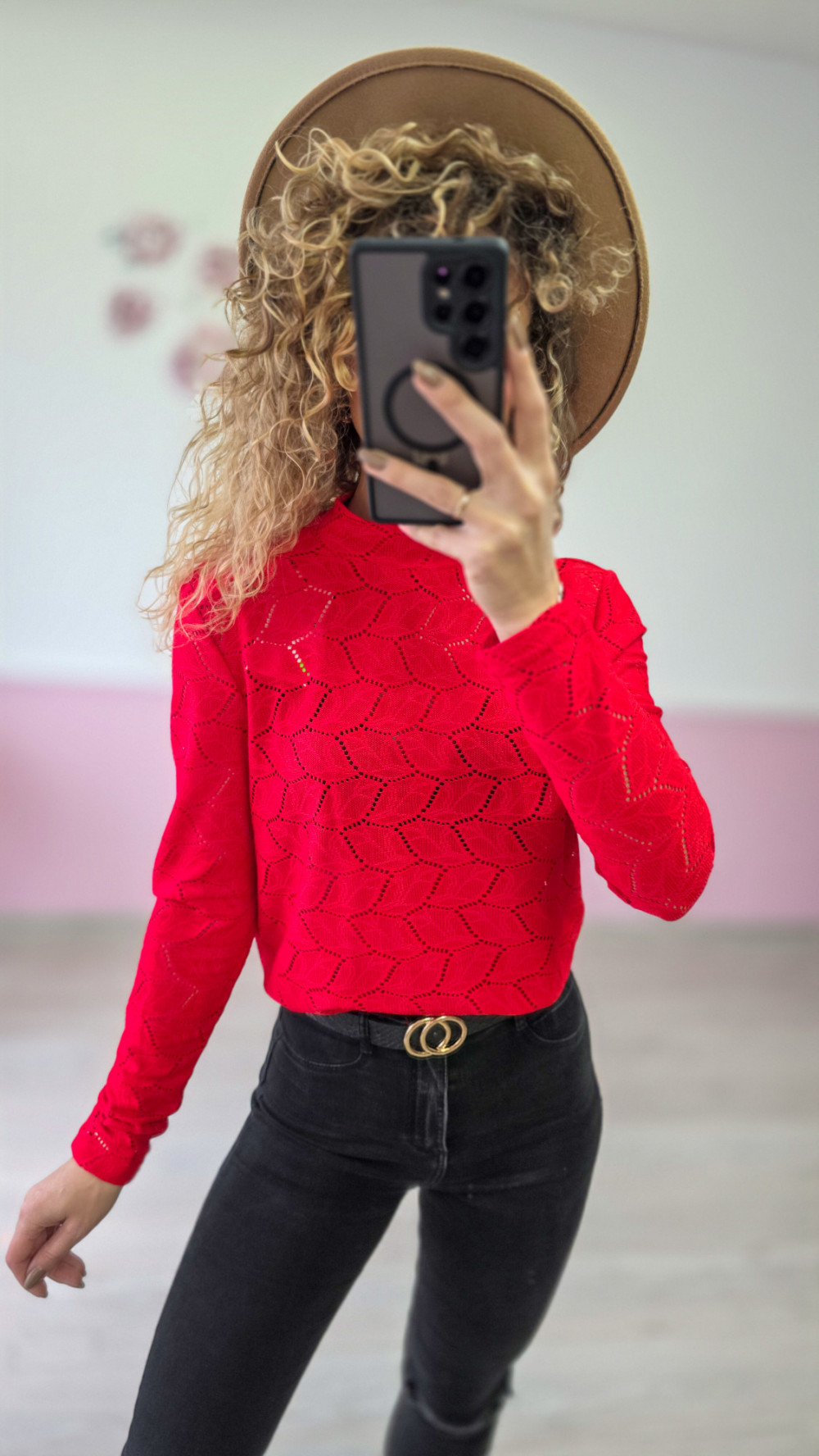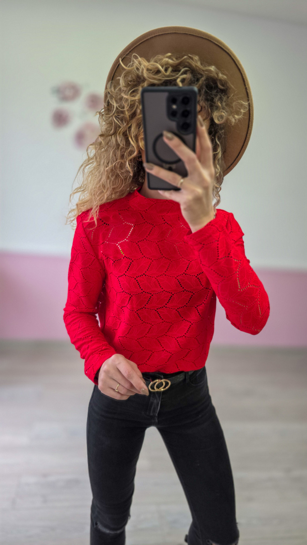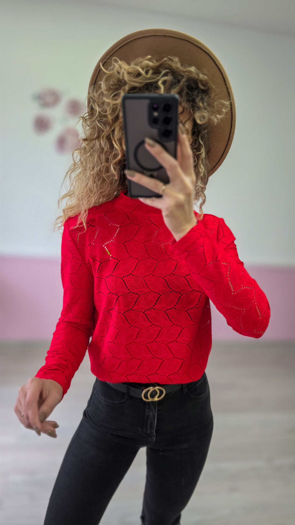 Podkreśl swój styl energetycznym, ażurowym swetrem w intensywnym czerwonym kolorze. Model wykonany jest z miękkiego, przewiewnego materiału, który delikatnie układa się na sylwetce i zapewnia komfort noszenia przez cały dzień. Geometryczny wzór dodaje mu wyjątkowego charakteru, a klasyczny krój sprawia, że świetnie pasuje zarówno do jeansów, jak i eleganckich spodni. Idealny wybór na sezon wiosna–jesień.