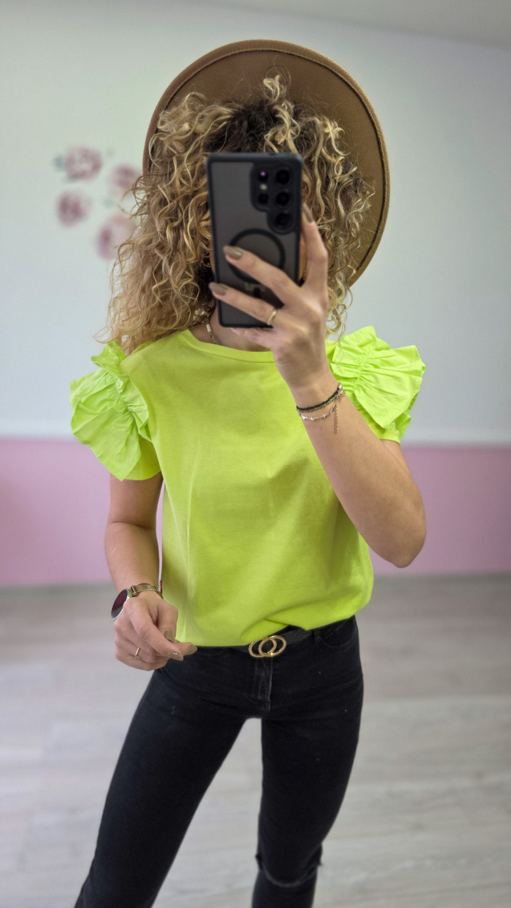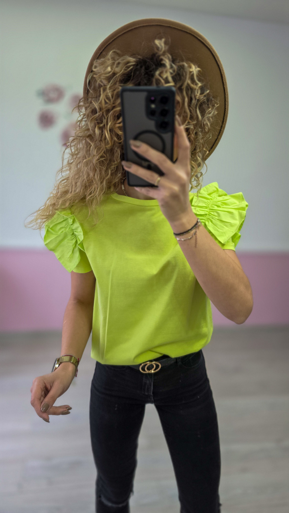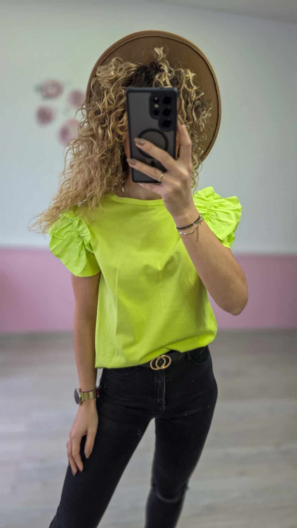 Modny T-shirt w neonowej limonce z efektownymi, marszczonymi bufkami, które pięknie podkreślają ramiona. Model wyróżnia się połączeniem minimalistycznej formy z wyrazistym akcentem. Wygodny, miękki materiał i lekko dopasowany krój sprawiają, że świetnie sprawdza się zarówno do jeansów, jak i bardziej kobiecych stylizacji. Idealny dla fanek trendów.