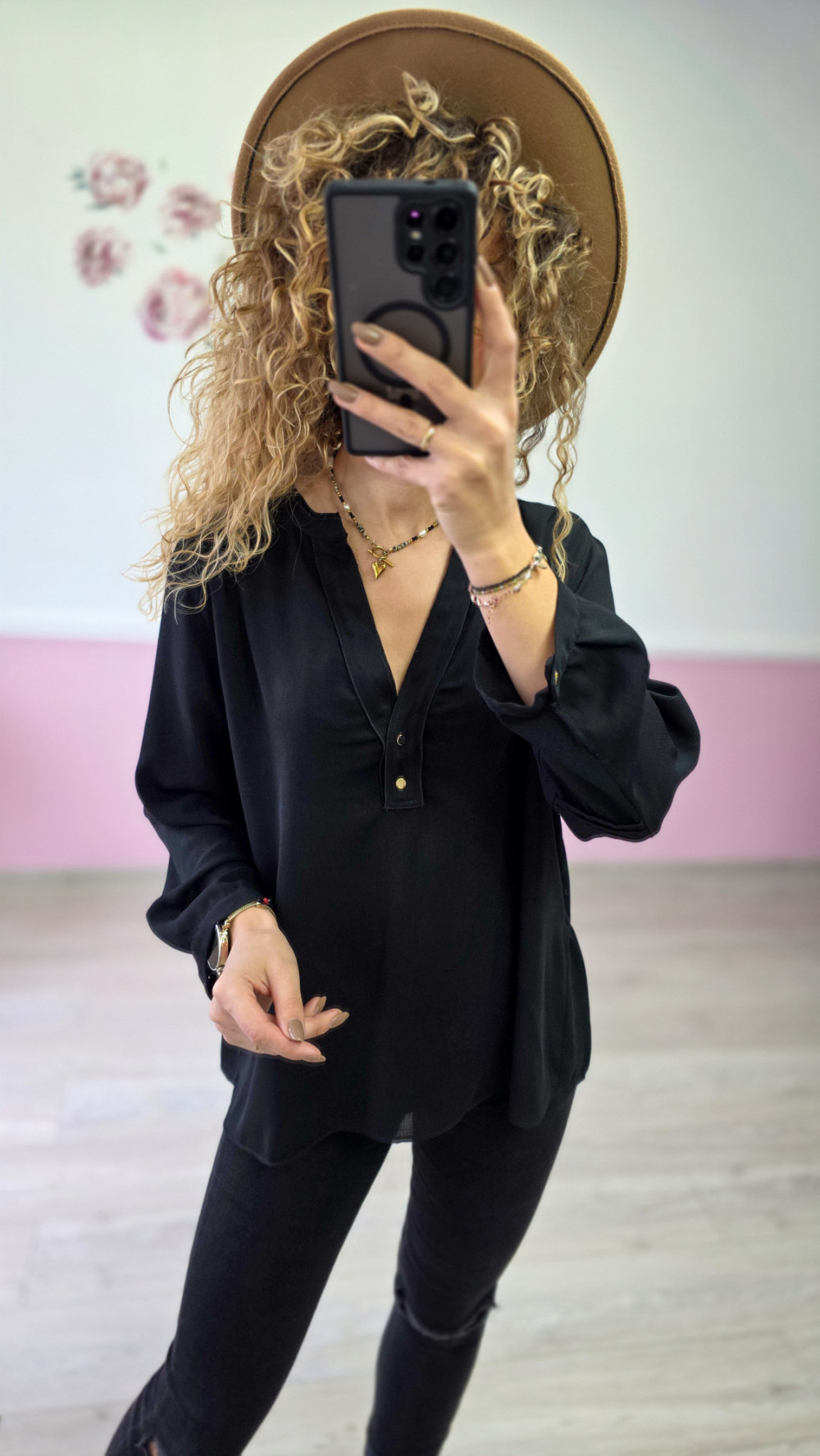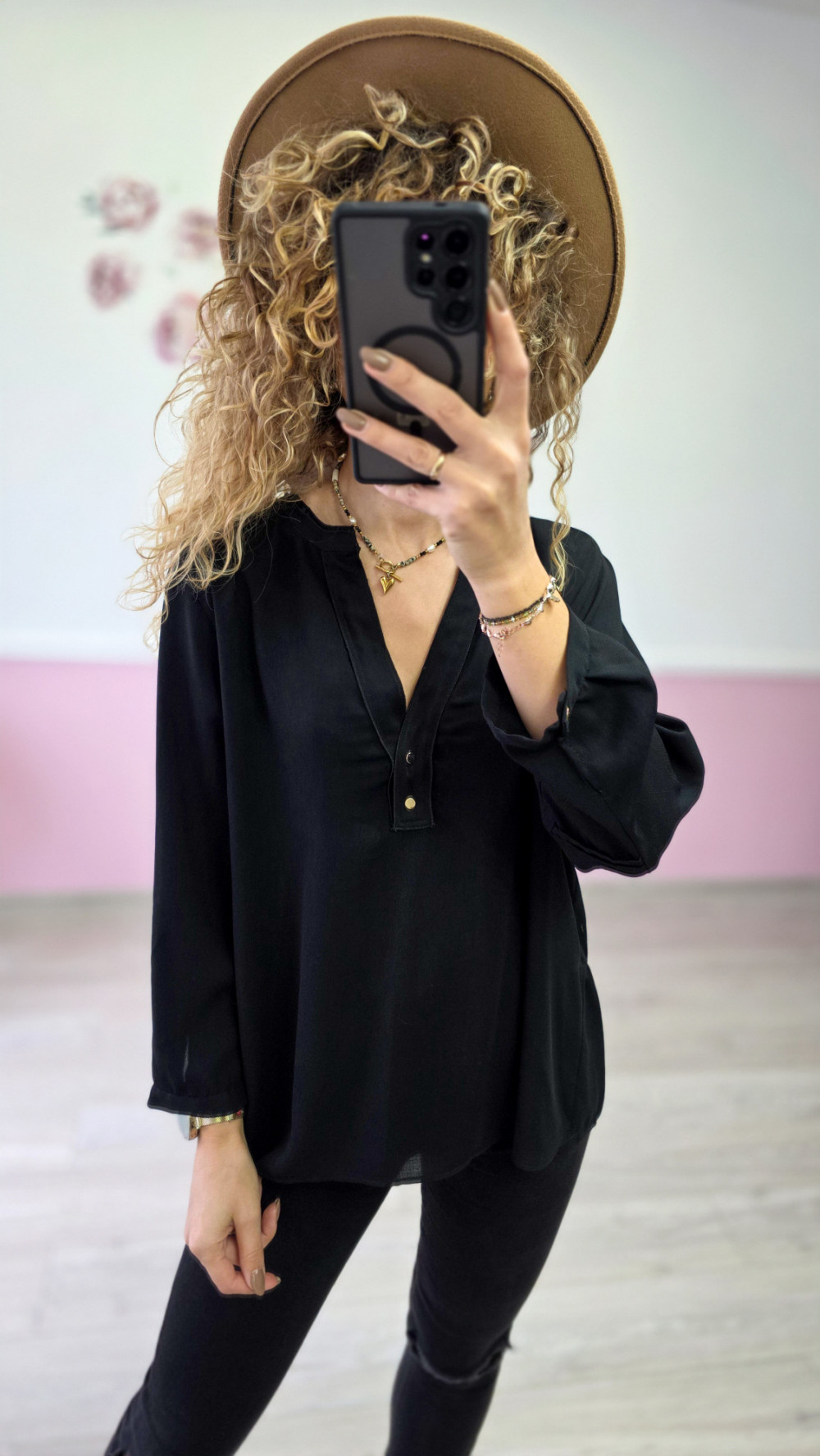 Stylowa, lekko oversize’owa bluzka w ponadczasowej czerni. Model posiada kobiecy dekolt w kształcie litery V wykończony delikatną listwą i złotymi guziczkami, które dodają całości elegancji. Długie rękawy zakończone subtelnym mankietem sprawiają, że bluzka świetnie układa się na sylwetce. Lekki, zwiewny materiał gwarantuje komfort noszenia. Idealna do jeansów, materiałowych spodni oraz stylizacji do pracy lub na kolację.