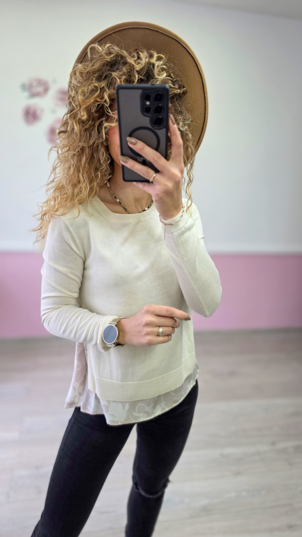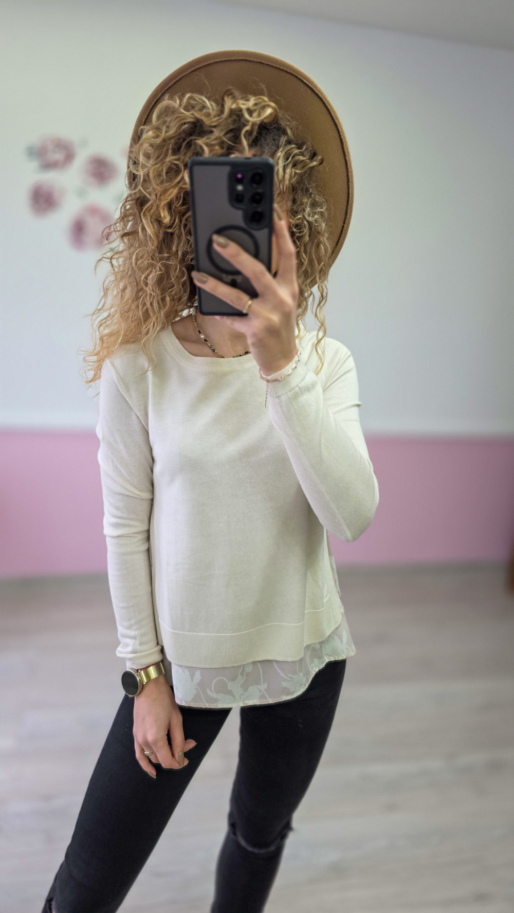 Dół sweterka został wykończony 100% jedwabiem o delikatnym, lekko transparentnym charakterze, który dodaje całości lekkości i kobiecej finezji.