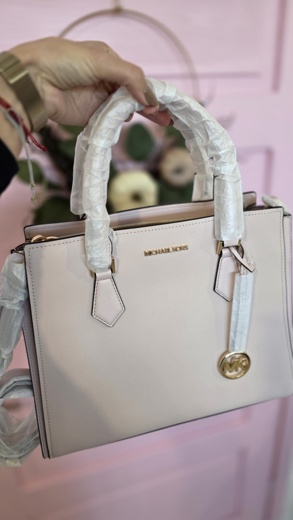 Stylowa, kobieca i ponadczasowa torebka w odcieniu jasnego pudrowego różu, inspirowana klasycznym designem marki Michael Kors. Wykonana z wysokiej jakości skóry saffiano, z pięknymi złotymi dodatkami, idealnie uzupełni zarówno codzienne, jak i eleganckie stylizacje.