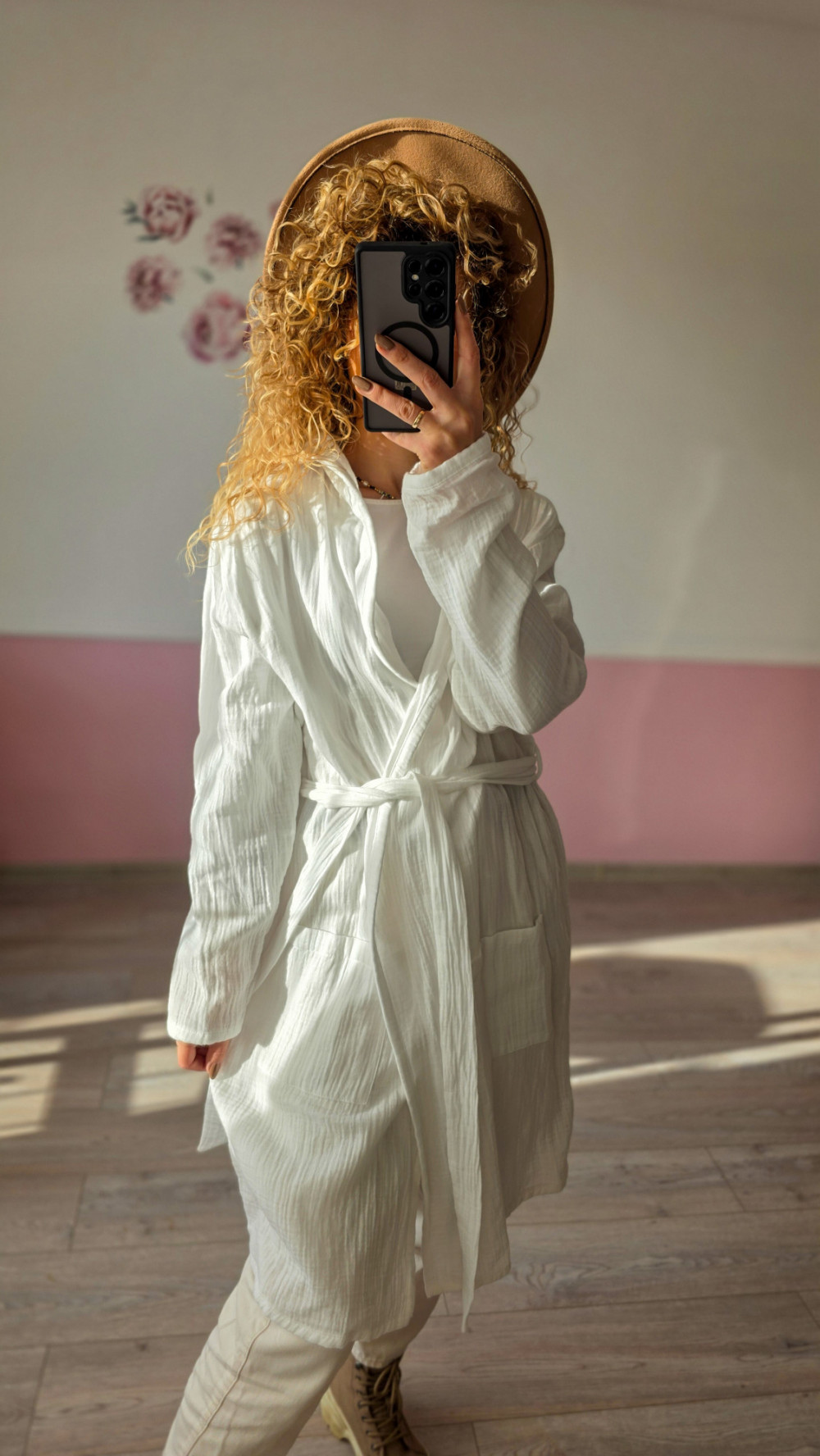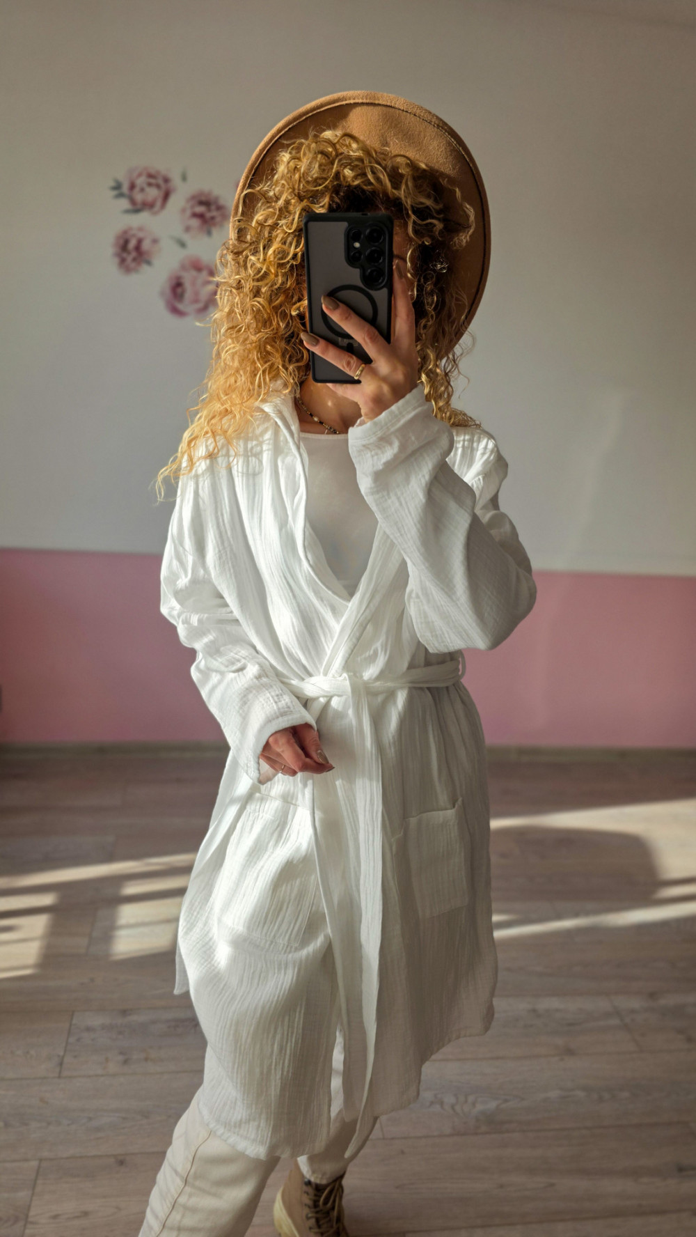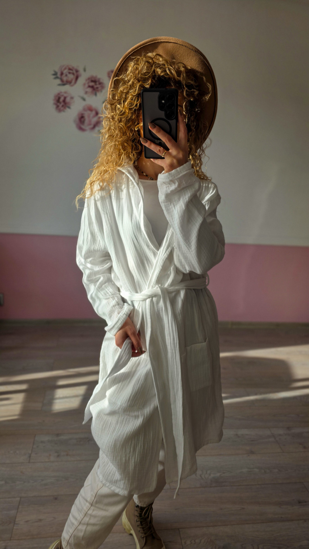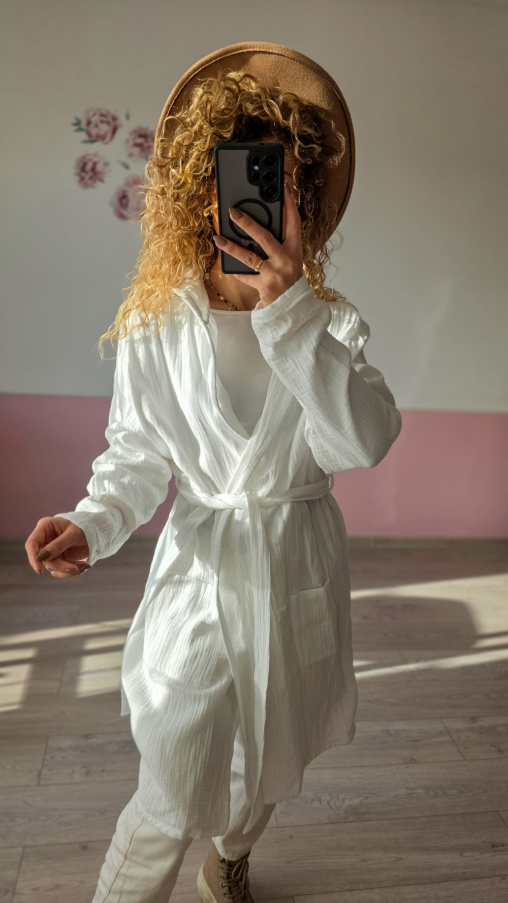 Wygodny i wyjątkowo miękki muślinowy szlafrok damski to idealny wybór dla kobiet ceniących naturalne tkaniny i lekkość. Wykonany z przewiewnego materiału o charakterystycznej, delikatnie marszczonej strukturze, zapewnia komfort o każdej porze roku. Dłuższy krój, praktyczne kieszenie i pasek do wiązania pozwalają dopasować go do sylwetki.