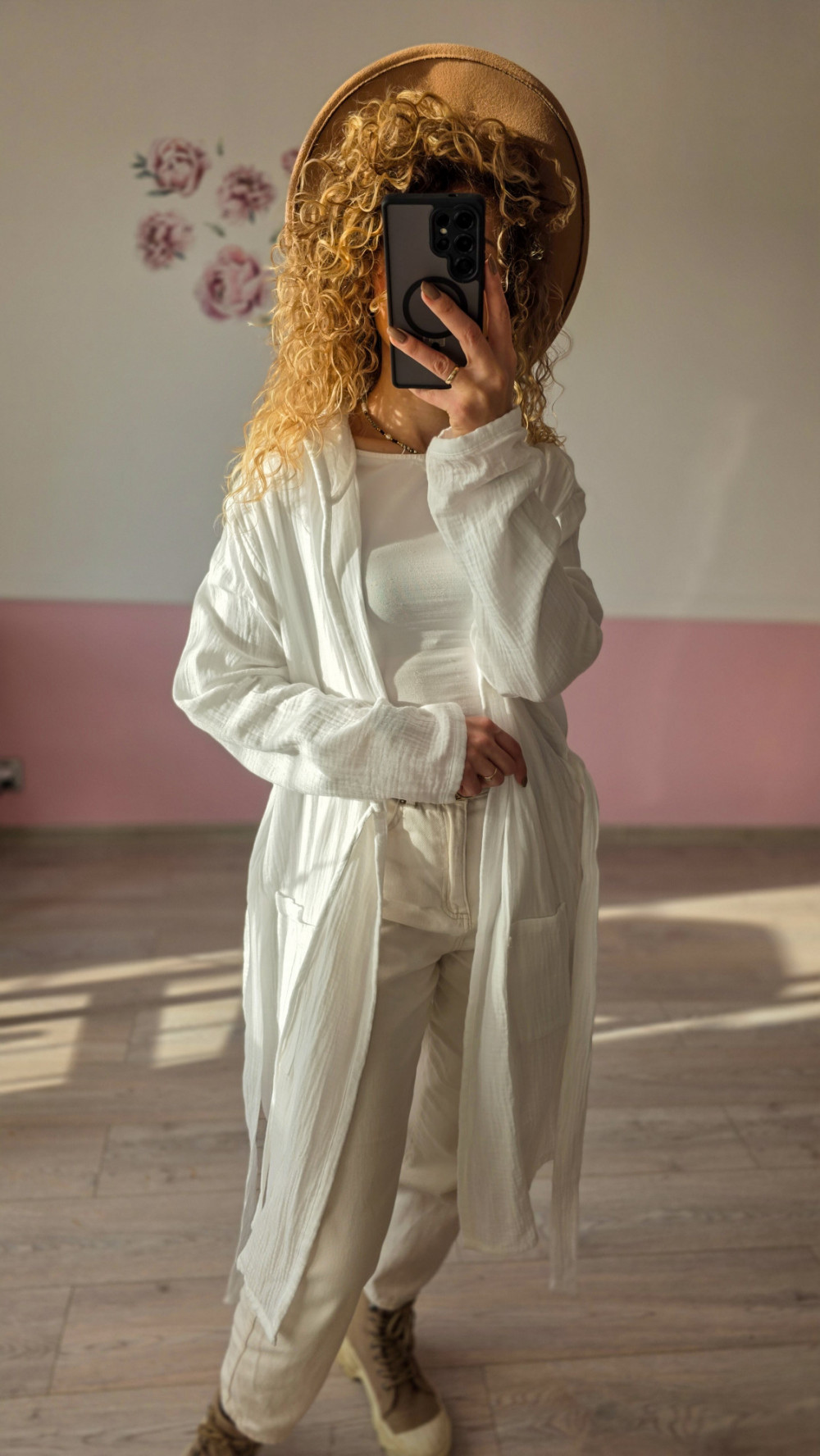 Świetnie sprawdzi się jako domowy szlafrok, narzutka plażowa lub lekki płaszcz do stylizacji boho.
