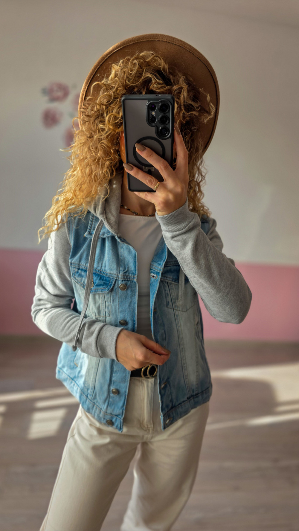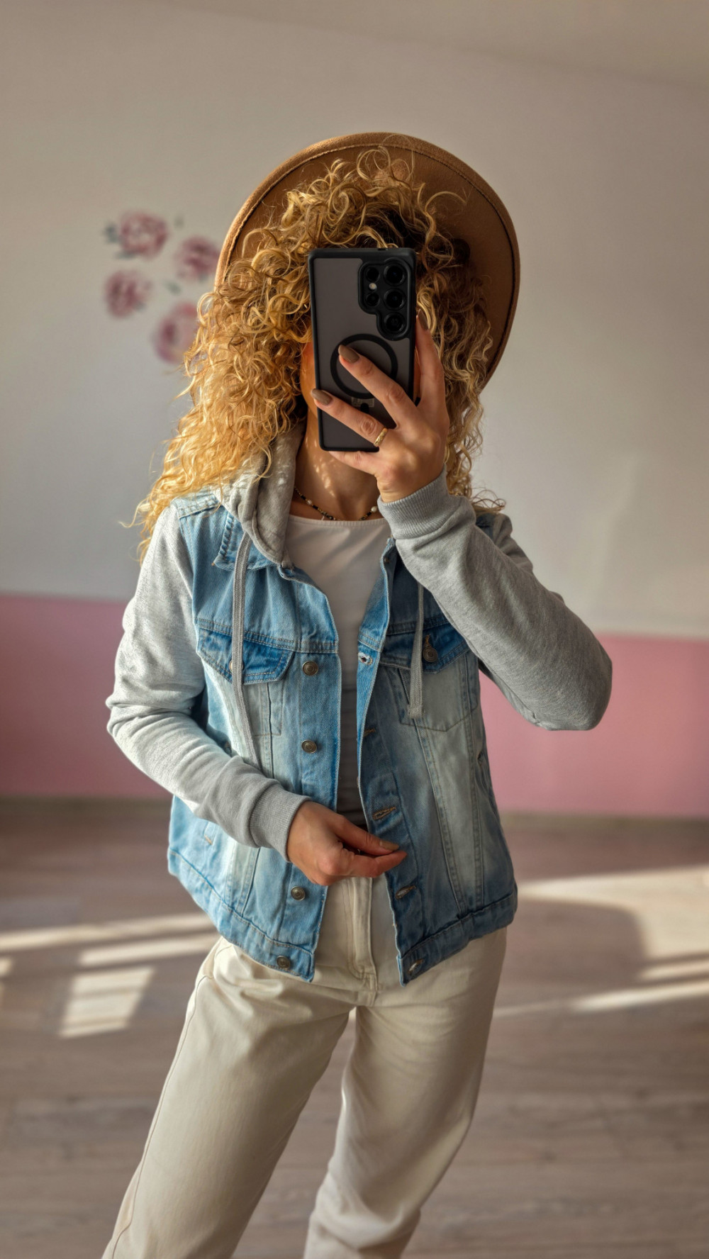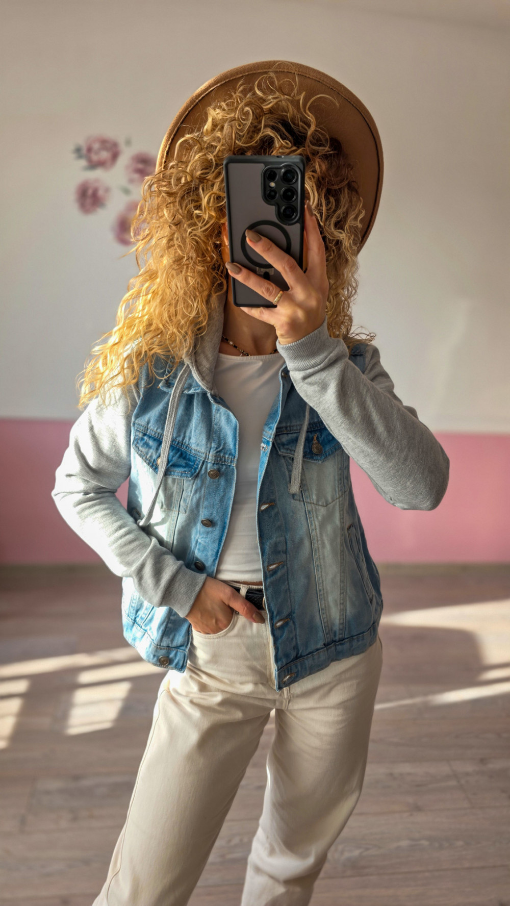 Stylowa kurtka jeansowa z dresowymi rękawami i kapturem to idealne połączenie miejskiego stylu i pełnej wygody. Denimowy korpus z przodu i z tyłu świetnie kontrastuje z miękkimi, bawełnianymi rękawami oraz praktycznym kapturem ze ściągaczami. To model, który sprawdzi się przez cały rok — wiosną, jesienią i chłodniejsze letnie dni.