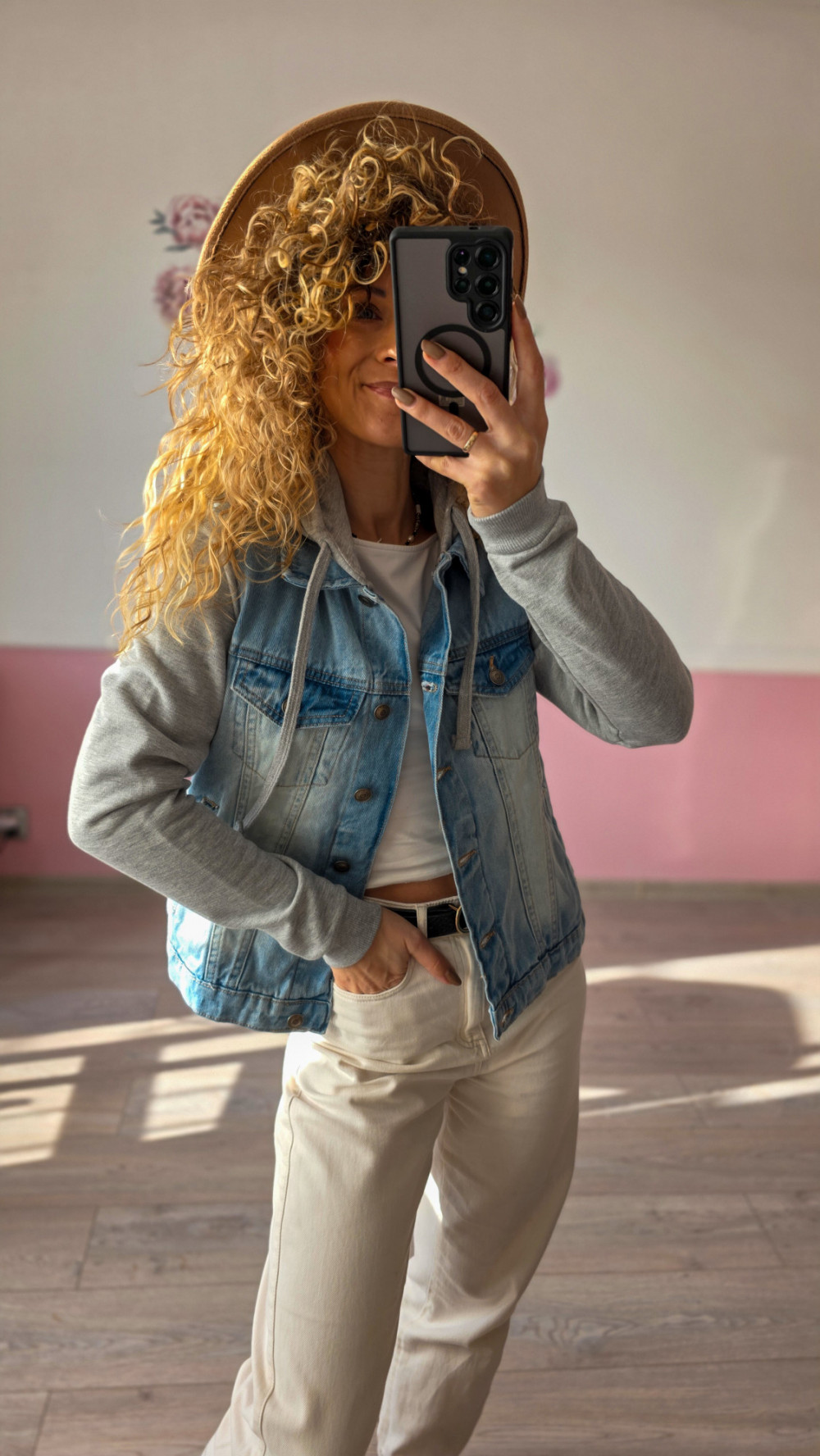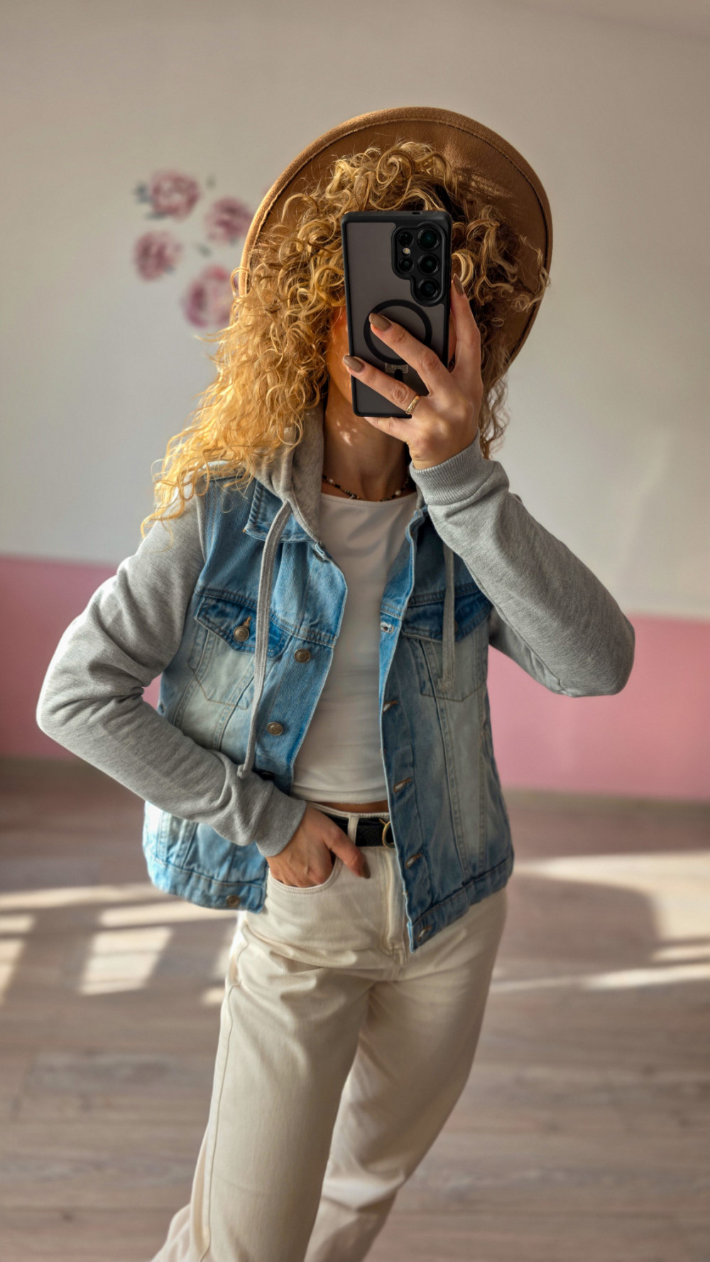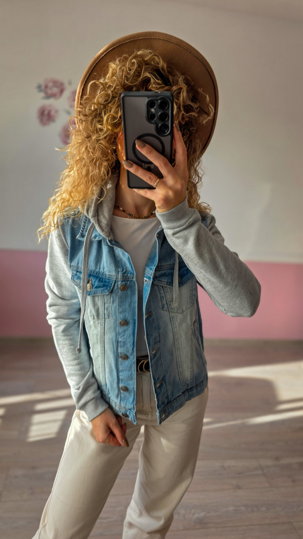 Kurtka jeansowa damska z szarymi dresowymi rękawami i kapturem