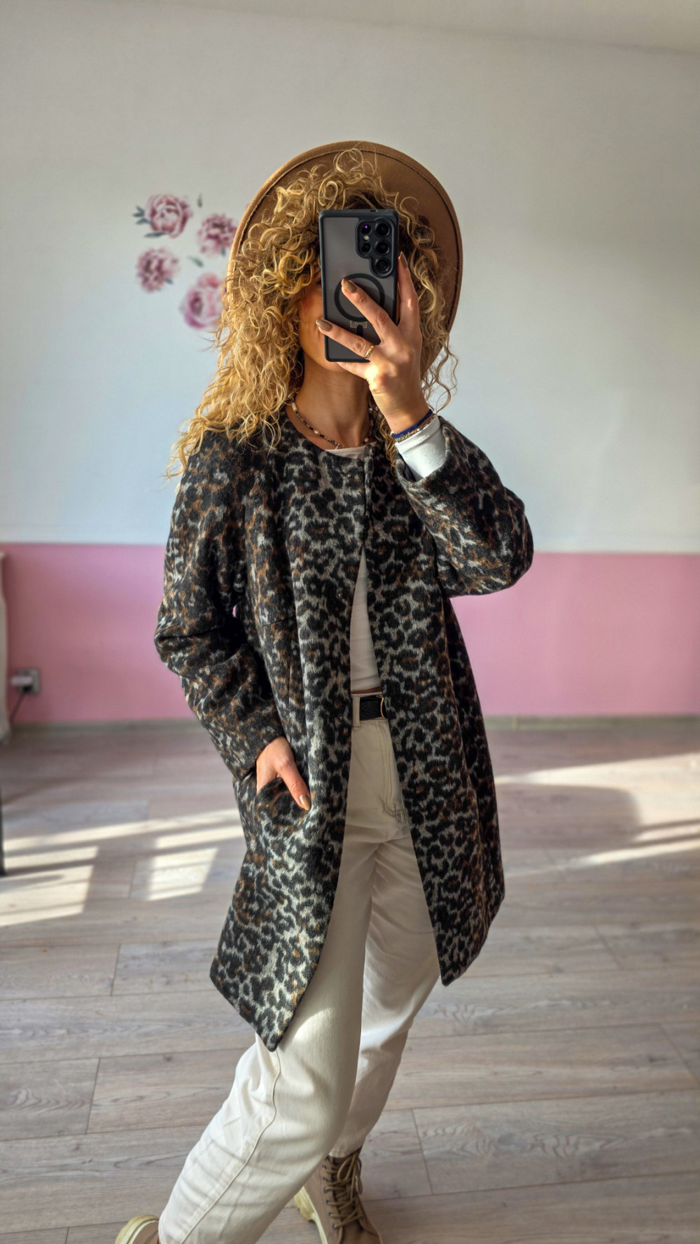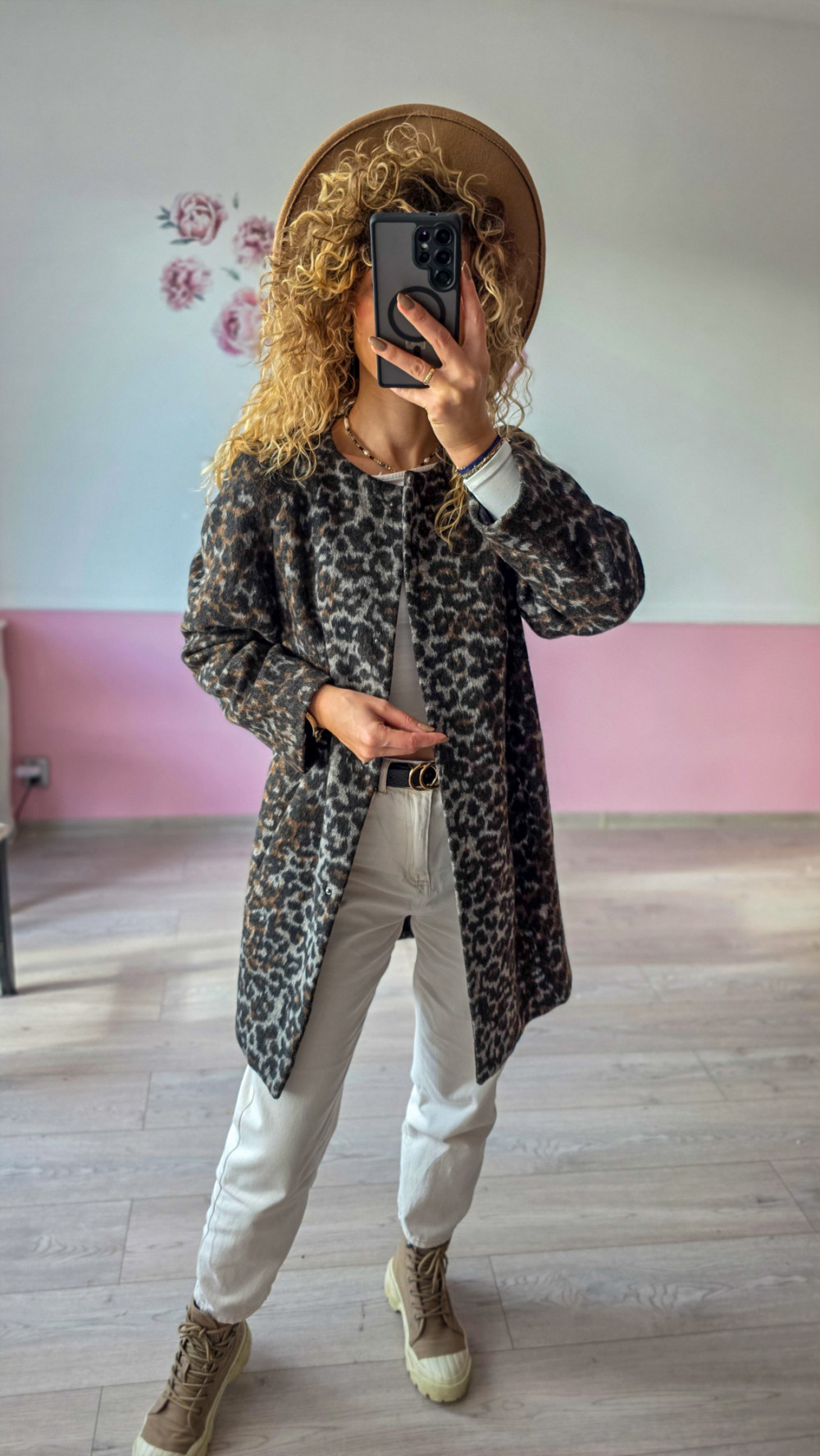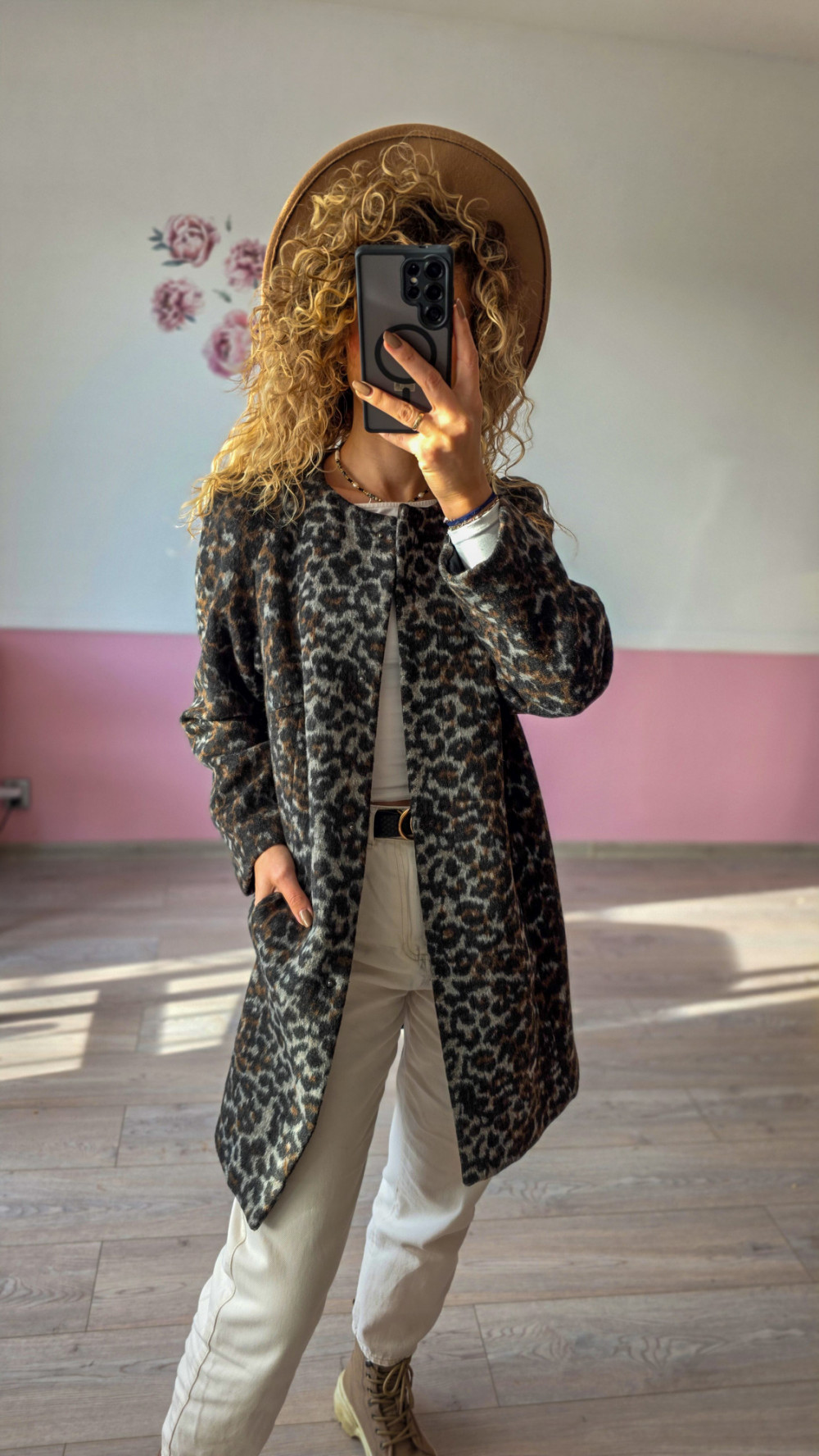 Wyjątkowy płaszcz damski w panterkę to propozycja dla kobiet, które lubią wyraziste wzory i modny, odważny styl. Miękka, lekko otulająca tkanina oraz prosty, długi krój sprawiają, że płaszcz świetnie układa się na sylwetce. Zapinany na napy, dzięki czemu pozostaje minimalistyczny, ale bardzo efektowny.