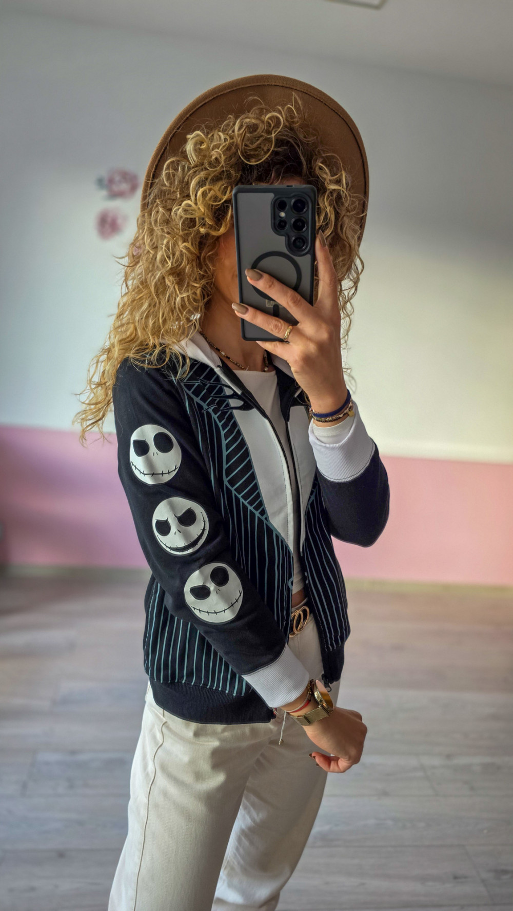 Wyjątkowa bluza damska z charakterystycznym motywem szkieletowych buziek to idealna propozycja dla miłośniczek niebanalnego stylu. Model przyciąga wzrok dzięki oryginalnym nadrukom na rękawach oraz kontrastowym paskom na froncie, które tworzą efekt stylizowanego “garniturowego” wzoru. Bluza jest zapinana na zamek, posiada kaptur oraz elastyczne ściągacze przy rękawach i u dołu, co zapewnia wygodę i idealne dopasowanie.