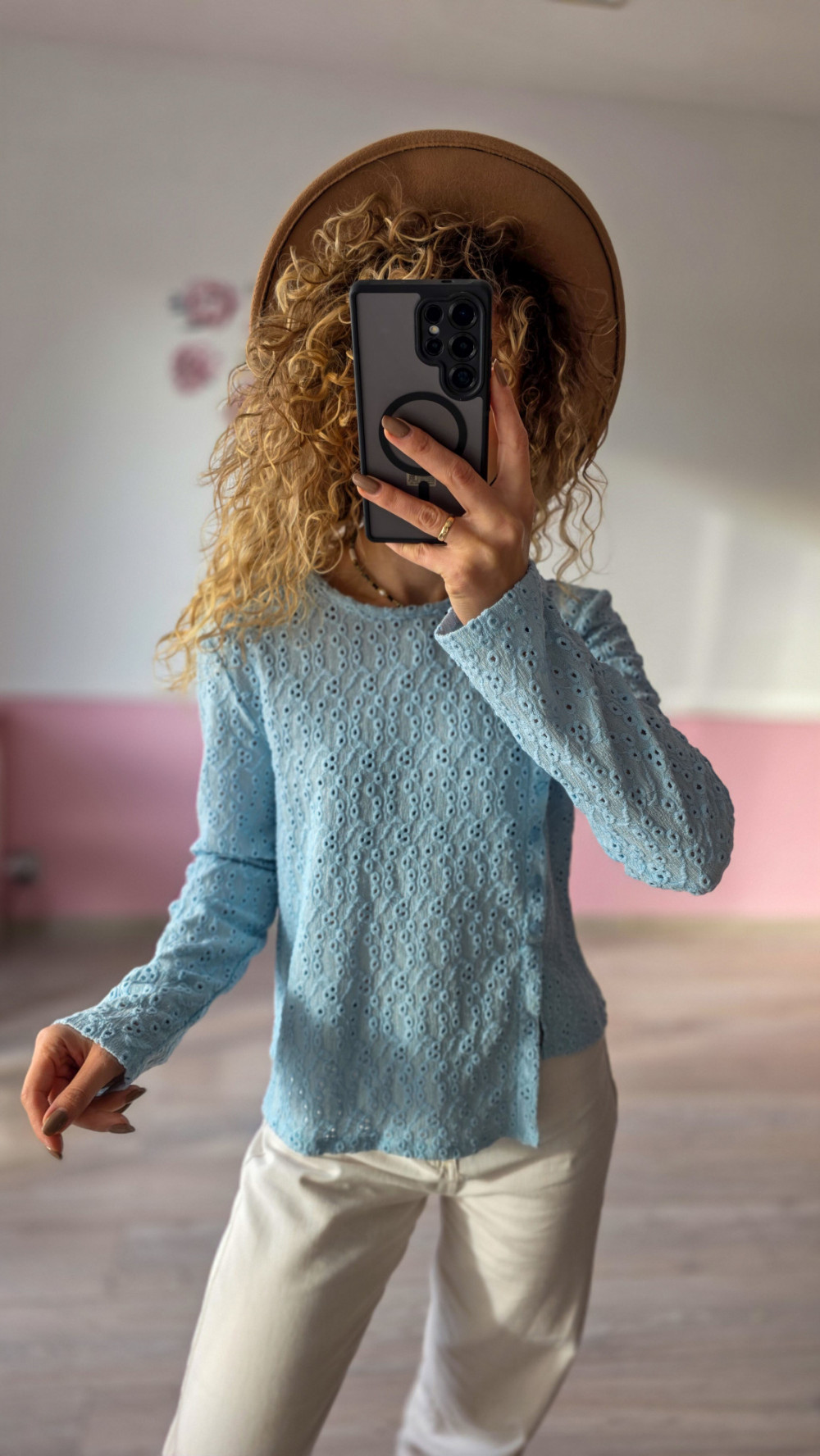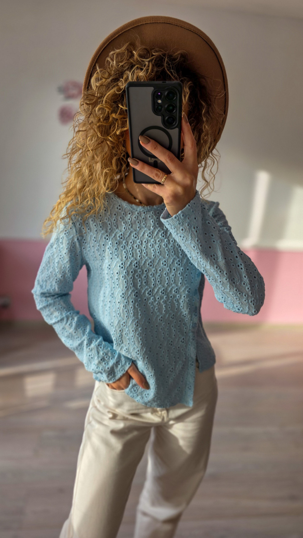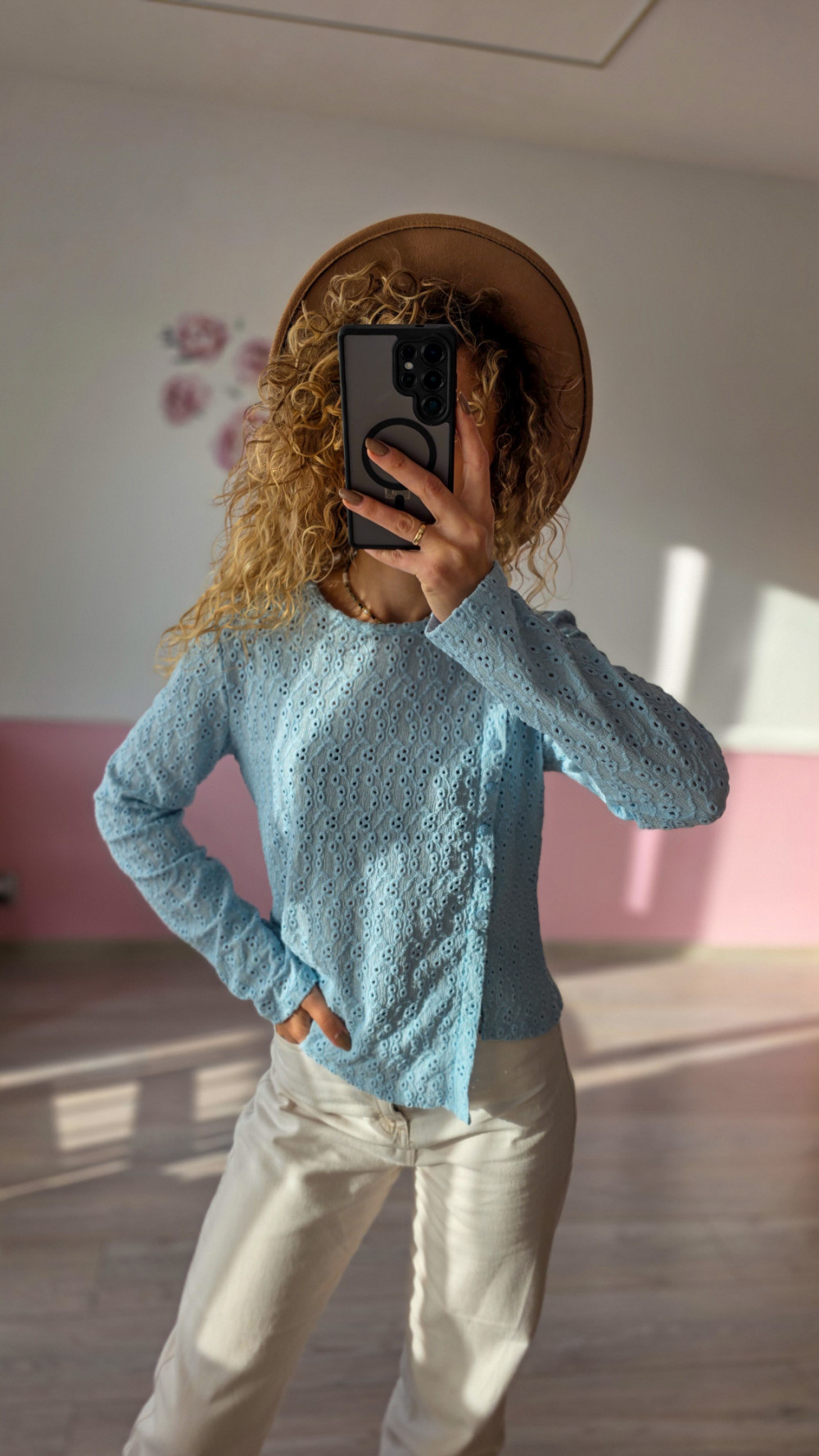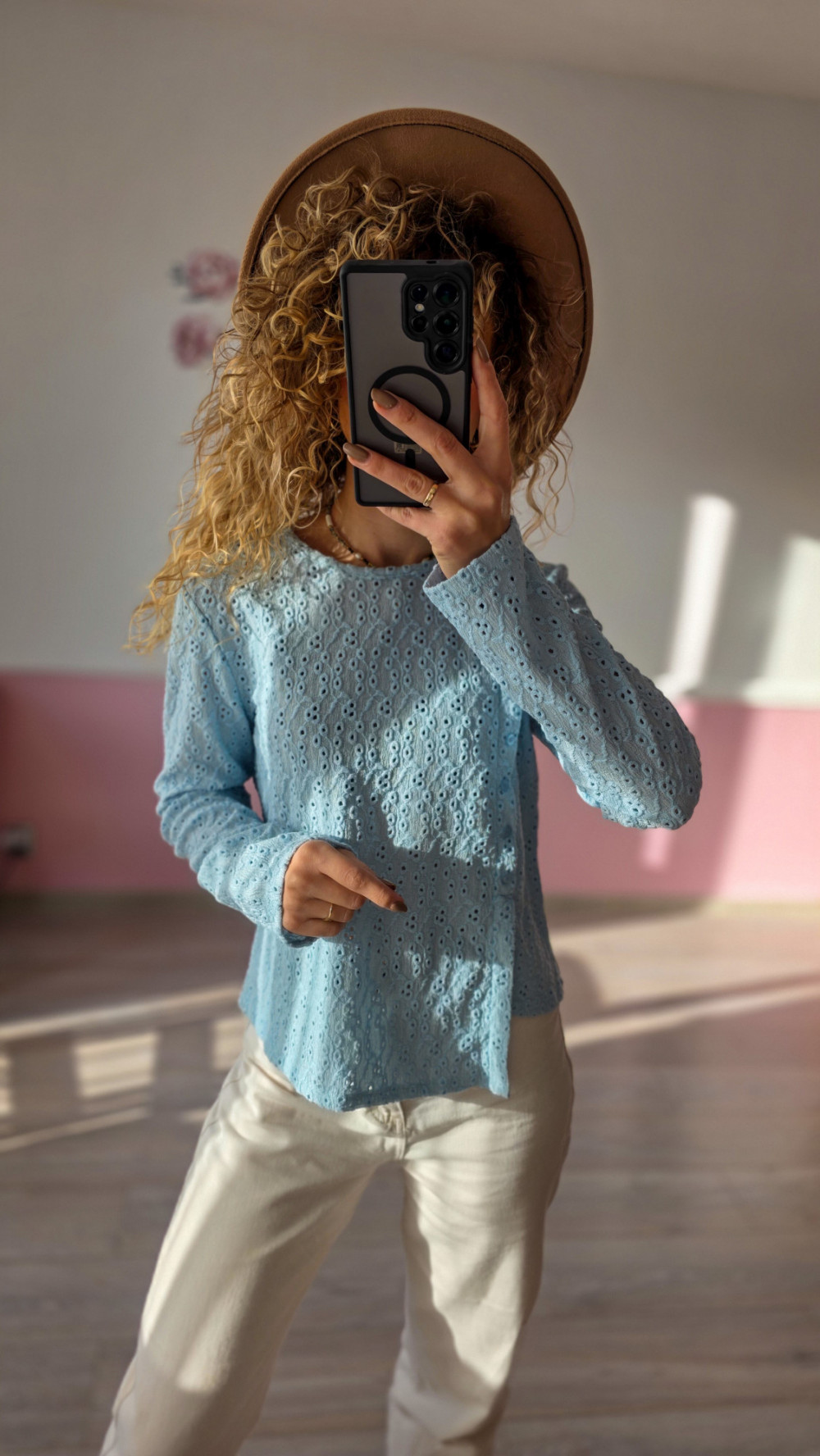 Ażurowa bluzka damska baby blue – bawełniana, romantyczna