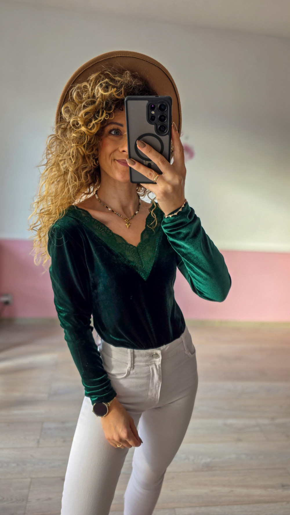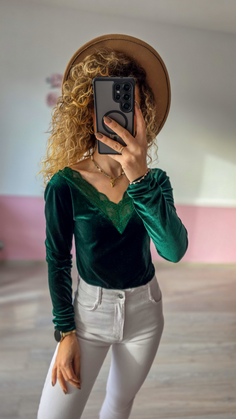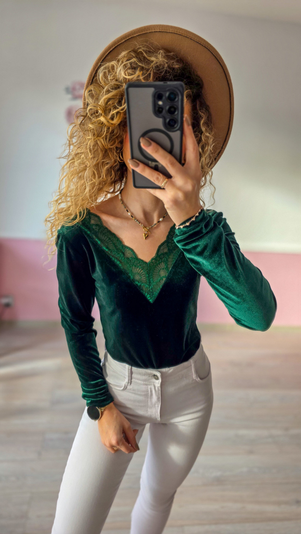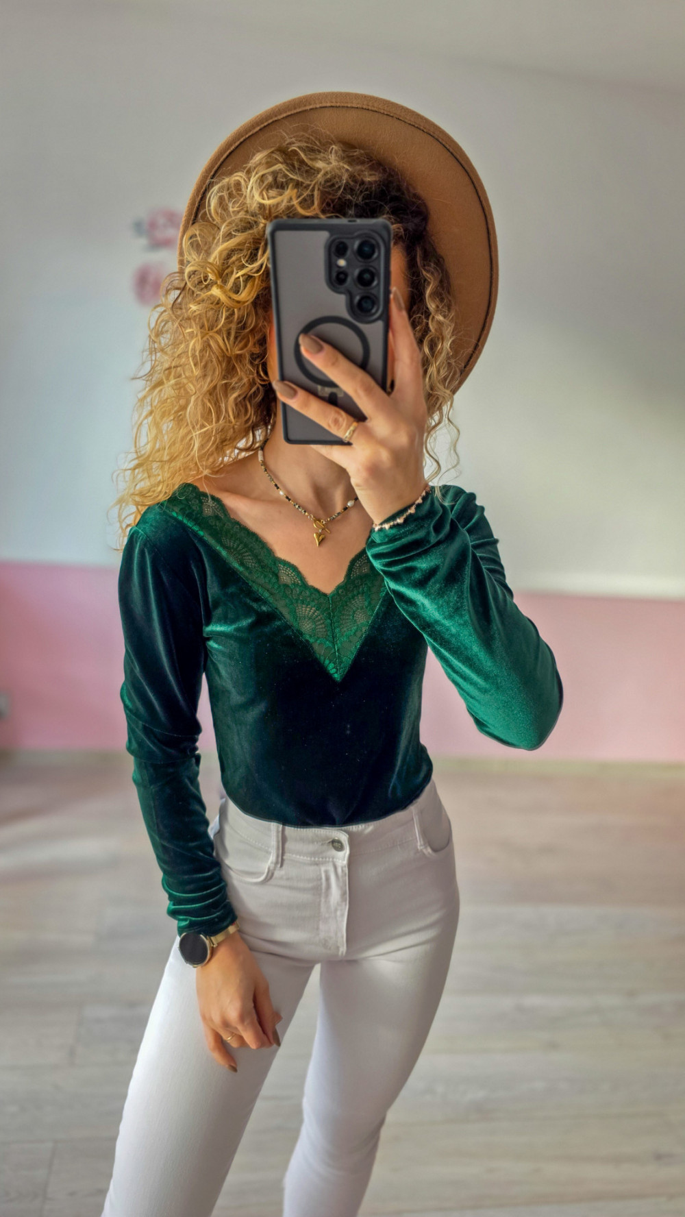 Body damskie welurowe zielone z koronką – eleganckie, dopasowane