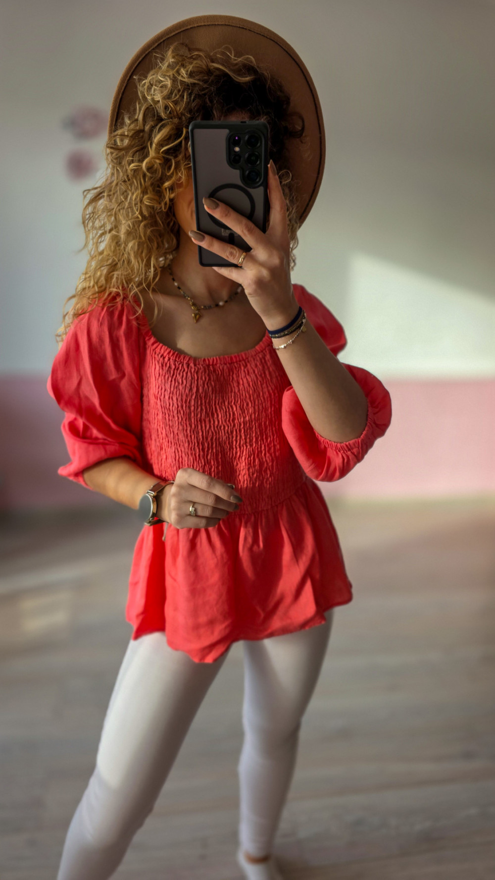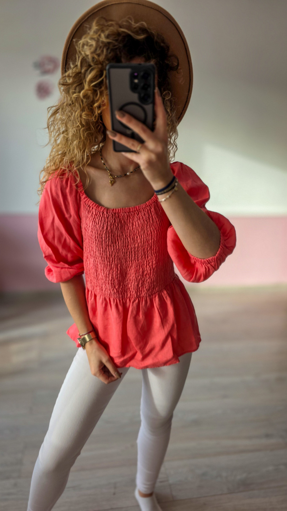 Koralowa bluzka damska z efektownymi bufkami to idealny wybór na wiosnę i lato. Góra wykończona jest elastycznym marszczeniem (smock), które ładnie dopasowuje się do biustu i podkreśla talię, a luźny dół tworzy dziewczęcą, rozkloszowaną linię. Dekolt w kształcie serca pięknie eksponuje szyję i obojczyki. Bluzka świetnie wygląda ze spodniami z wysokim stanem oraz spódnicami – w stylizacjach boho, romantycznych i casualowych.