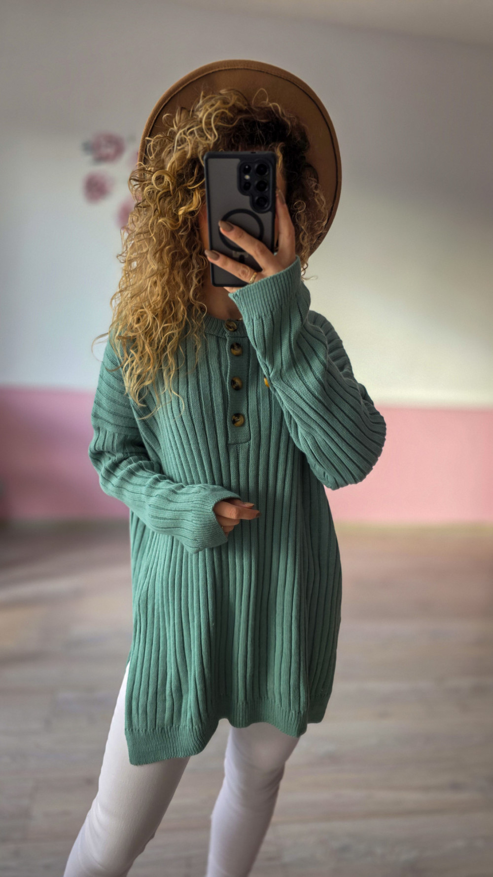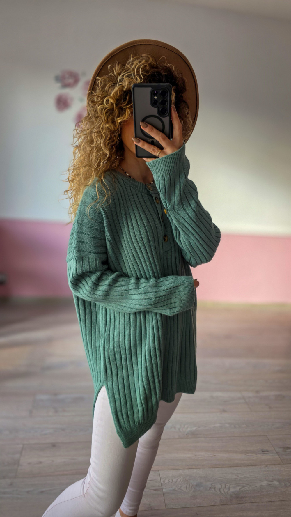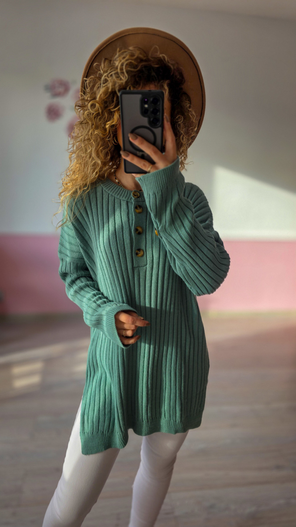 Miętowy, prążkowany sweter damski o wydłużonym kroju to idealny wybór na chłodniejsze dni. Wykonany z miękkiej, elastycznej dzianiny, która zapewnia komfort i otulenie. Model posiada dekolt zapinany na ozdobne guziki oraz luźny, oversize’owy fason, który pasuje do legginsów, rurek i zimowych stylizacji.