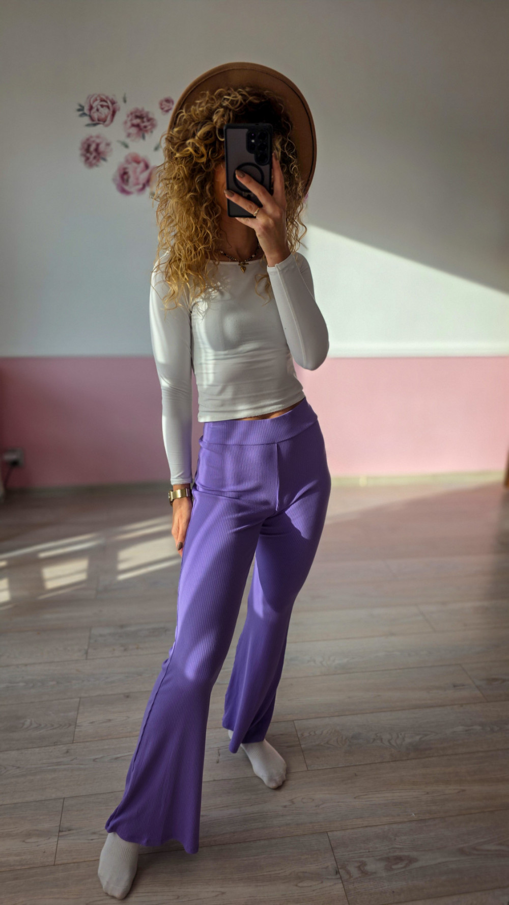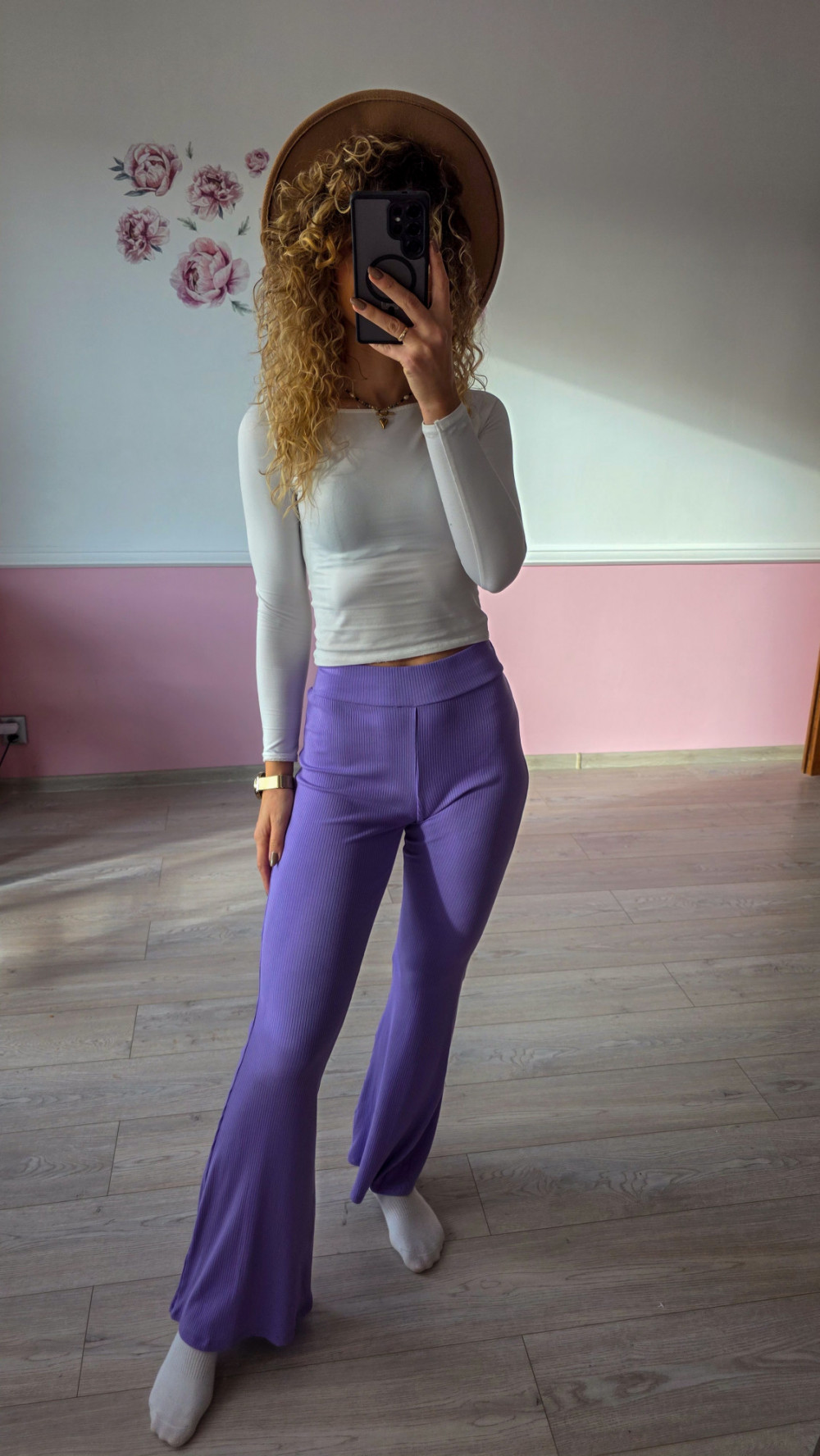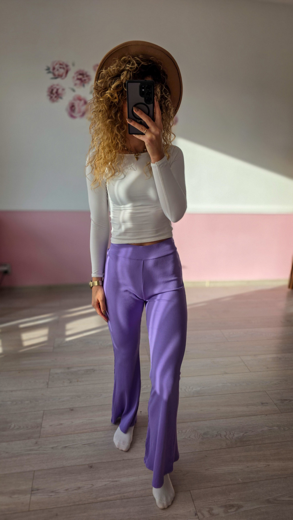 Fioletowe spodnie z prążkowanej dzianiny to idealne połączenie wygody i modowego charakteru. Uszyte z miękkiego, rozciągliwego materiału, zapewniają komfort noszenia przez cały dzień. Wysoki stan pięknie modeluje talię, a rozszerzana nogawka nadaje sylwetce proporcji i subtelnej lekkości.
