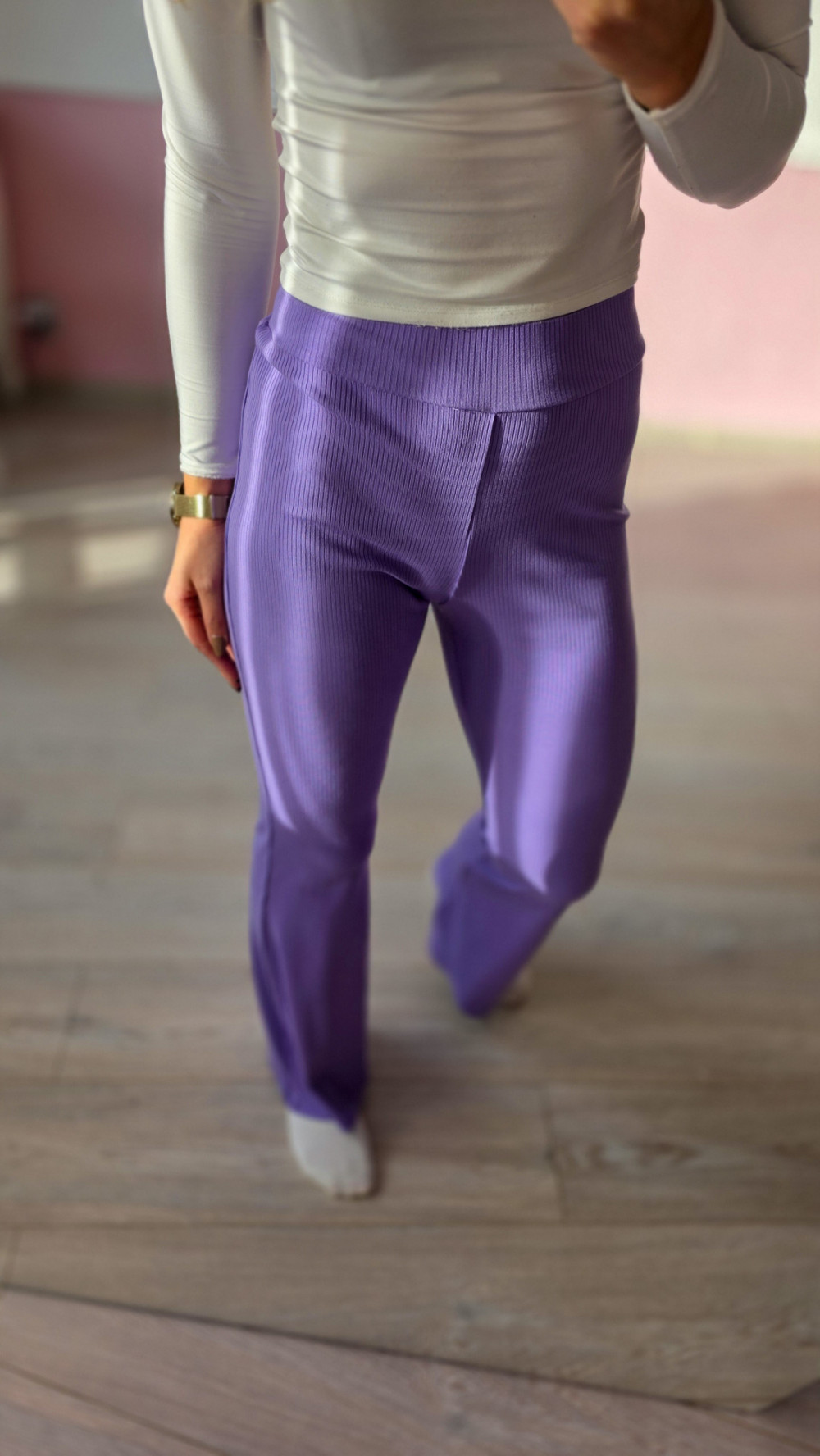 Fioletowe prążkowane spodnie z rozszerzaną nogawką