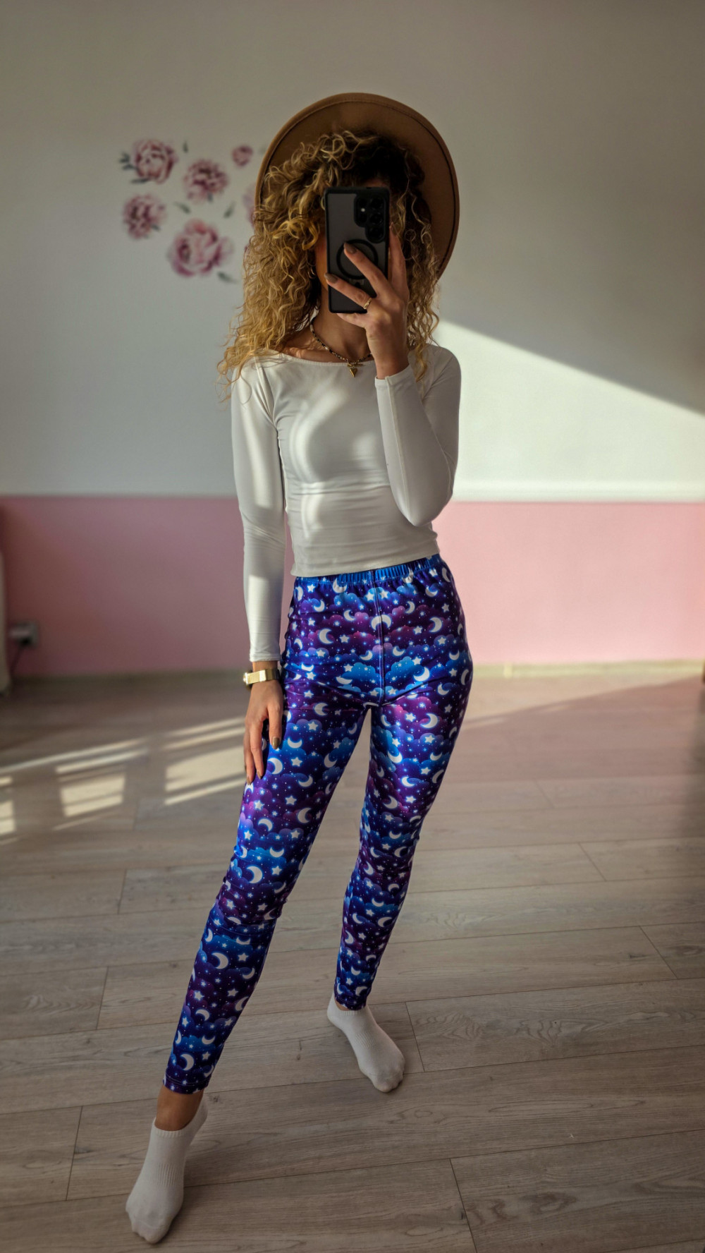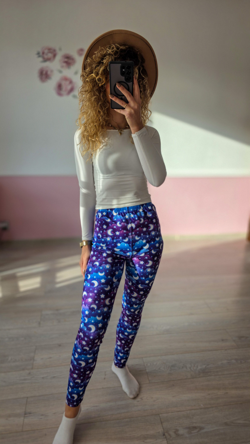 Legginsy „Moon & Stars” to wyjątkowy model dla kobiet, które kochają wygodę połączoną z oryginalnym, niepowtarzalnym stylem. Wykonane z elastycznego, oddychającego materiału, perfekcyjnie dopasowują się do sylwetki, podkreślając nogi i zapewniając pełną swobodę ruchu. Intensywny nadruk w księżyce, gwiazdki i galaktyczne motywy sprawia, że to idealny wybór dla miłośniczek modnych i wyrazistych legginsów.