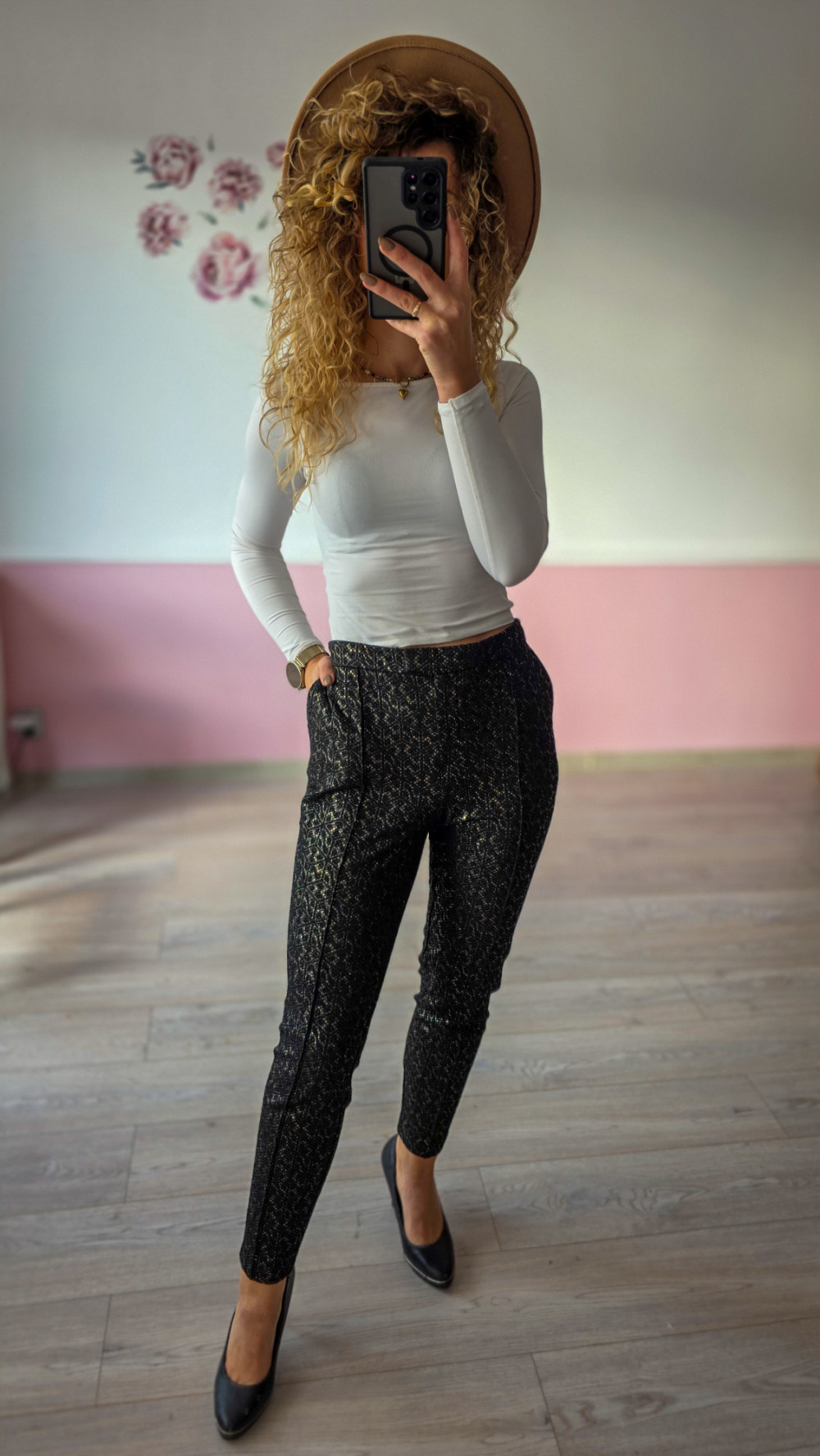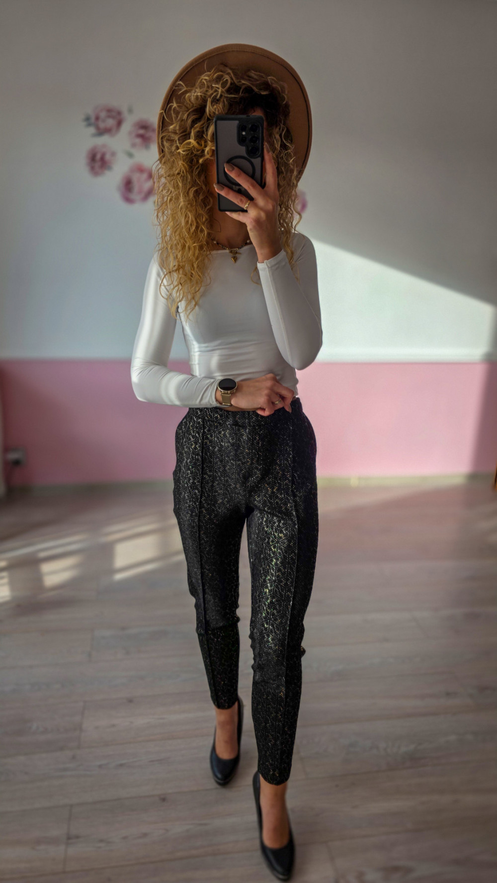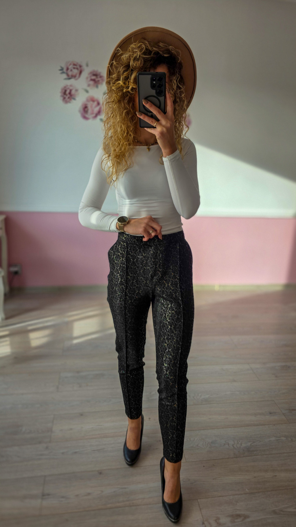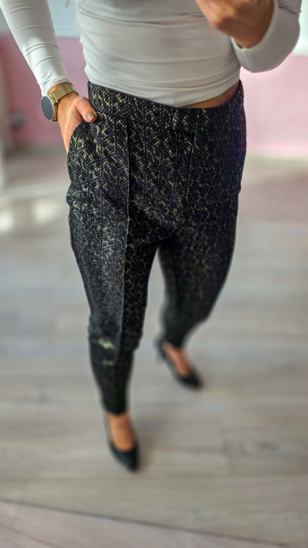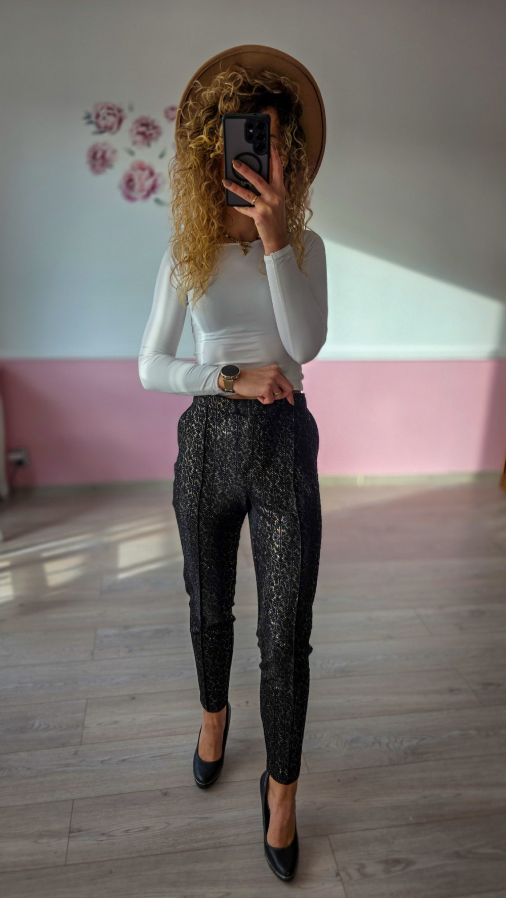 Czarne spodnie w złoty wzór – eleganckie cygaretki