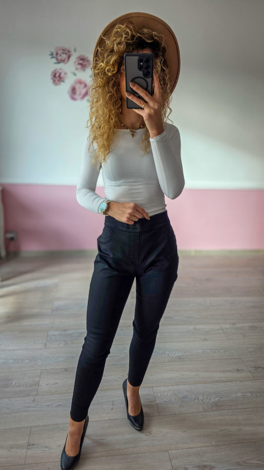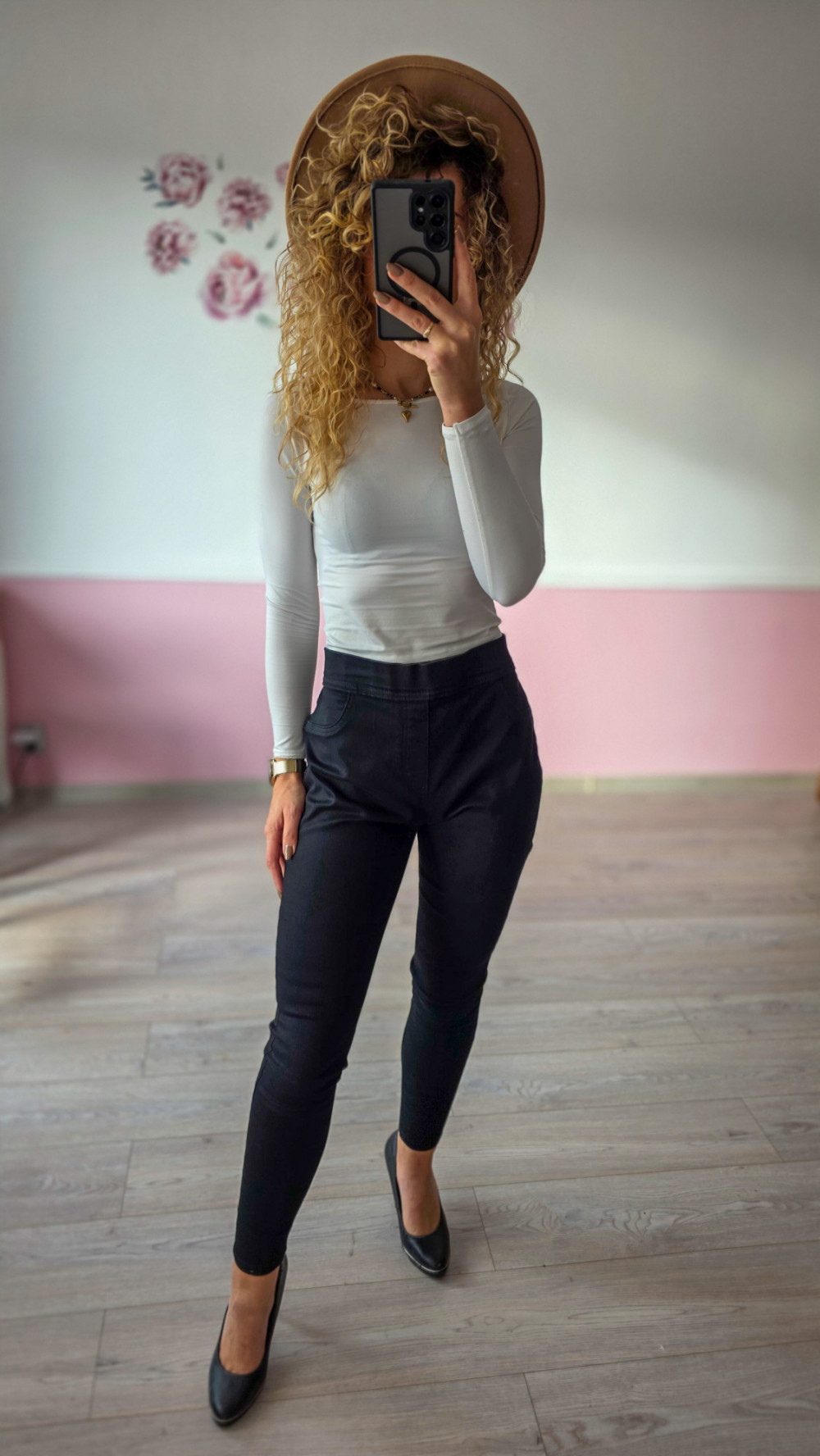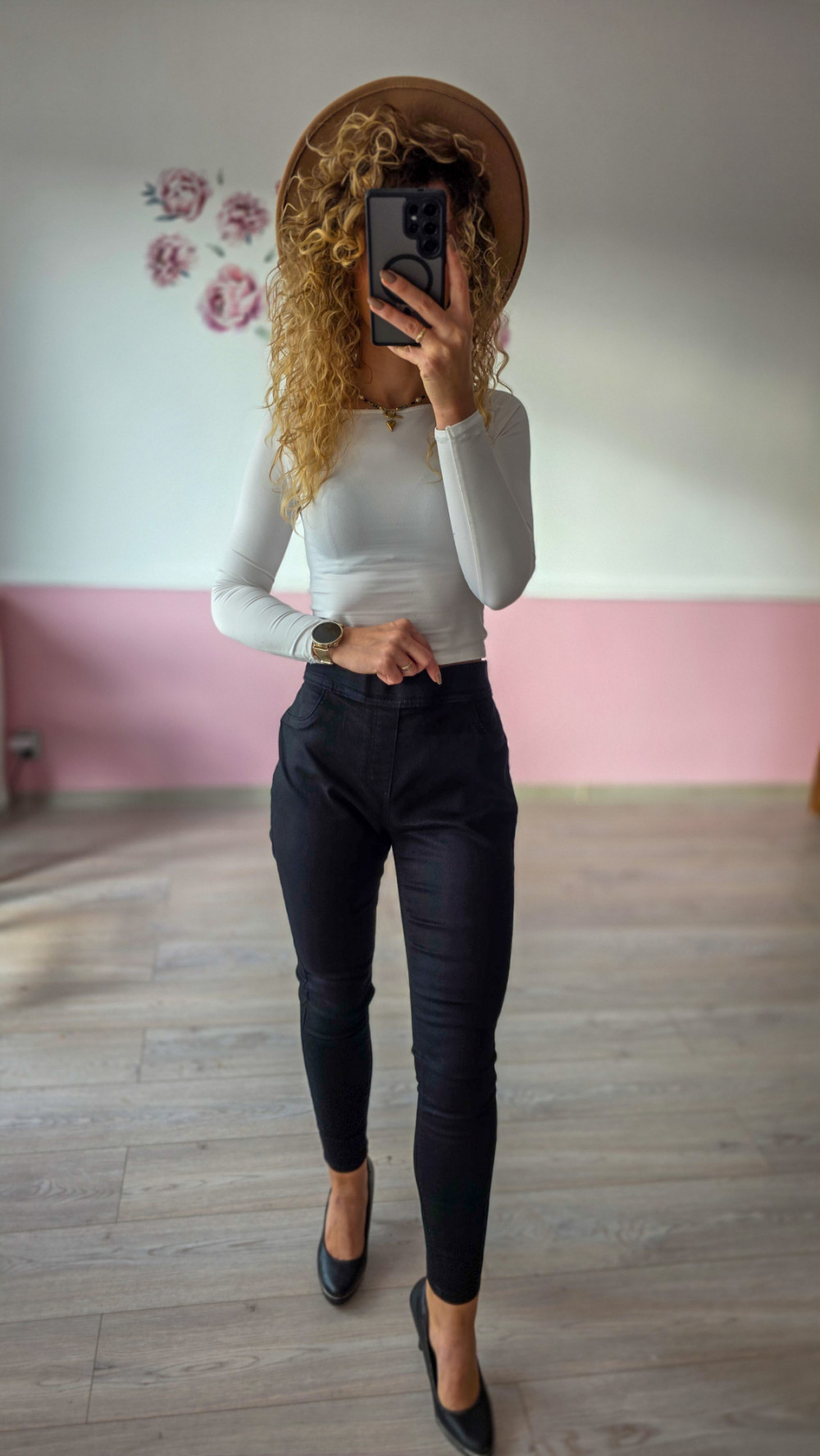 Klasyczne czarne spodnie damskie o dopasowanym kroju to niezastąpiona baza w każdej szafie. Model wykonany z elastycznego materiału, który miękko otula sylwetkę, nie opinając nadmiernie nóg. Wysoki stan wysmukla talię i zapewnia wygodę w ciągu całego dnia – nic się nie zsuwa, nic nie uciska. Gładka, jednolita tkanina sprawia, że spodnie świetnie sprawdzą się do pracy, na spotkania biznesowe, ale też w codziennych stylizacjach z T-shirtem czy swetrem. Idealne do balerinek, szpilek i botków.