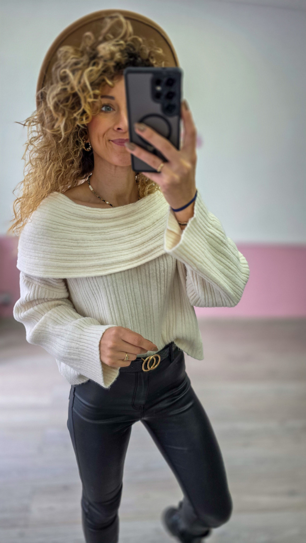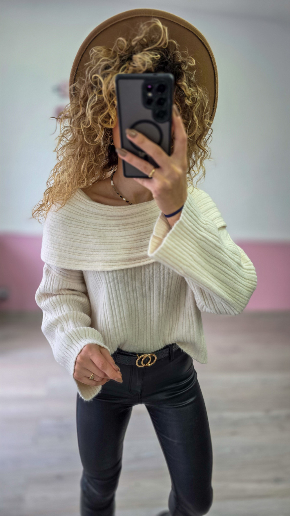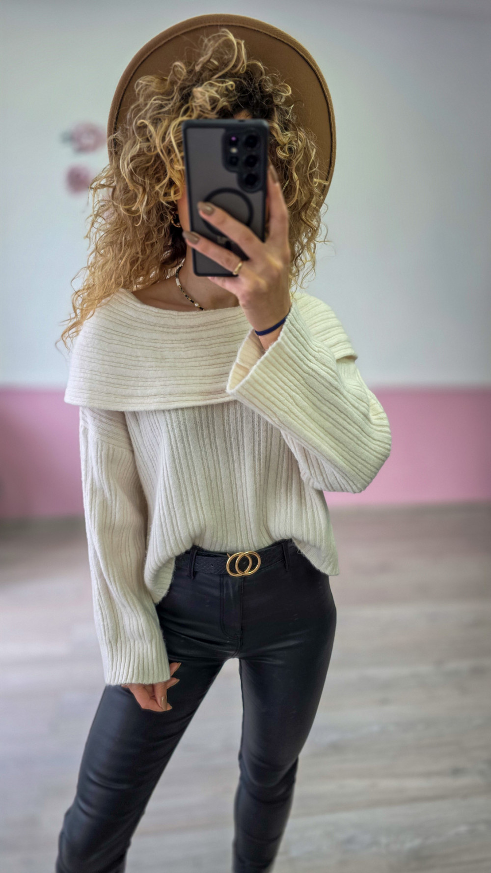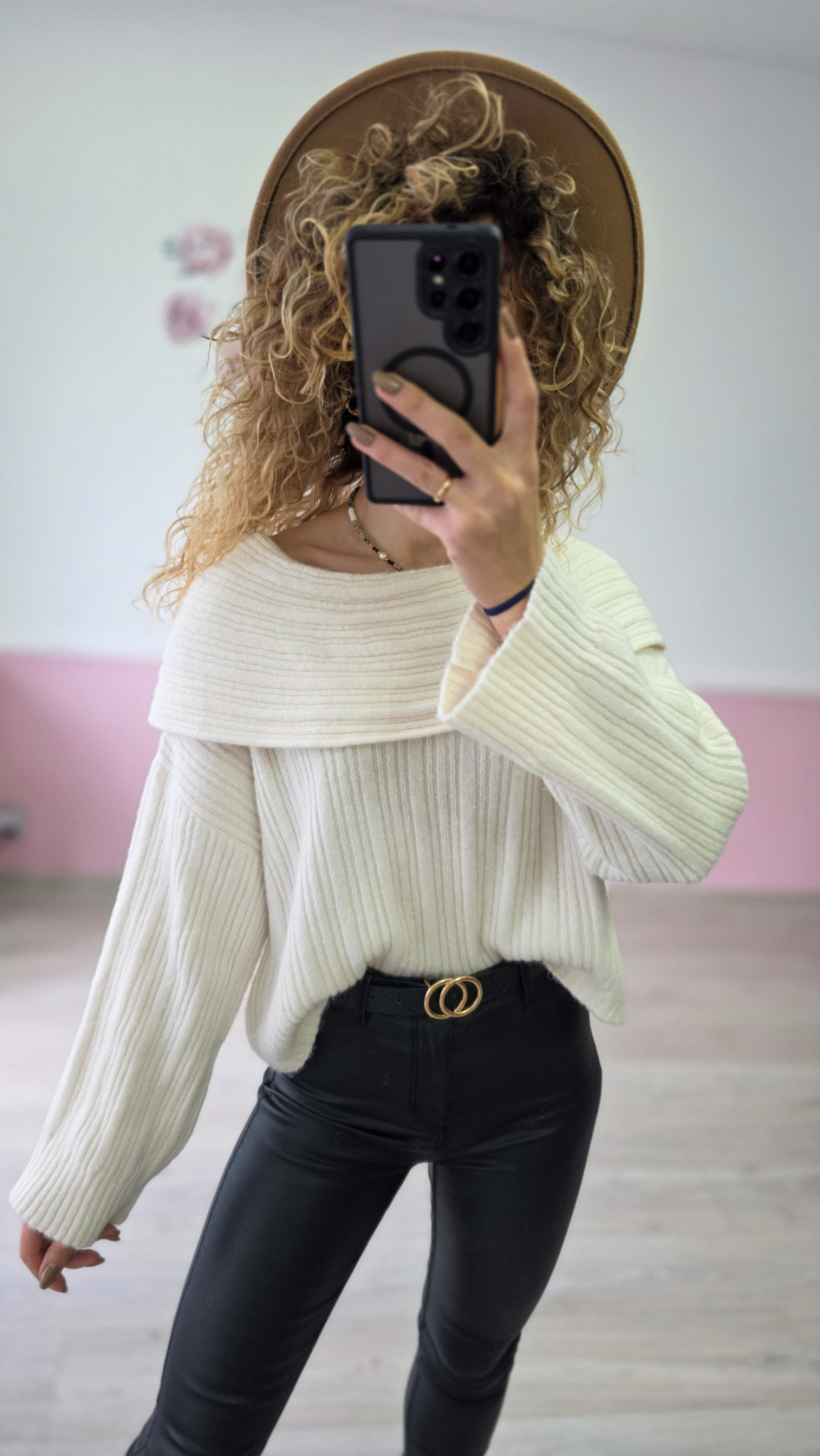 Sweter z szerokim, opadającym kołnierzem – kremowy S/M