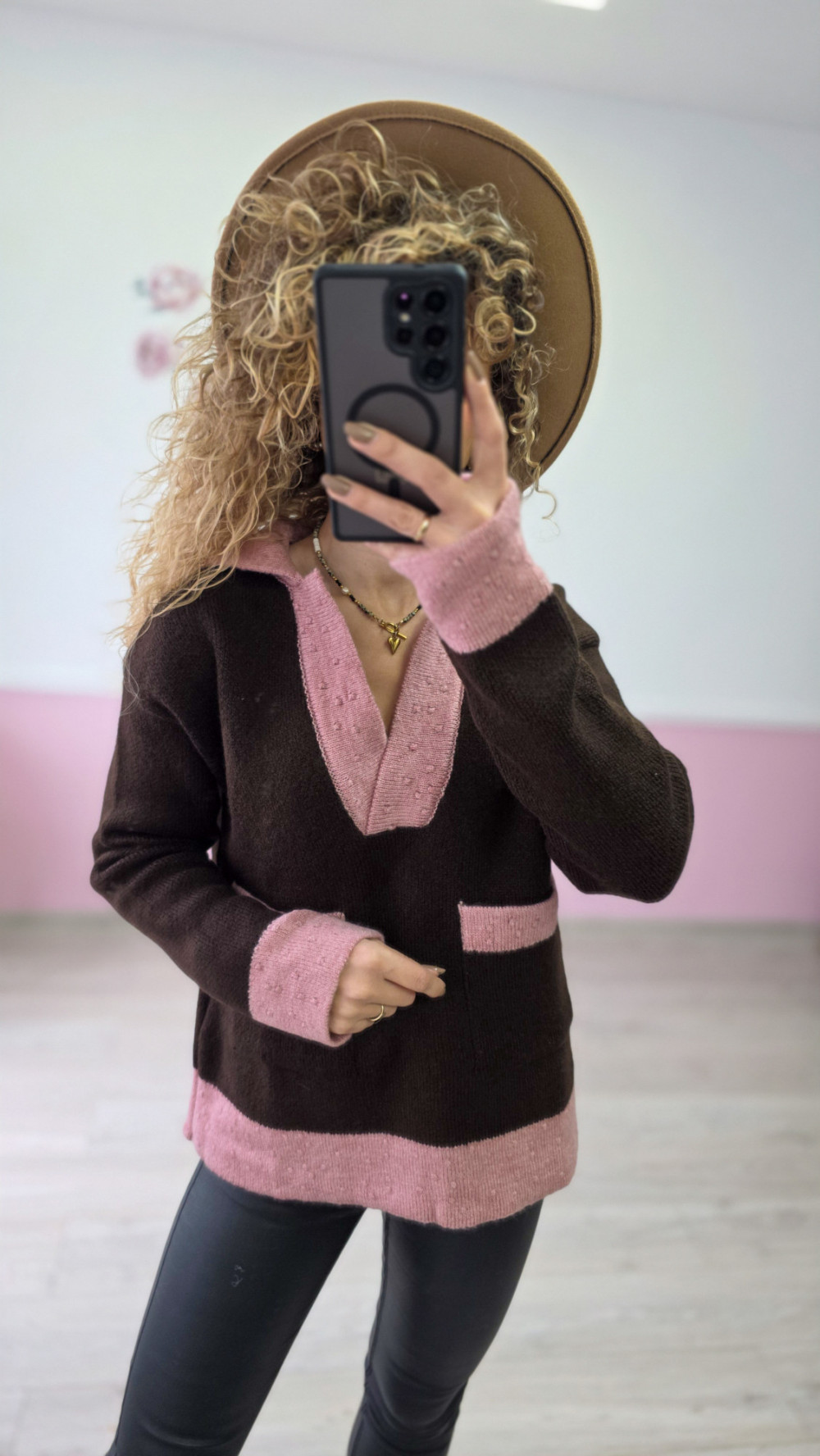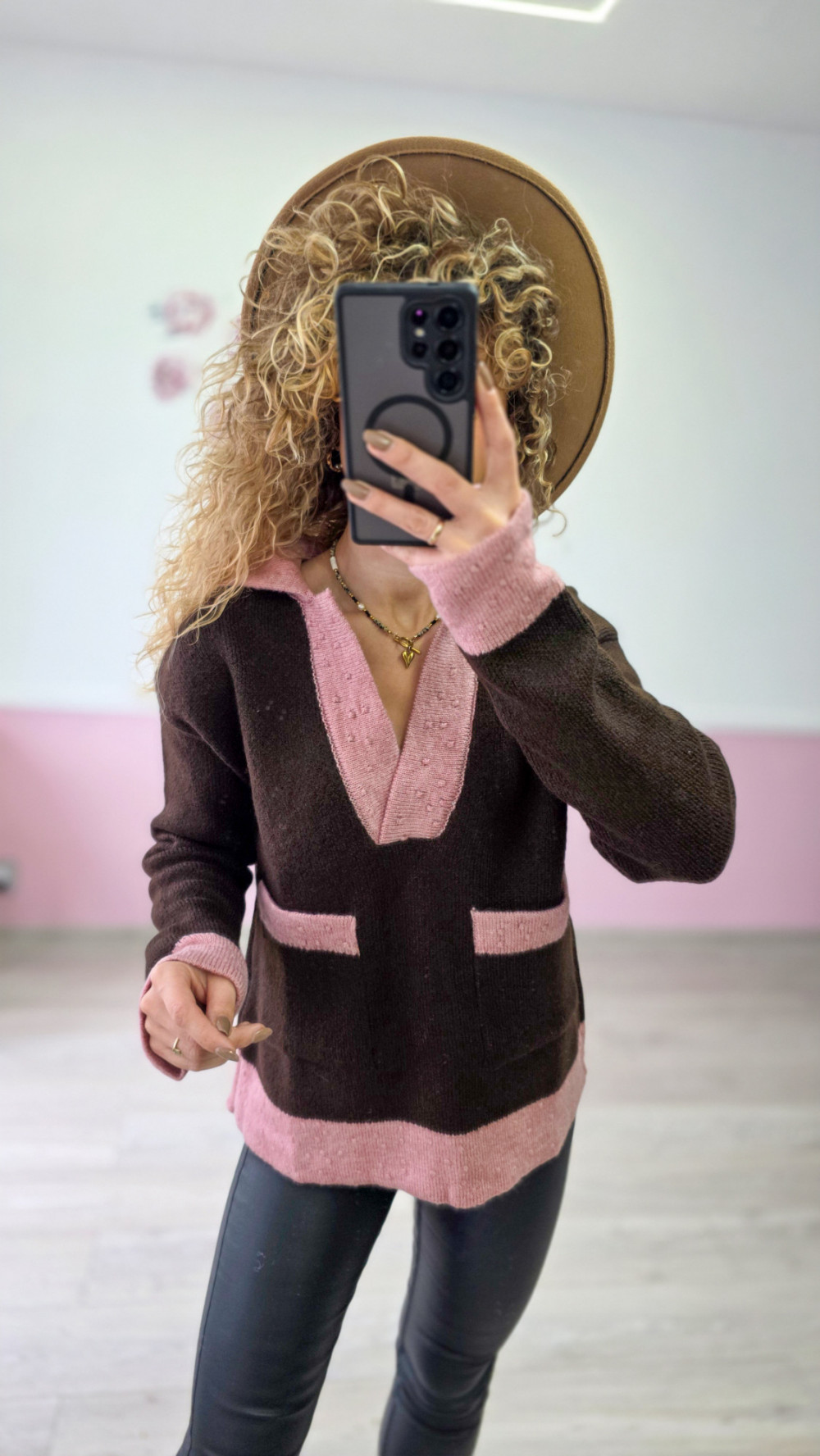 Dwukolorowy sweter z kontrastowymi wykończeniami – brąz & pudrowy róż S/M