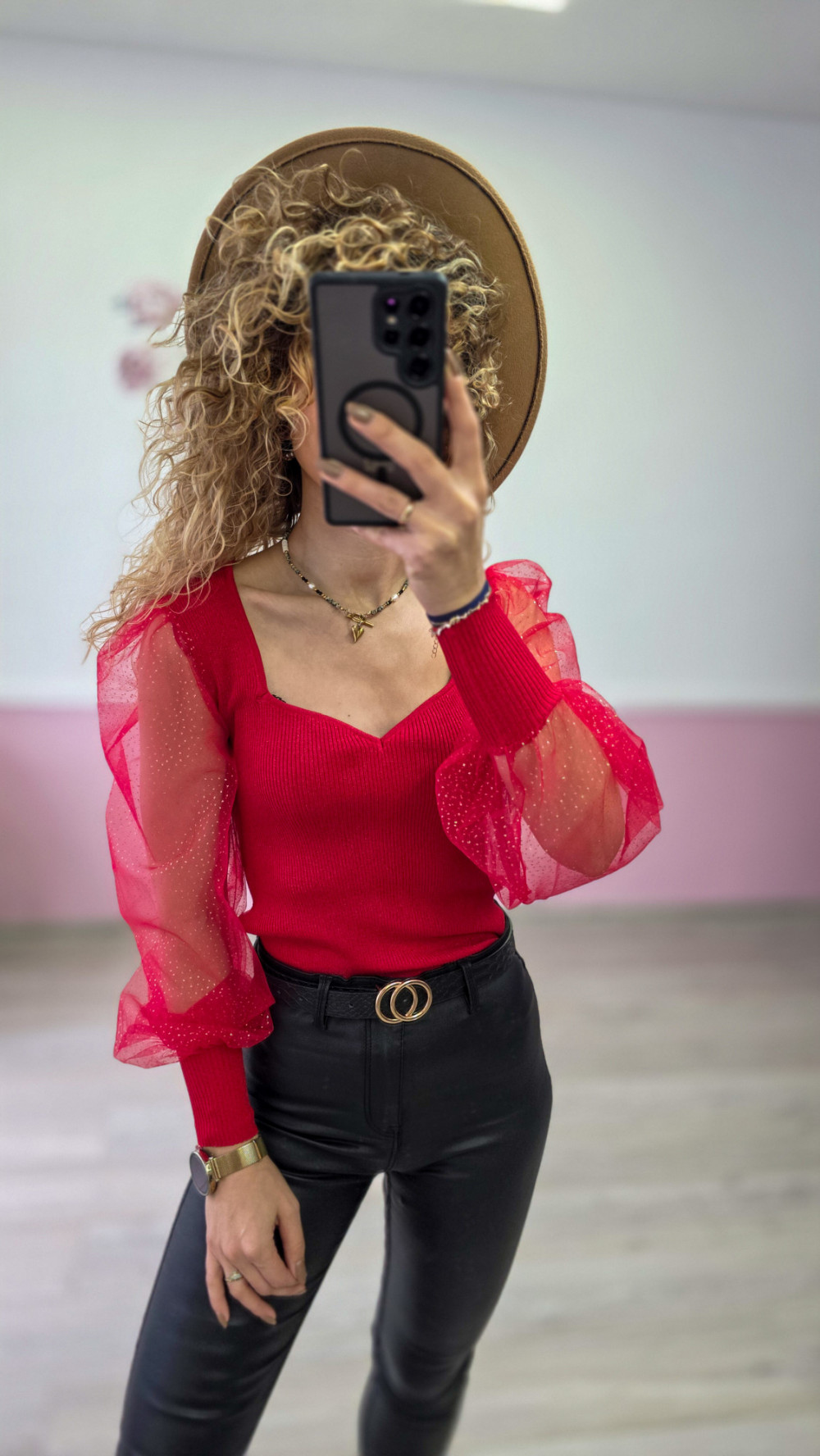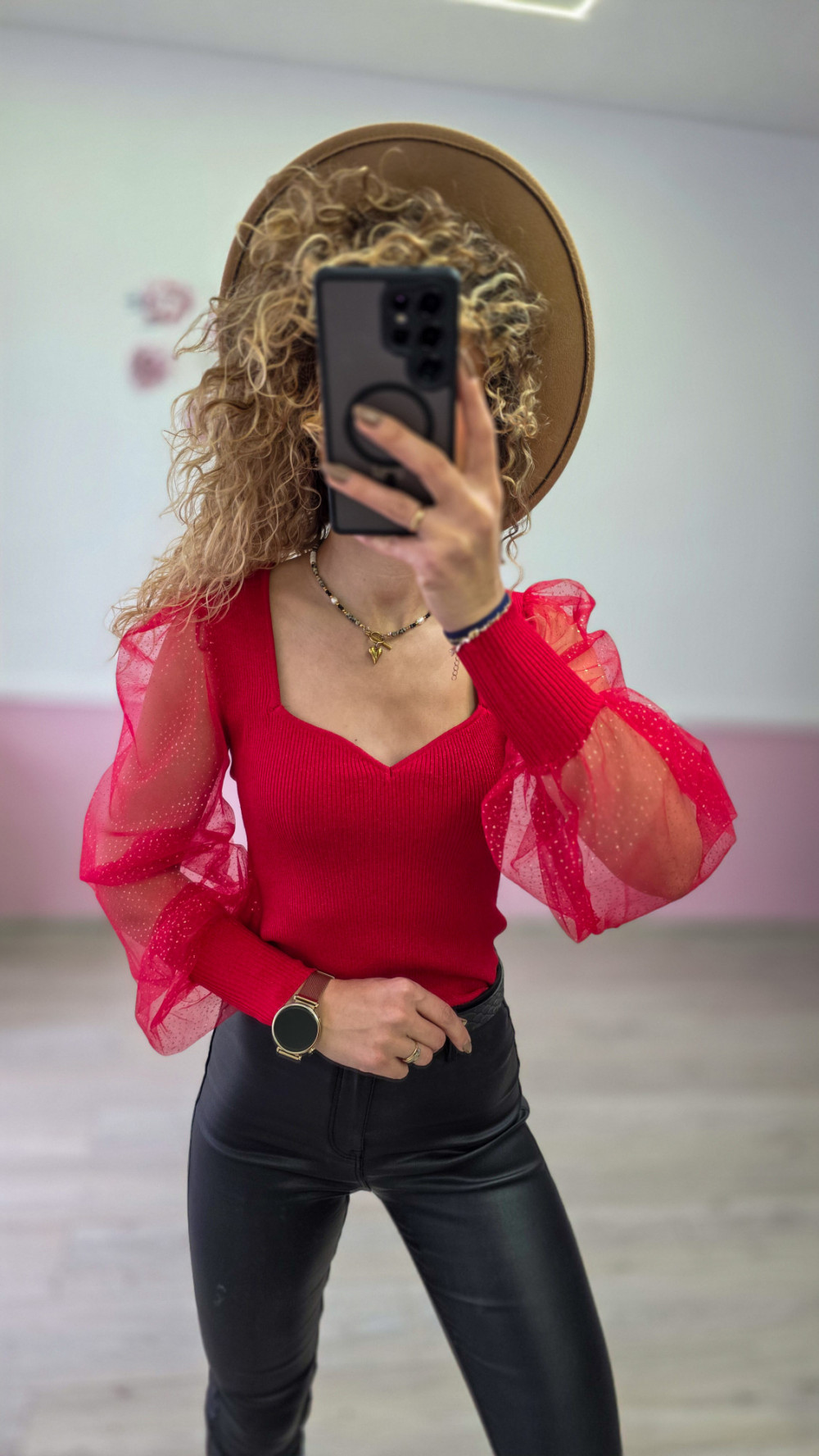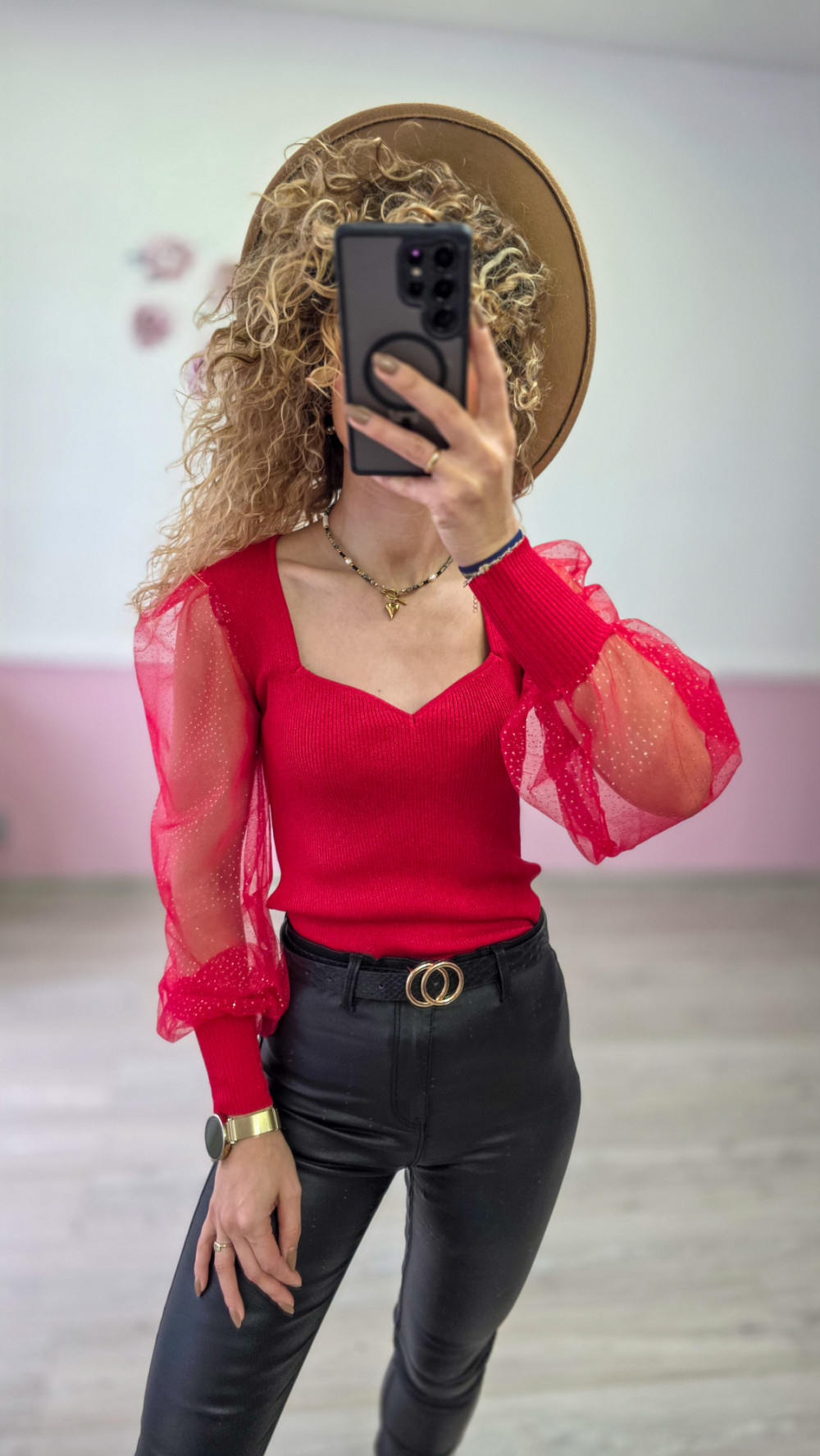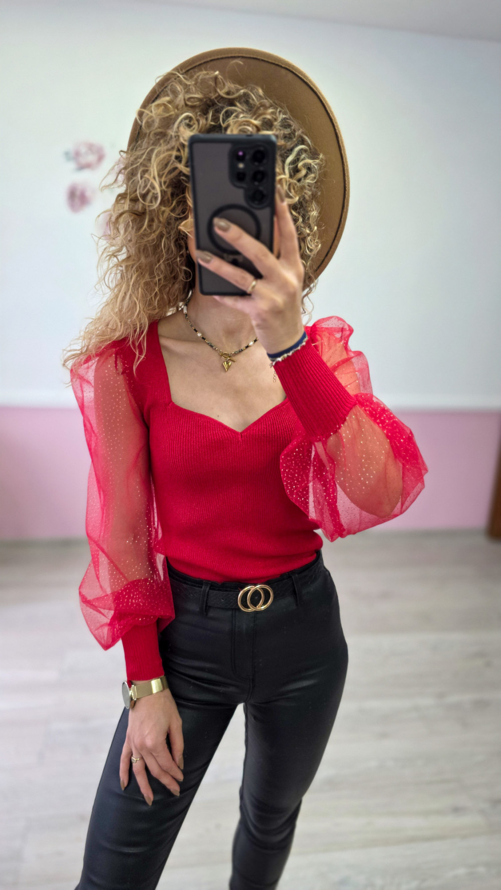 Elegancka bluzka z tiulowymi rękawami – intensywna czerwień