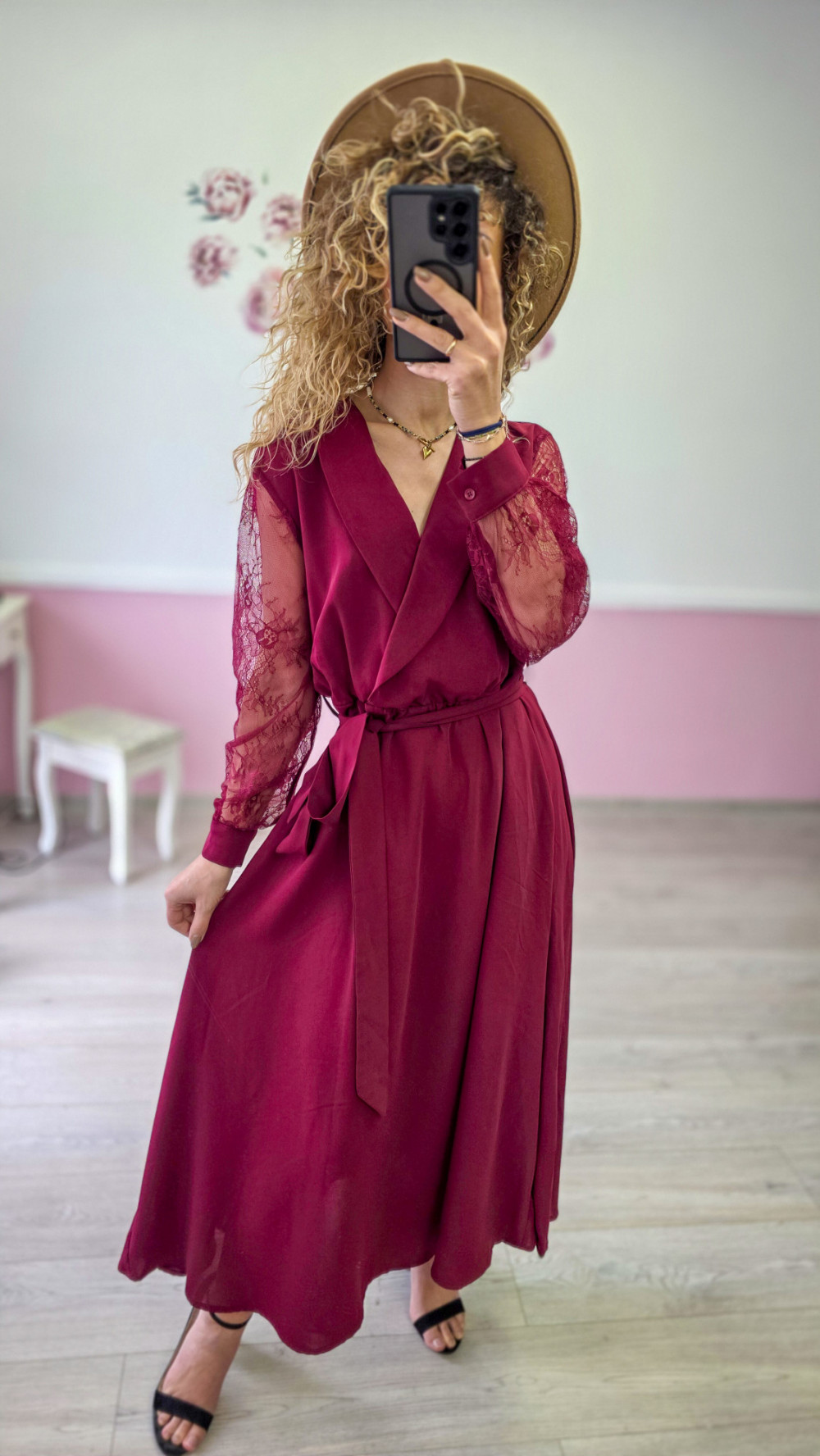 Długa sukienka z dekoltem na zakładkę i koronkowymi rękawami
