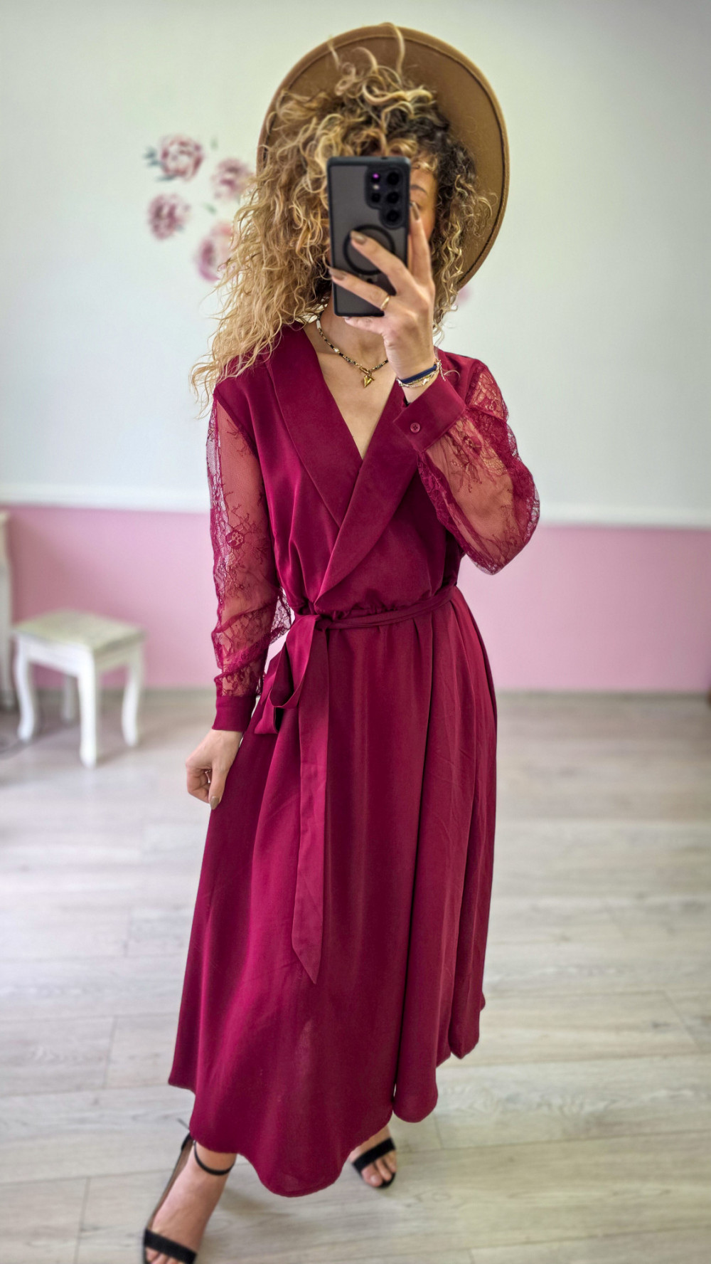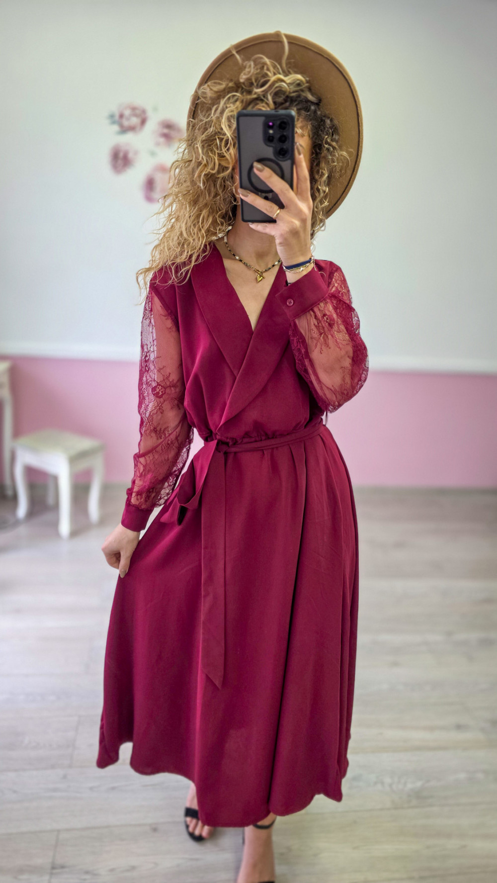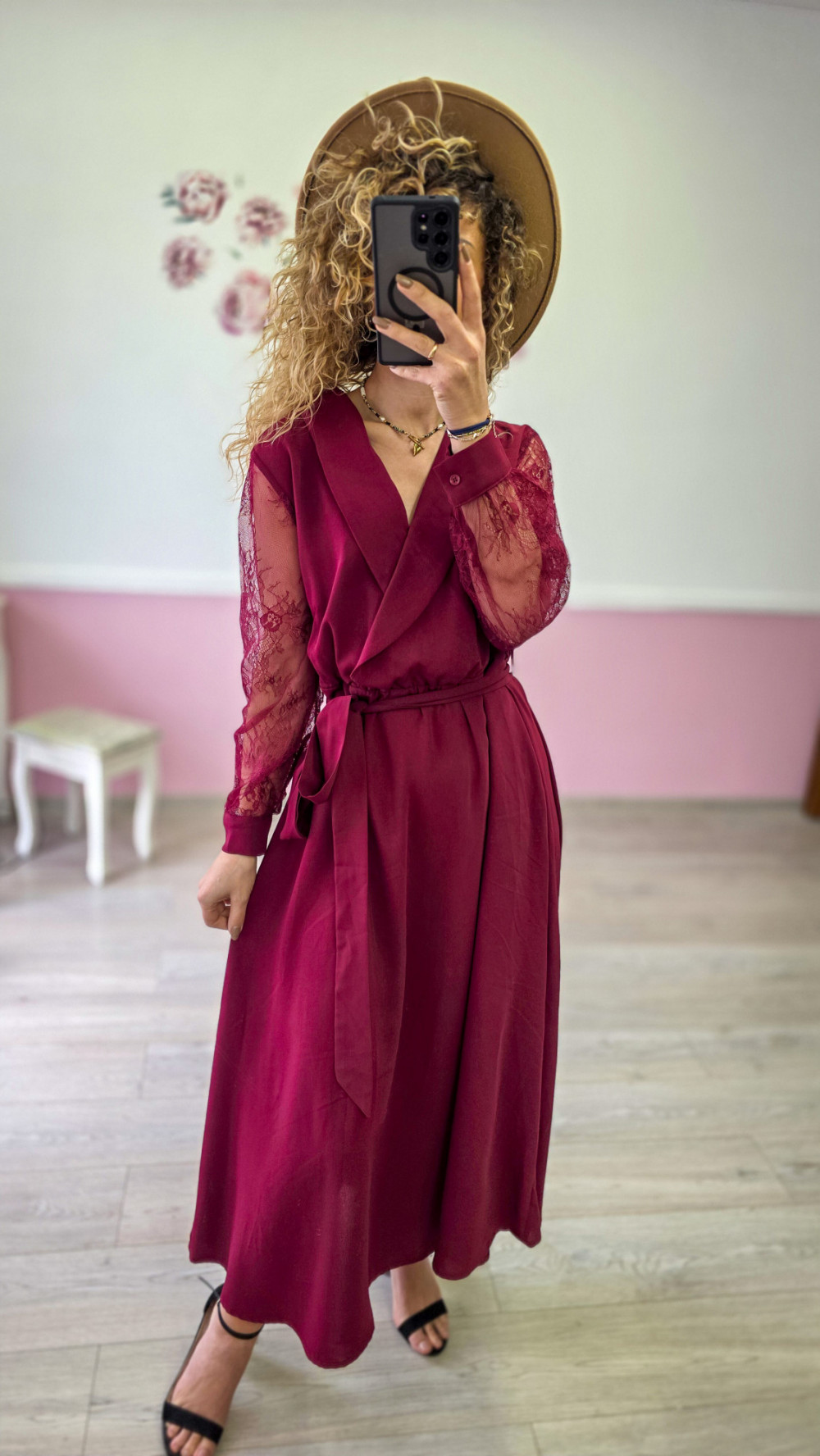 Elegancka, długa sukienka o kobiecym i niezwykle stylowym kroju. Model posiada dekolt na zakładkę, który pięknie podkreśla linię szyi i biustu. Rękawy wykonane są z delikatnej koronki, co dodaje całości lekkości i romantycznego charakteru. W talii znajduje się elastyczna gumka, dzięki której sukienka idealnie dopasowuje się do sylwetki, a dołączony pasek pozwala dodatkowo podkreślić figurę.