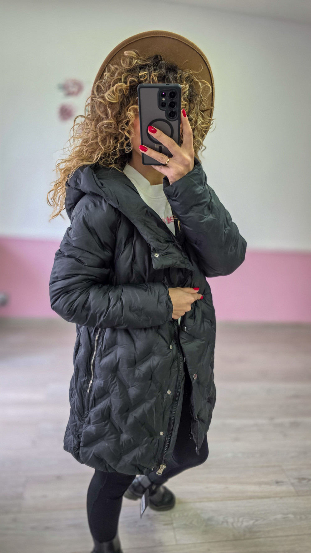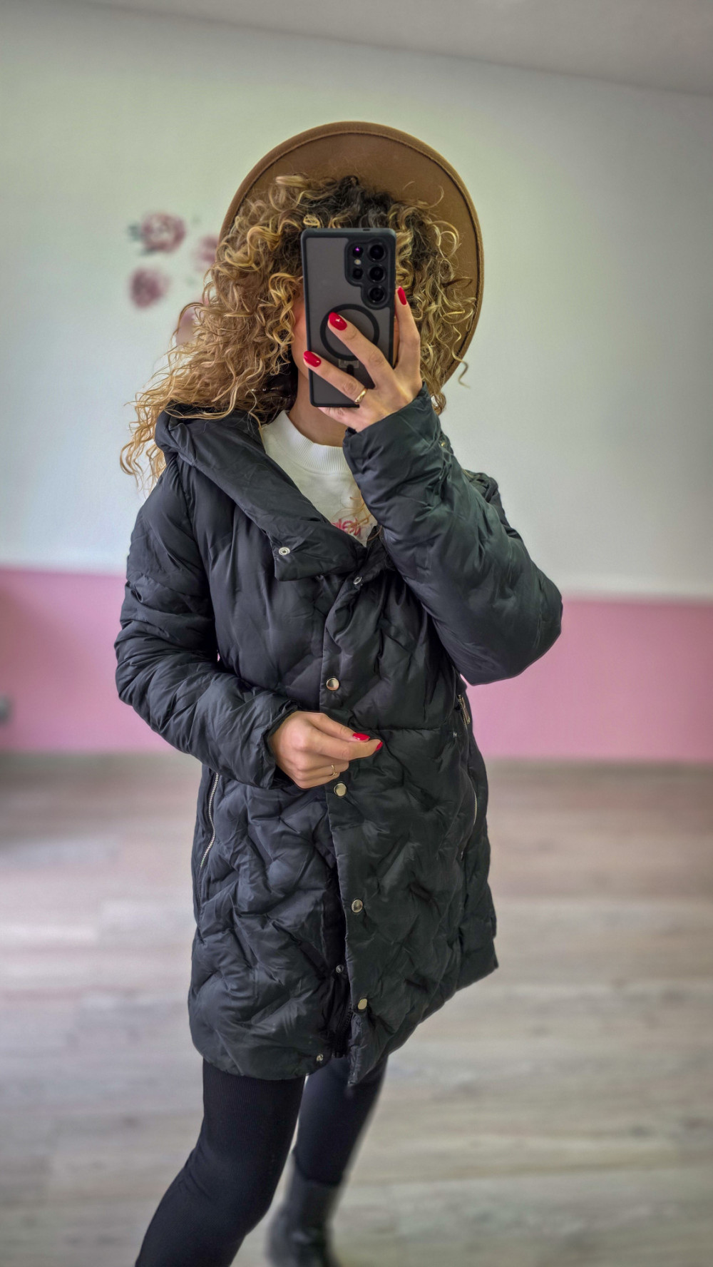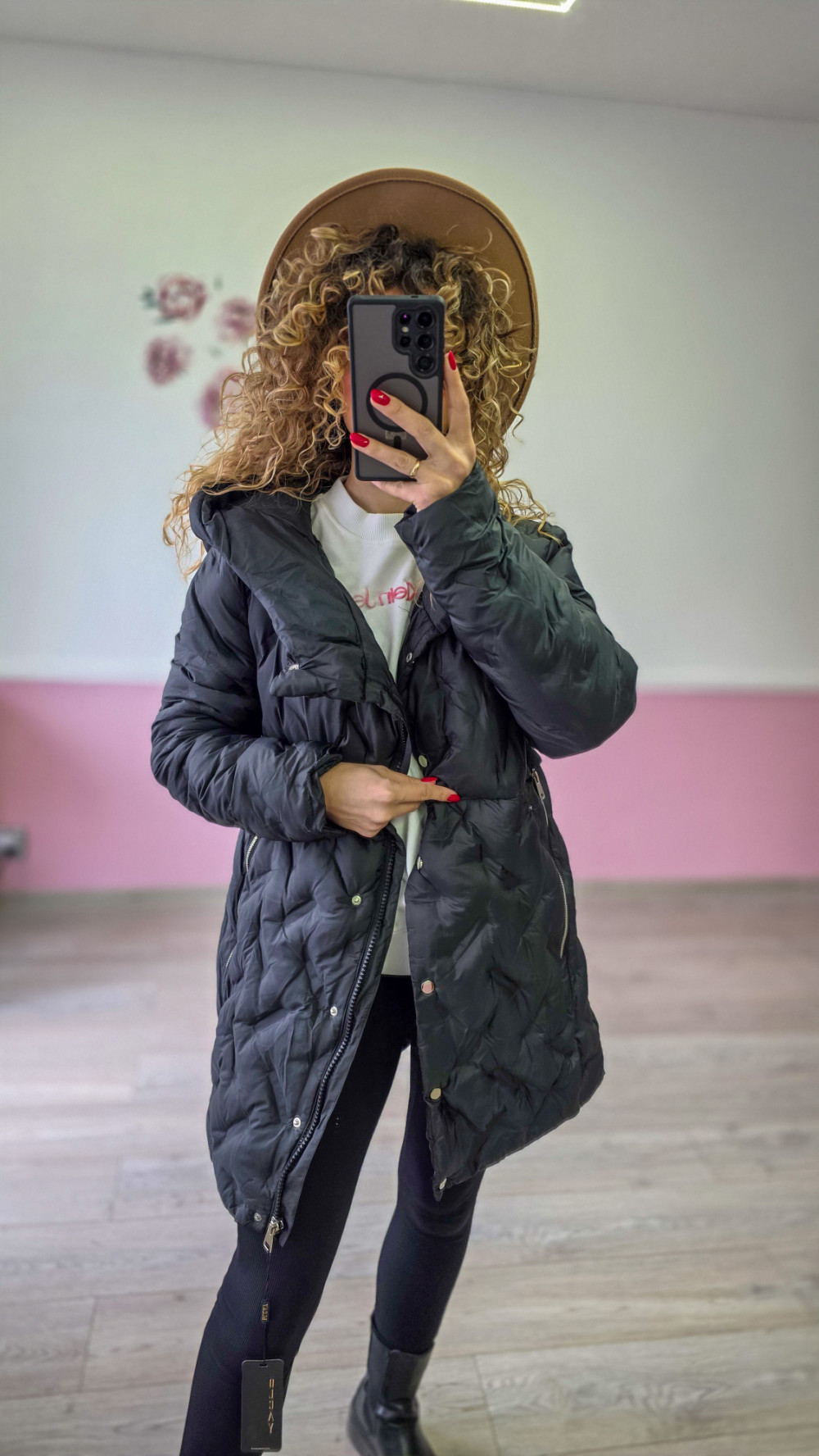 Czarna pikowana kurtka zimowa to idealny wybór na chłodne dni. Model wyróżnia się efektownym, nieregularnym pikowaniem, które nadaje mu nowoczesny i stylowy charakter. Kurtka posiada obszerny kaptur, praktyczne napy oraz wygodny zamek, dzięki czemu doskonale chroni przed zimnem i wiatrem.