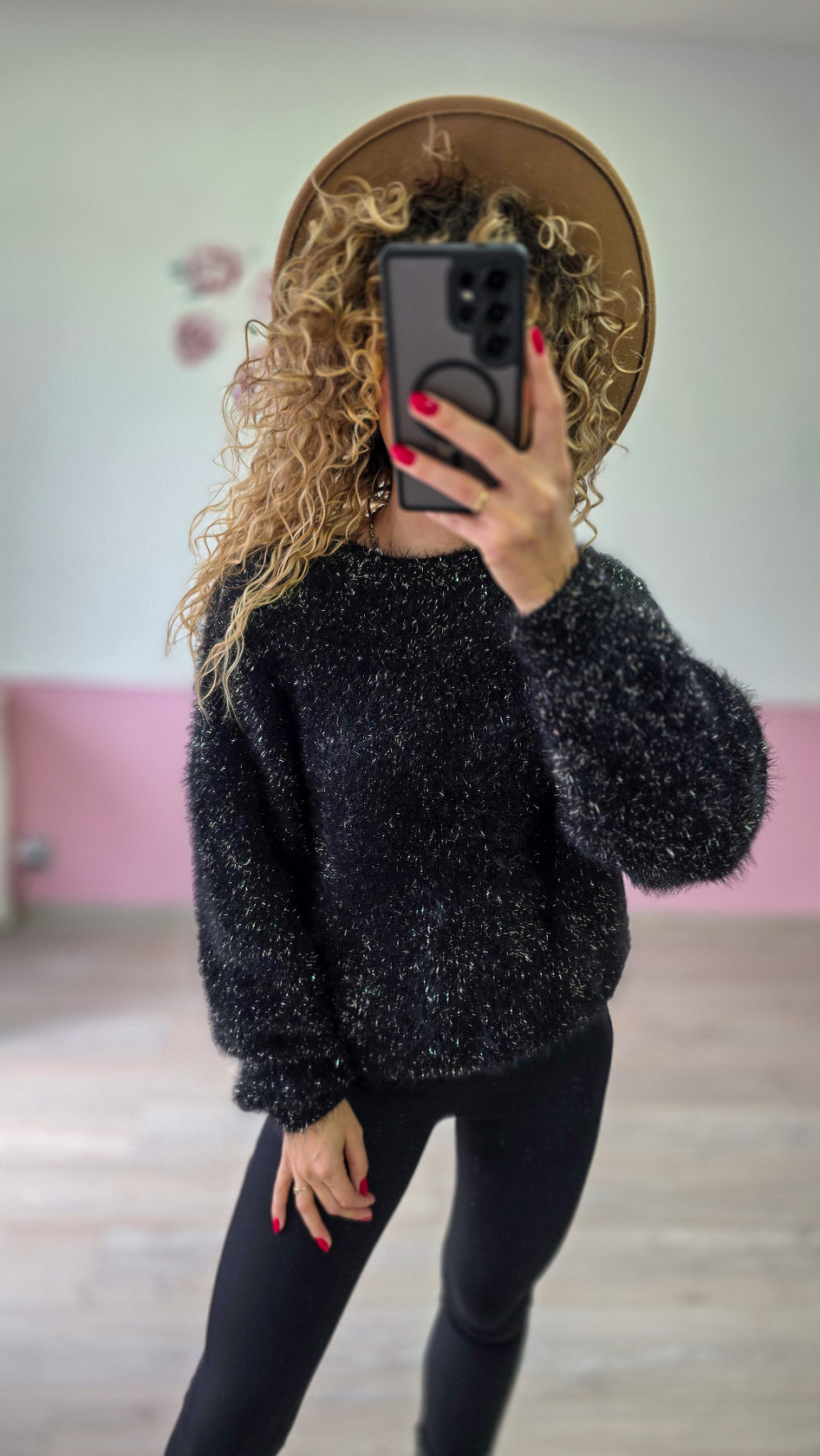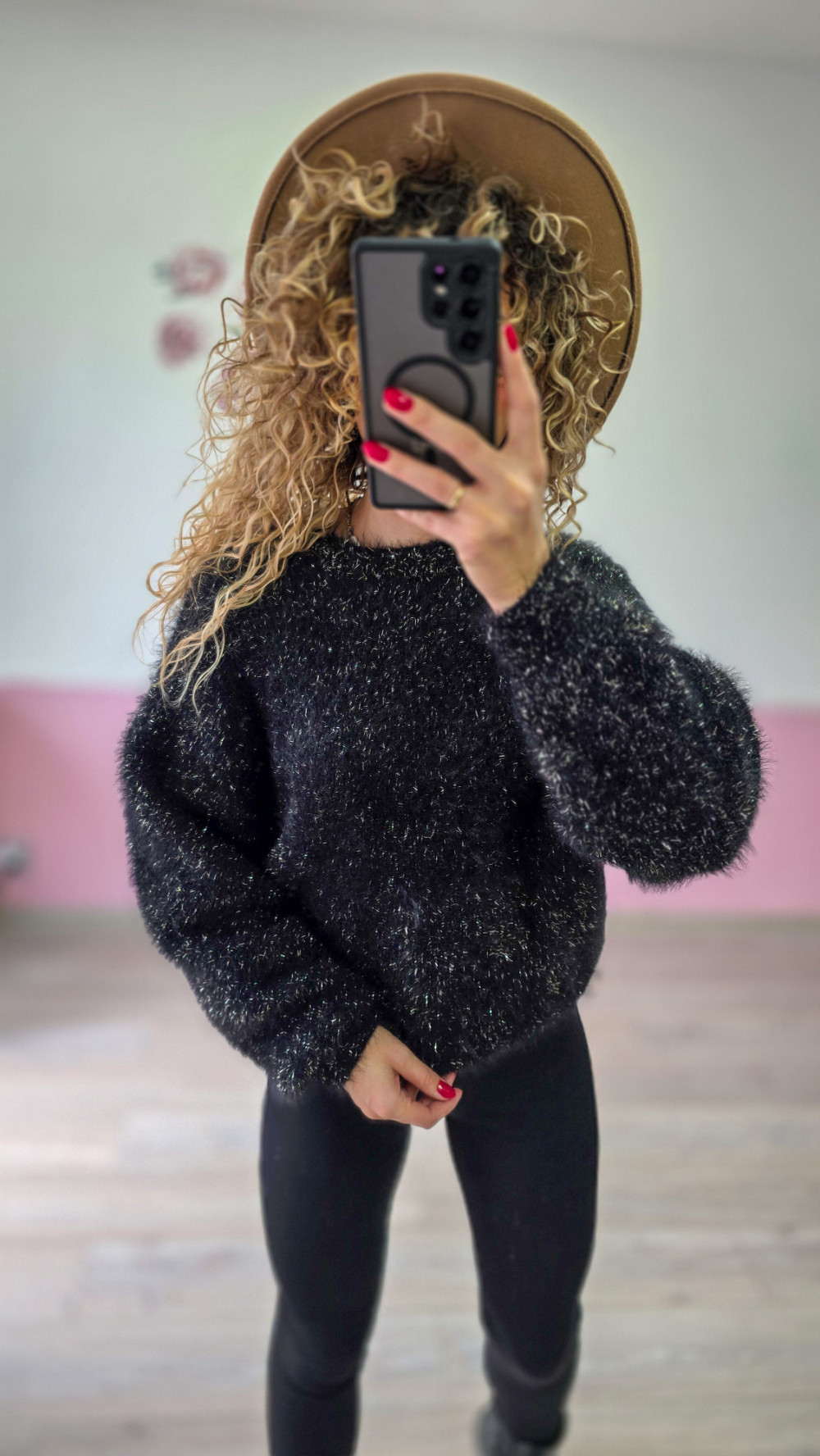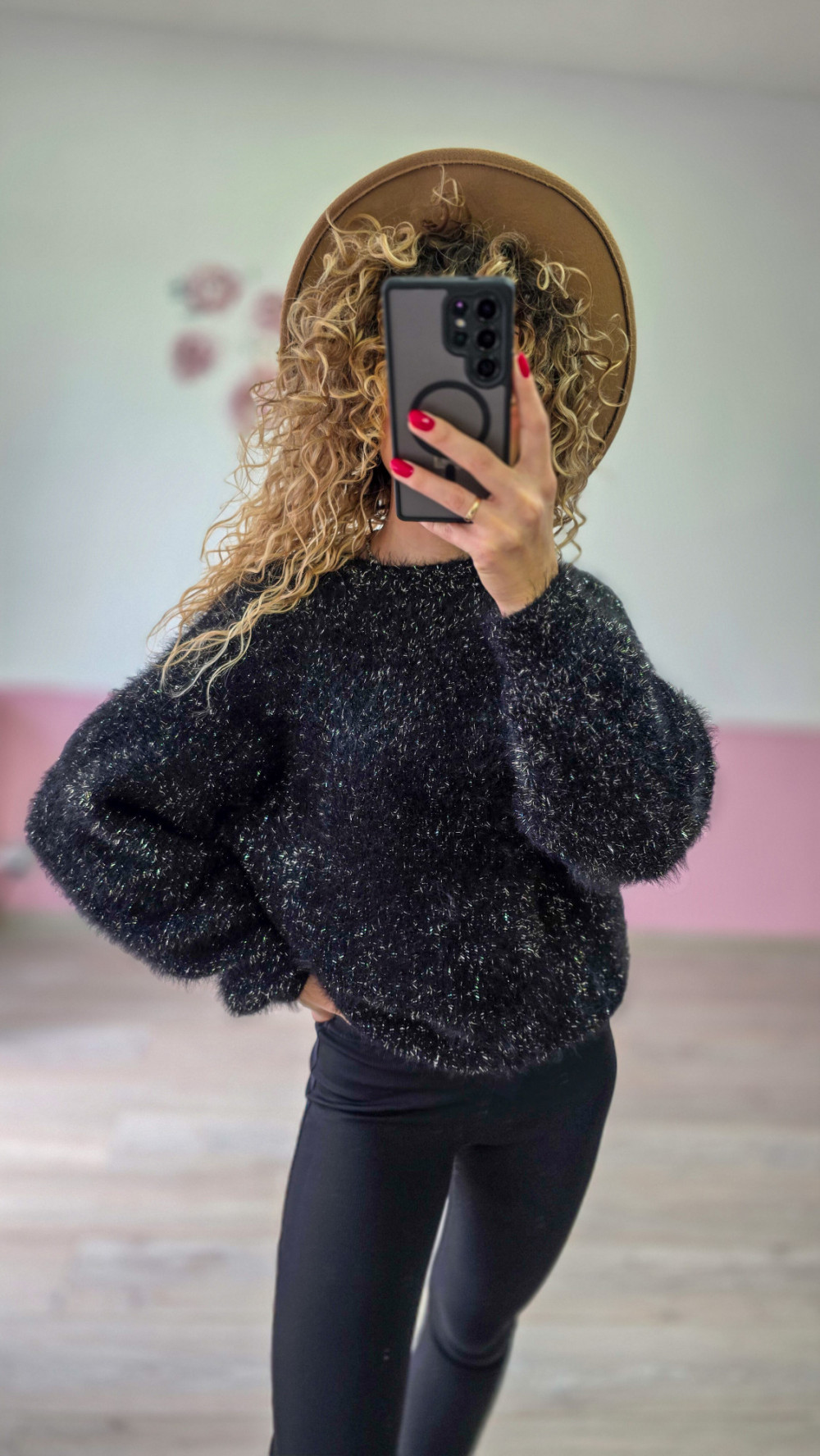 Ten czarny włochaty sweter to idealna propozycja na chłodniejsze dni. Miękki, puszysty materiał z połyskującą nitką dodaje mu wyjątkowego charakteru i sprawia, że wyróżnia się na tle klasycznych modeli. Sweter ma luźniejszy krój, dzięki czemu jest niezwykle wygodny i świetnie układa się na sylwetce.