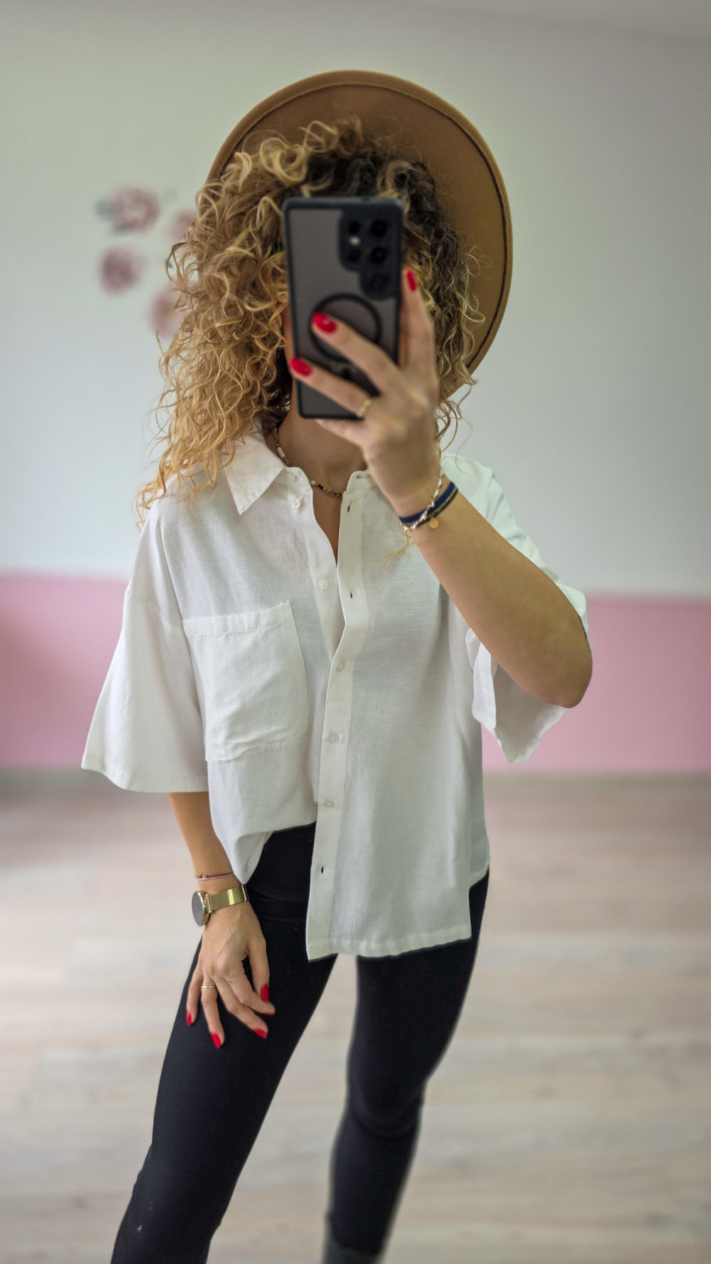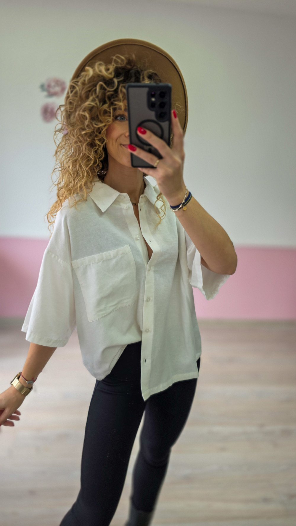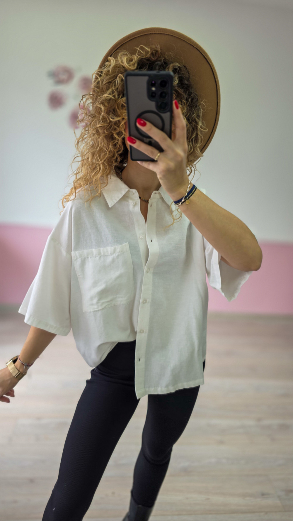 Ta biała oversize koszula z krótkim rękawem to idealna baza do codziennych, minimalistycznych stylizacji. Wykonana z lekkiego, przewiewnego materiału, zapewnia komfort noszenia przez cały dzień. Luźny krój gwarantuje swobodę ruchów, a klasyczny kołnierzyk oraz duża kieszeń na piersi dodają jej nowoczesnego, casualowego charakteru.