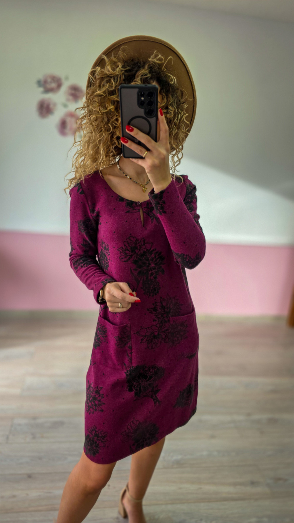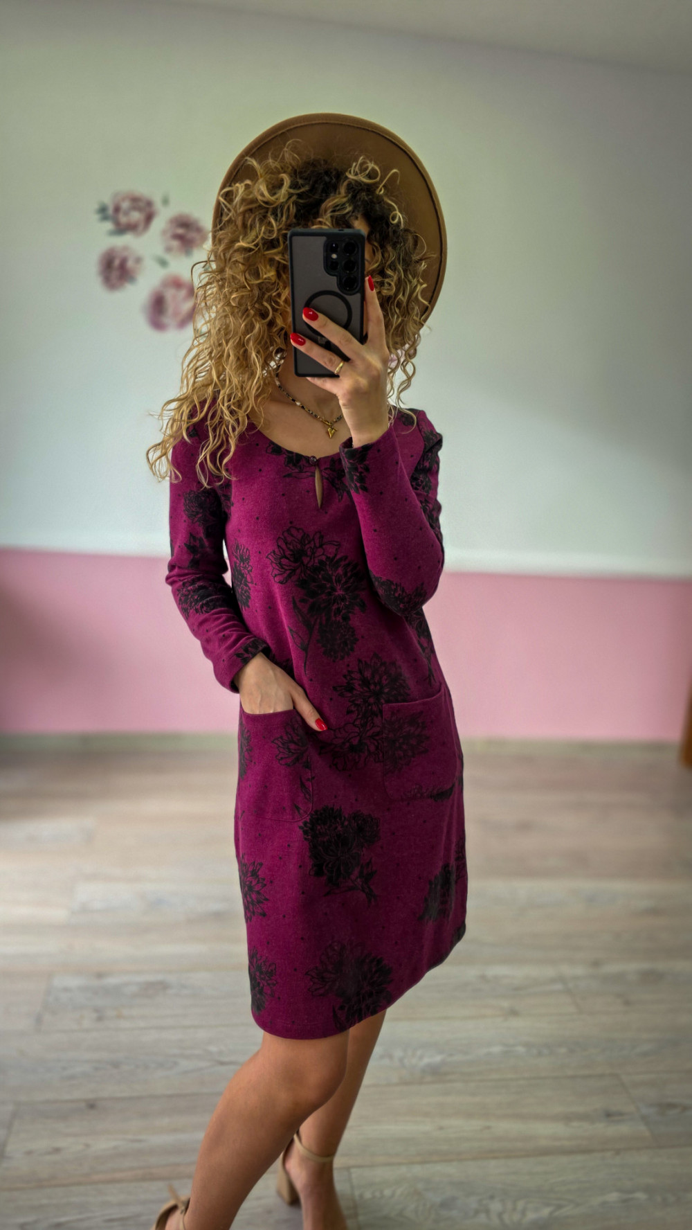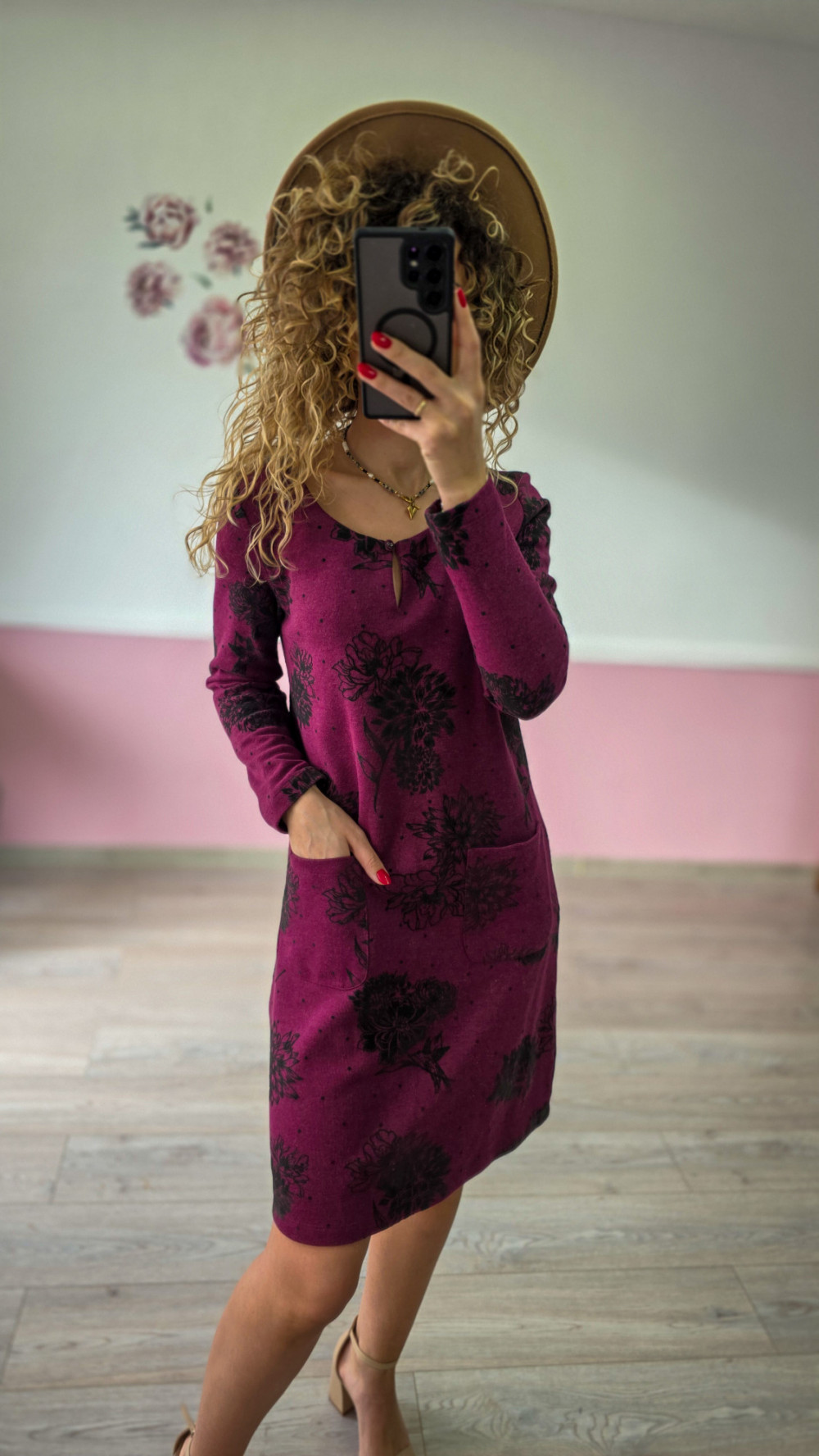 Ta bordowa sukienka z czarnym kwiatowym printem to idealny model na co dzień i do pracy. Wykonana z miękkiego, wygodnego materiału, ma prosty krój do kolan, długi rękaw oraz dwie praktyczne kieszenie z przodu. Subtelne nacięcie przy dekolcie dodaje jej delikatnego, kobiecego charakteru.