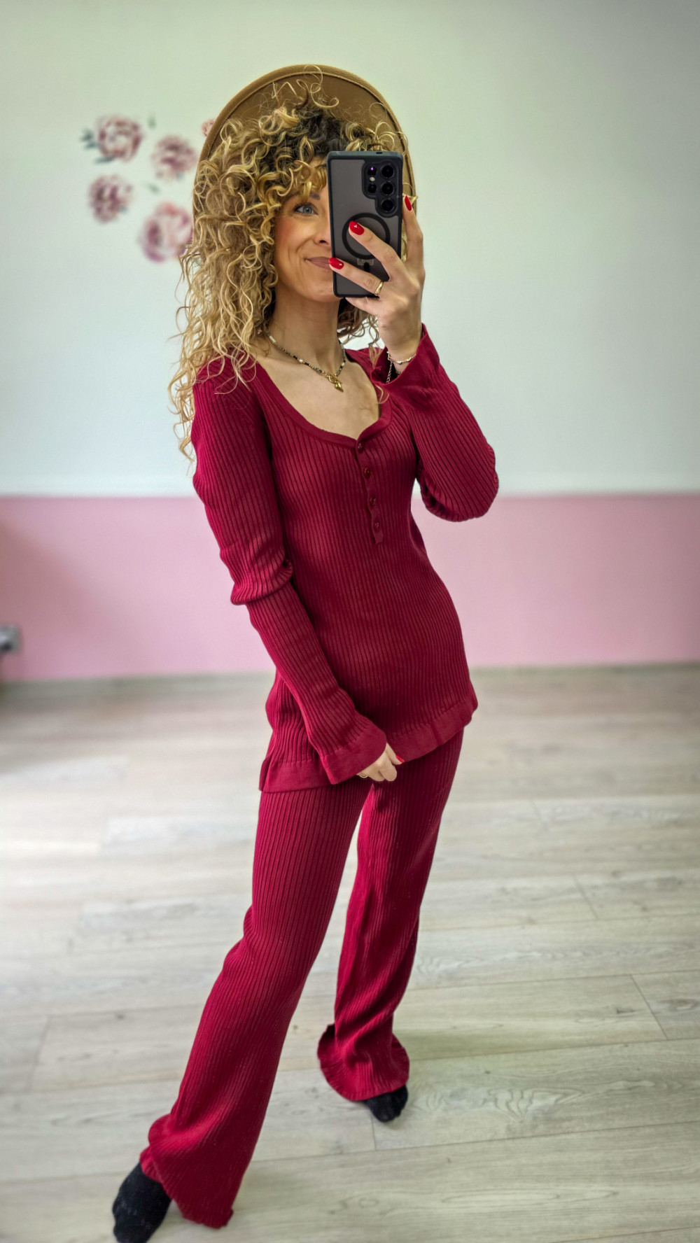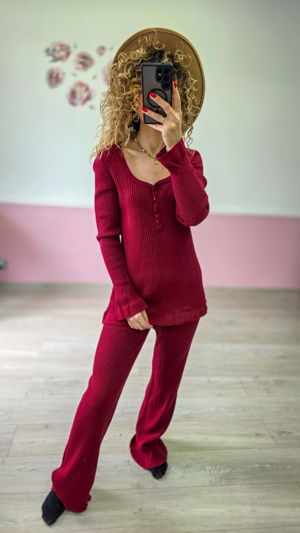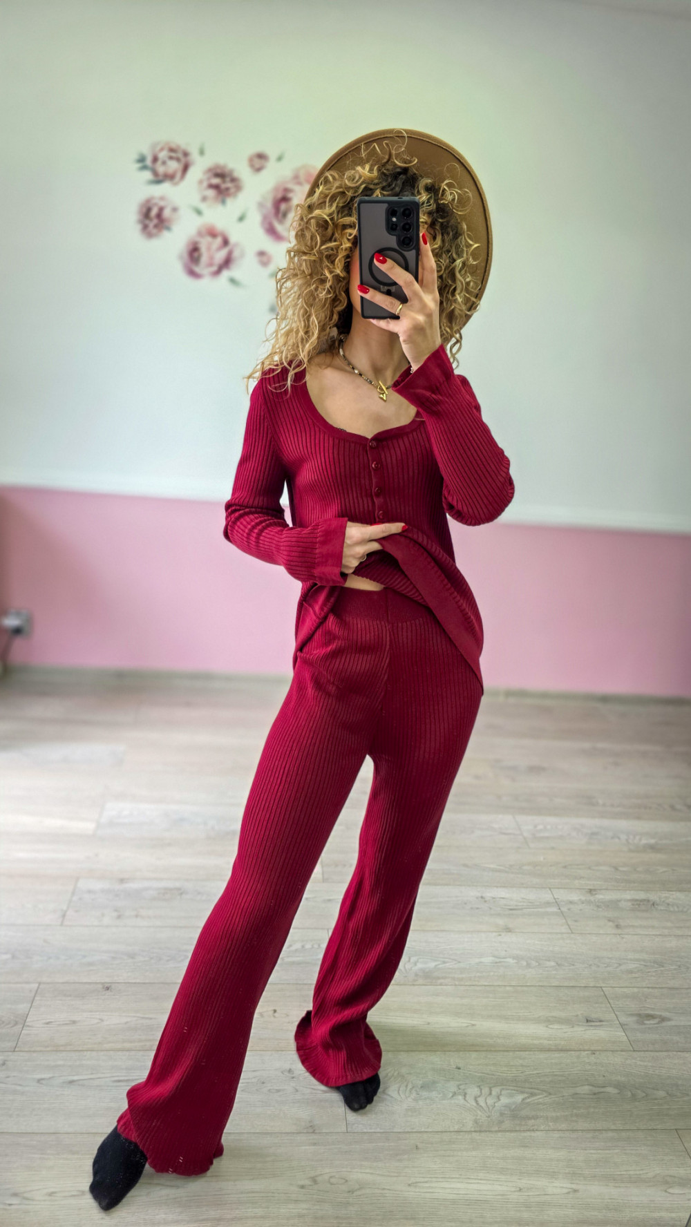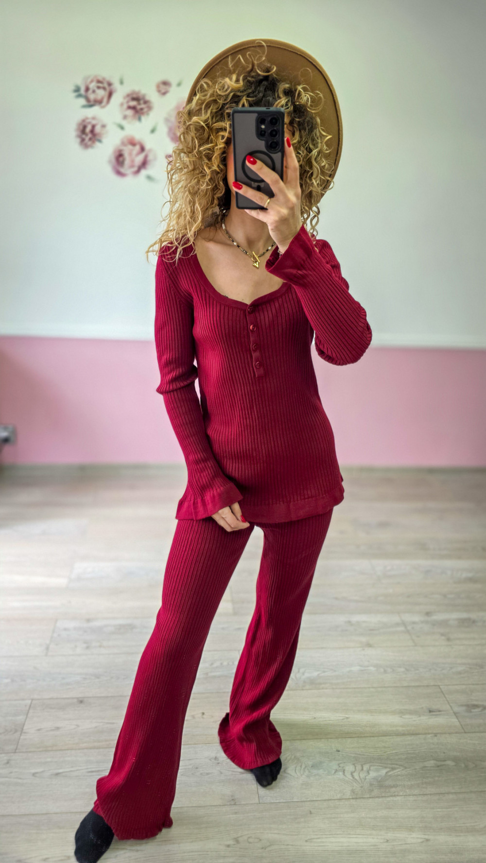 Bordowy dzianinowy komplet – prążkowany sweter + spodnie