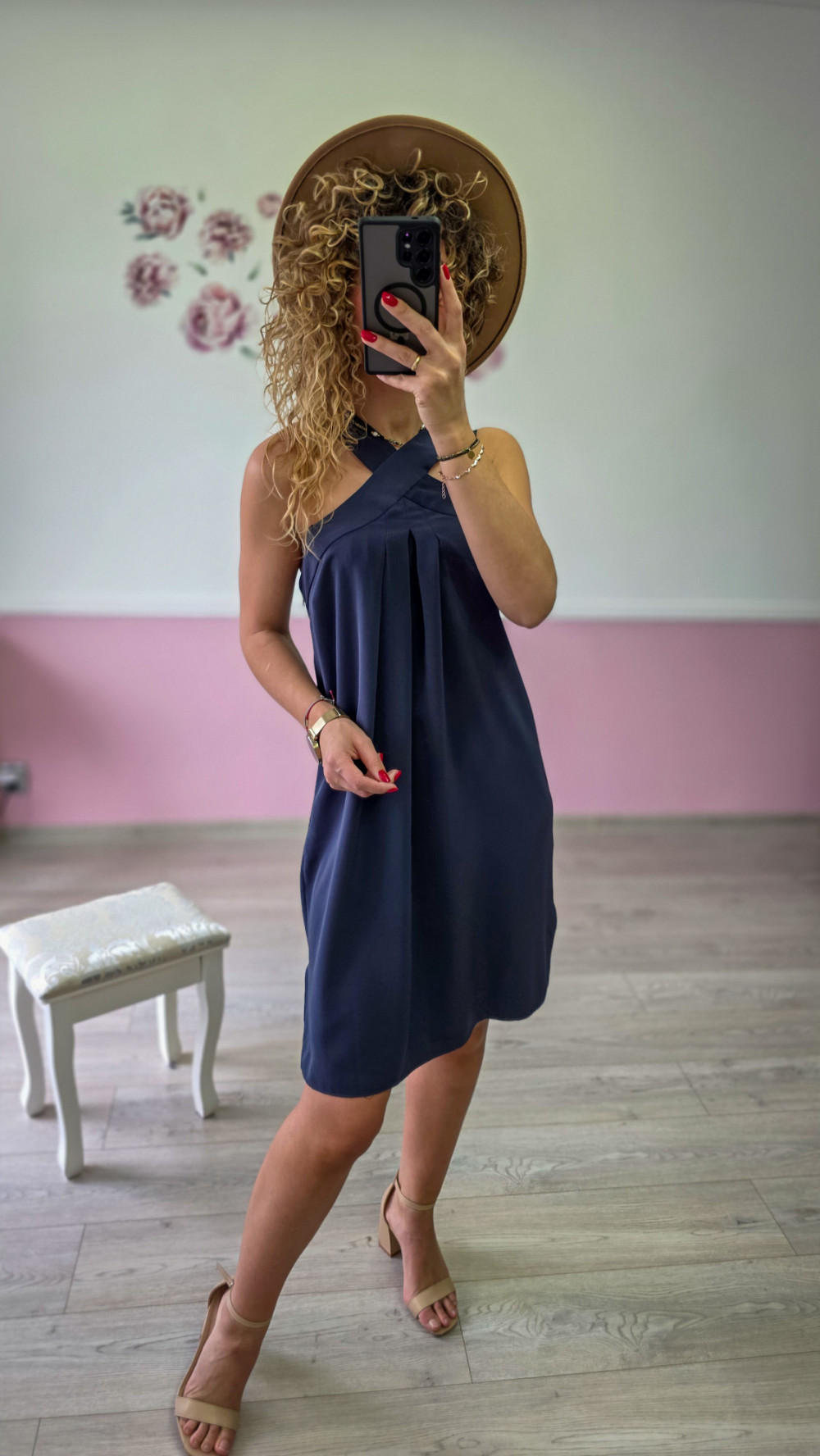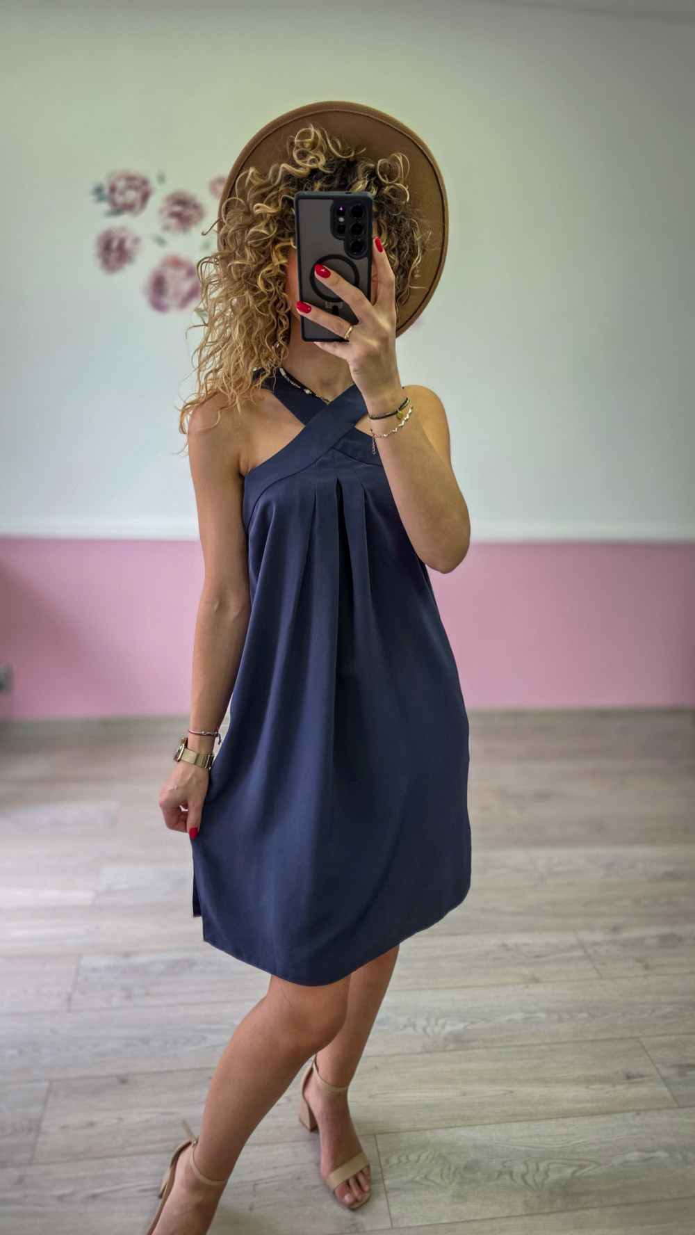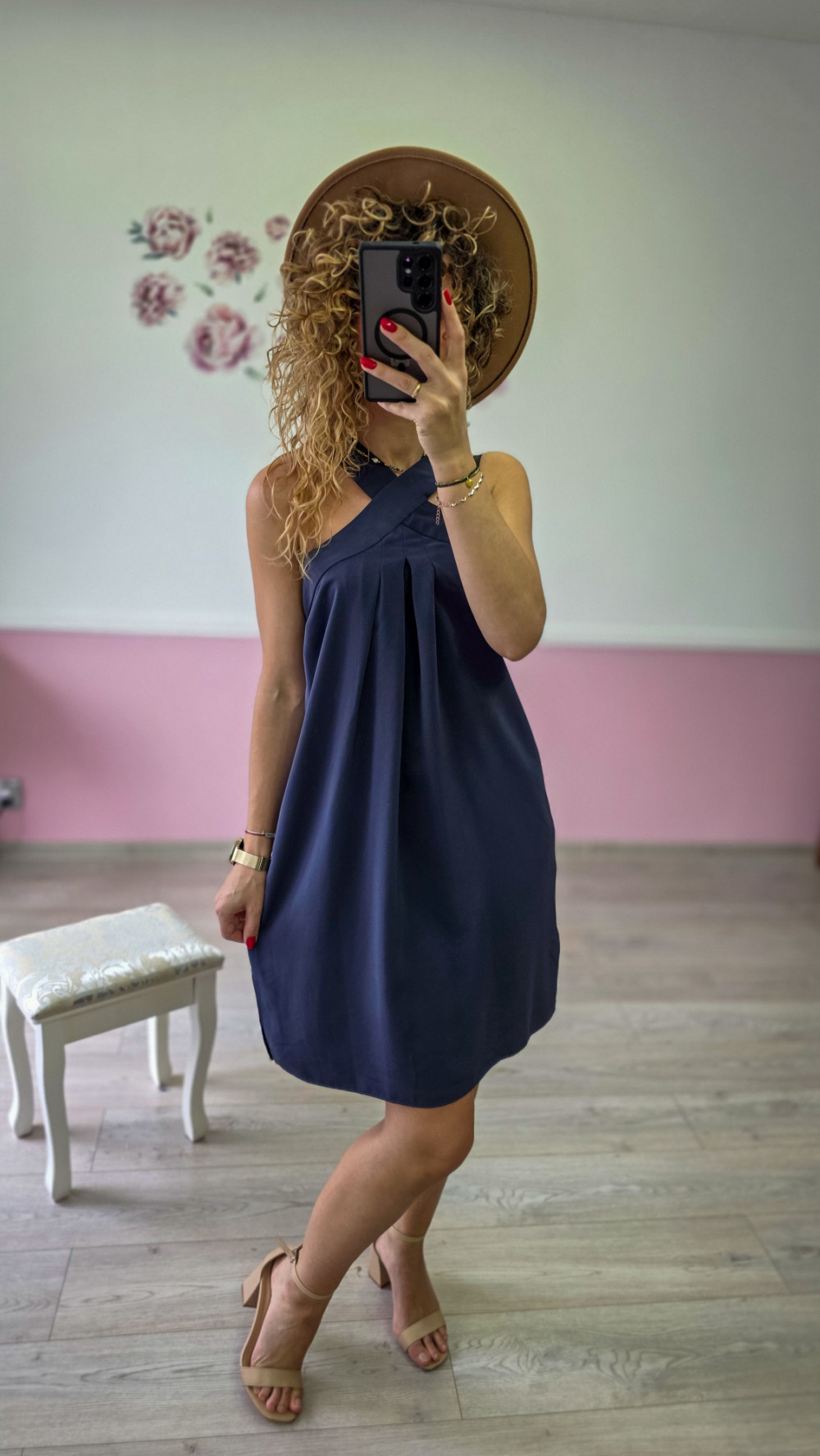 Stylowa sukienka o długości przed kolano, która zachwyca wyjątkowym dekoltem na krzyż. Takie wykończenie pięknie eksponuje ramiona i szyję, nadając całej stylizacji kobiecego, nowoczesnego charakteru. Luźny, swobodny krój sprawia, że sukienka świetnie układa się na sylwetce i zapewnia pełen komfort noszenia.