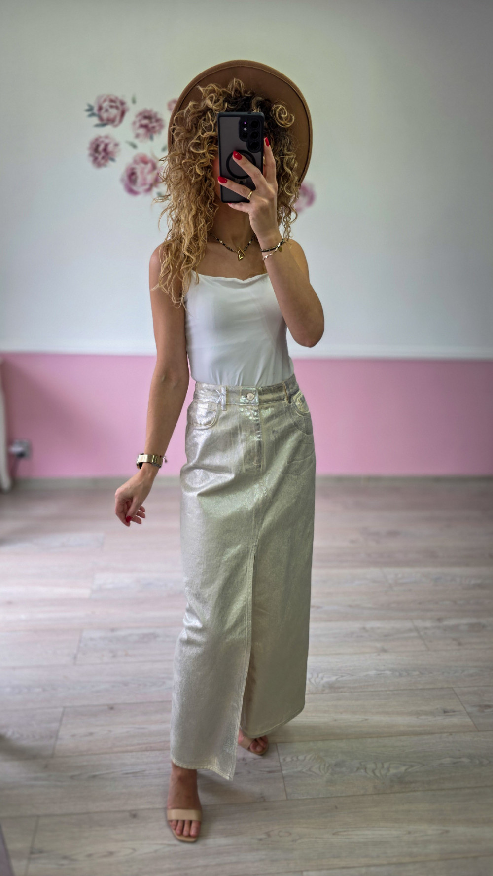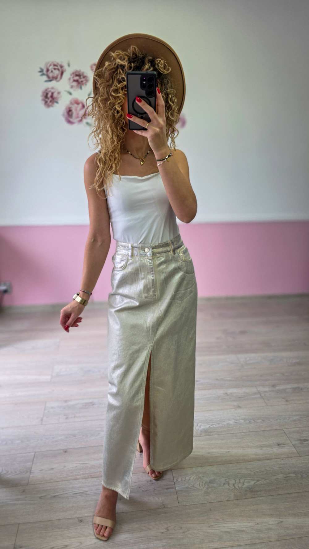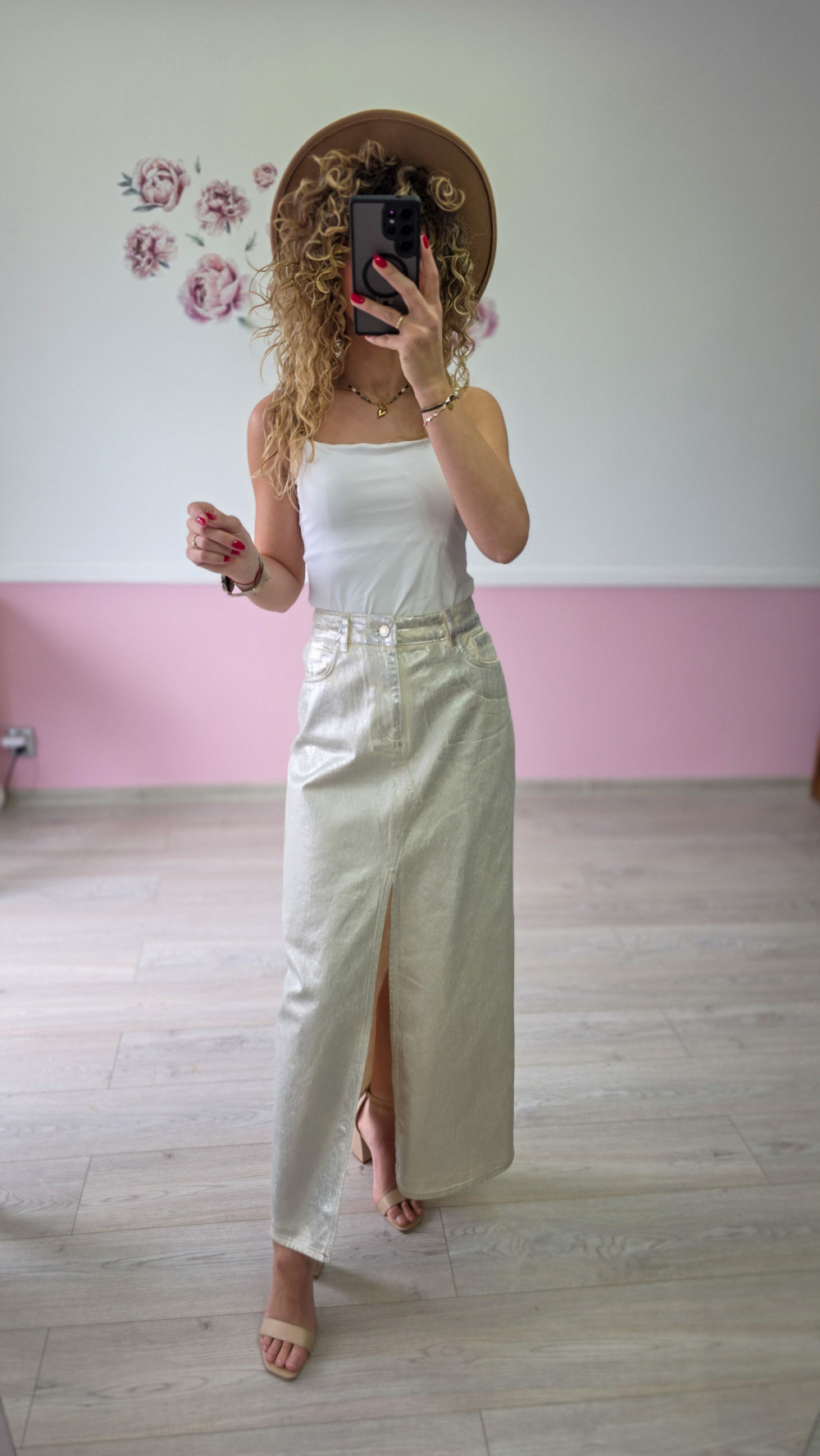 Jeansowa połyskująca spódnica maxi z rozcięciem – stylowa, kobieca i wyjątkowa S/M